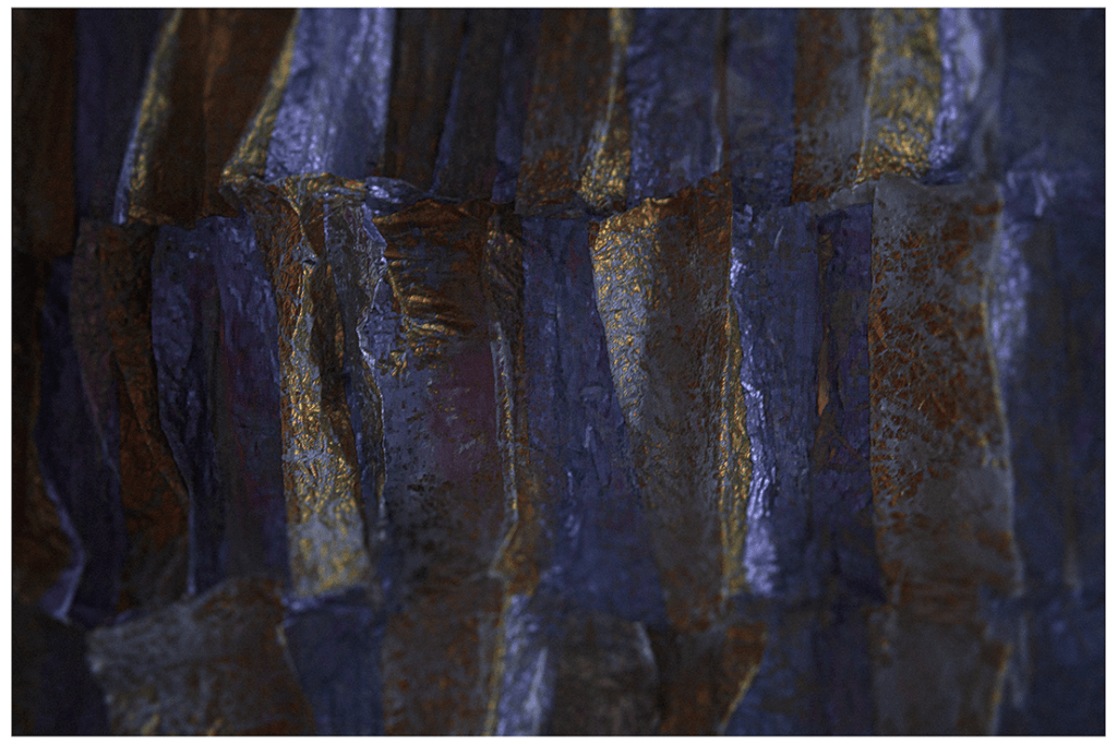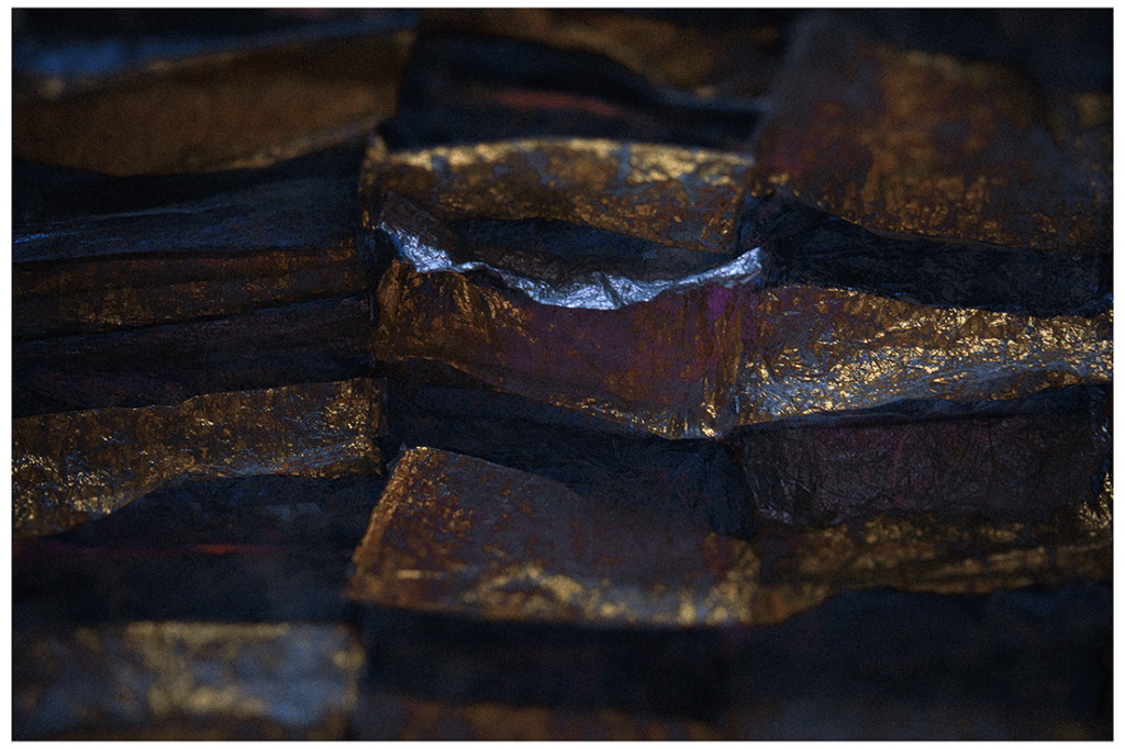 Whenever I pop over to visit my parents, I’m heartened by the small bowl of toffee eclairs on the table in the hall. On my way back out the door, I always pocket a couple to sustain me on my journey home. The toffees come wrapped in these blue and gold twists of metallicised cellophane, many of which have found their way into the washing machine. Once washed, these wrappers take on a very pleasing patina, exfoliated of much of their original gaudiness and turned instead into these rather more translucent, opalescent swatches. I wondered if I could assemble a few of the wrappers together to produce a very small scale homage to El Anatsui’s extraordinary tapestries-come-sculptures – our prompt for The Kick-About No.67.