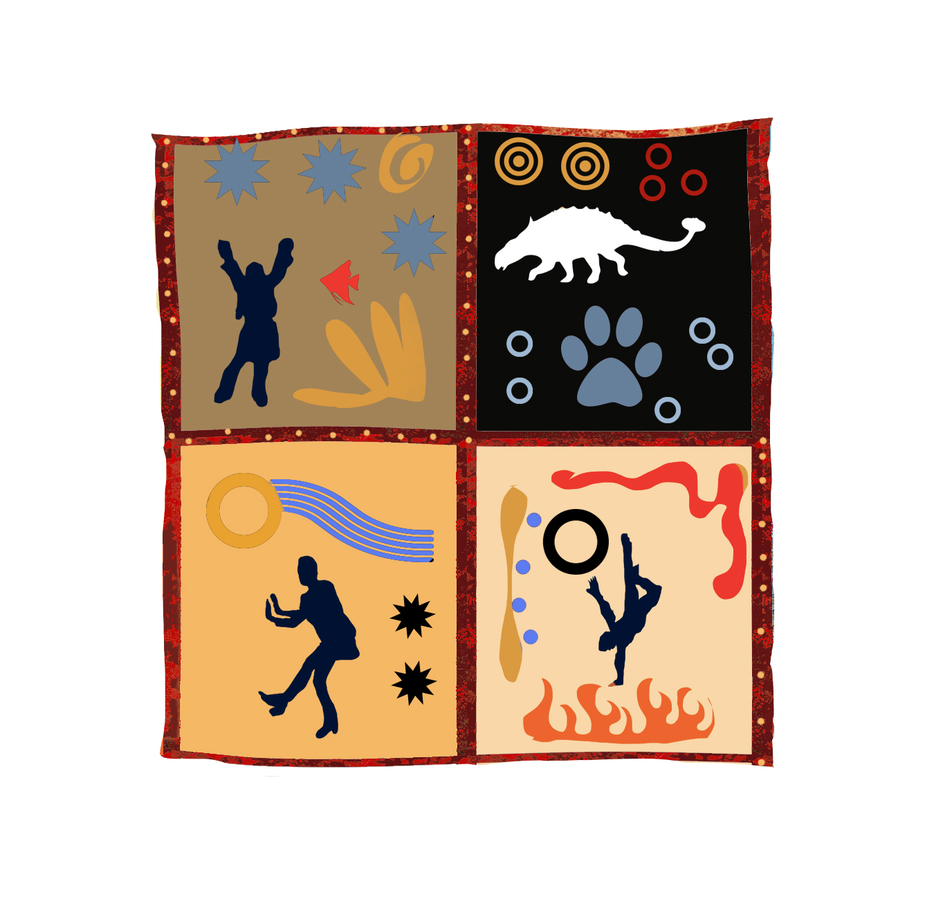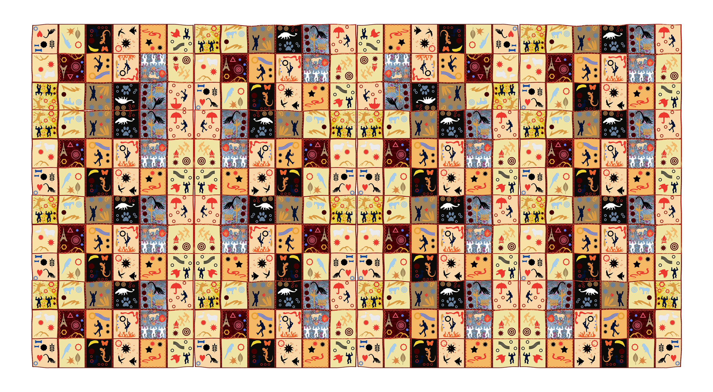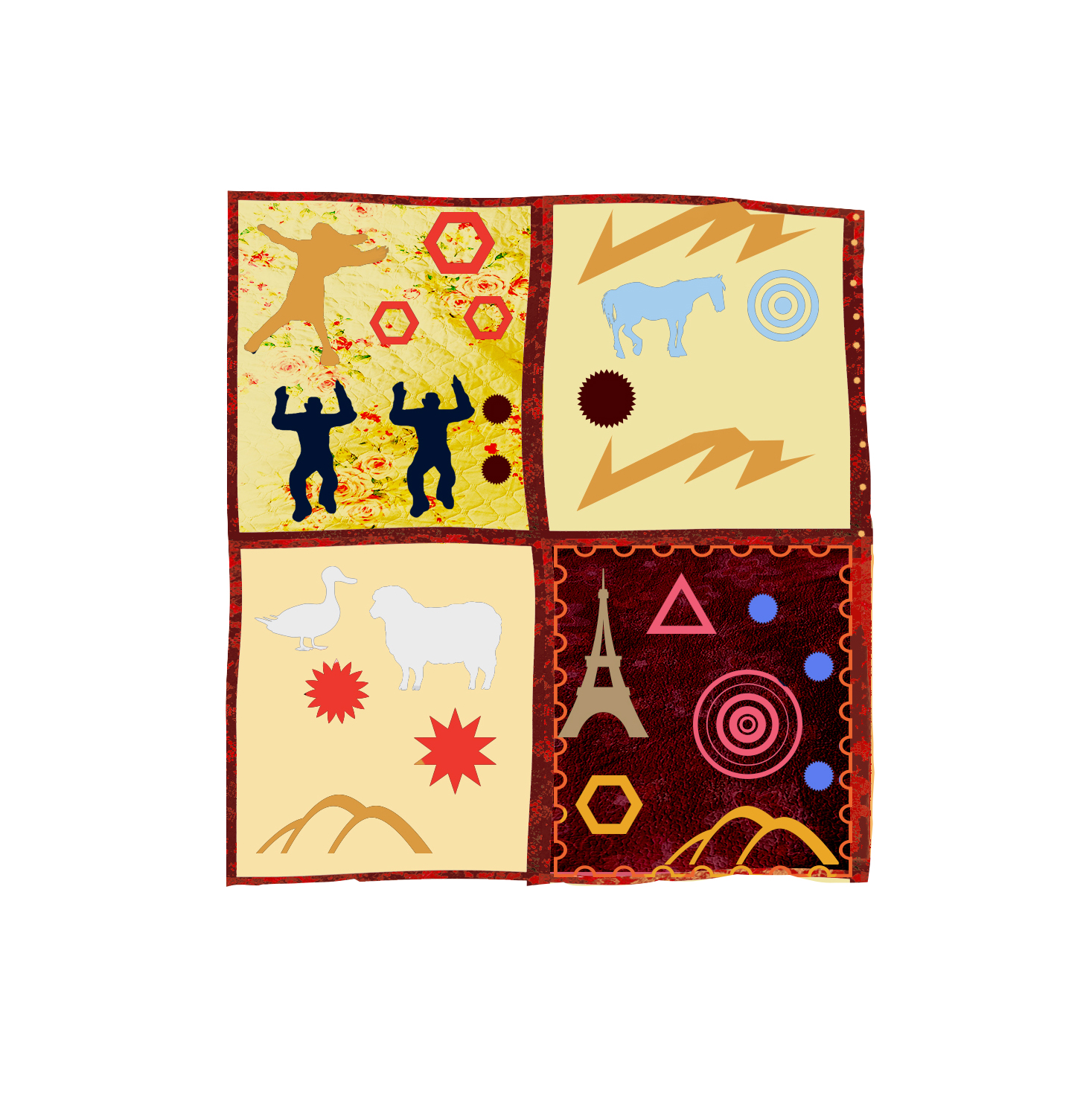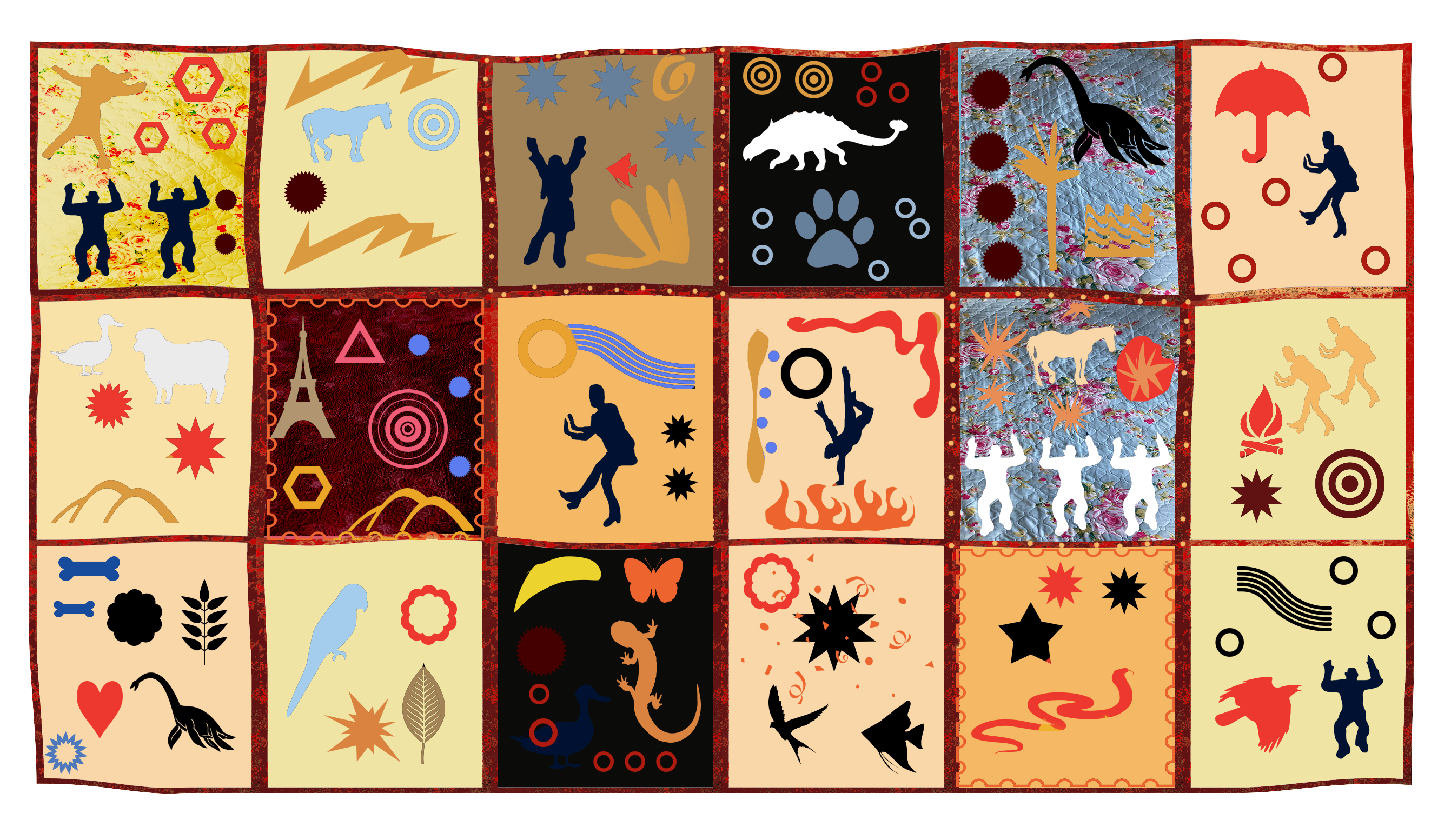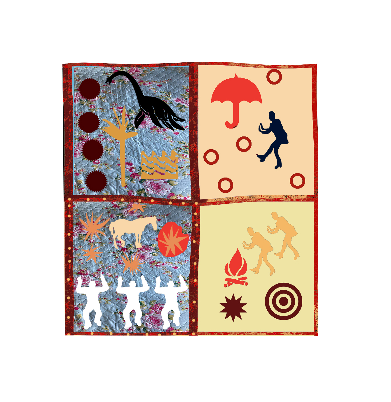 “I originally planned to rely solely on the images of the patchwork of childhood blankets and pillowcases, but sadly they are long gone. However, much like a patchwork, I decided to chop up various elements into a sort of hodgepodge – some from other sewn blankets found at my home in Ireland. and then adding little drawn elements over the top.”
