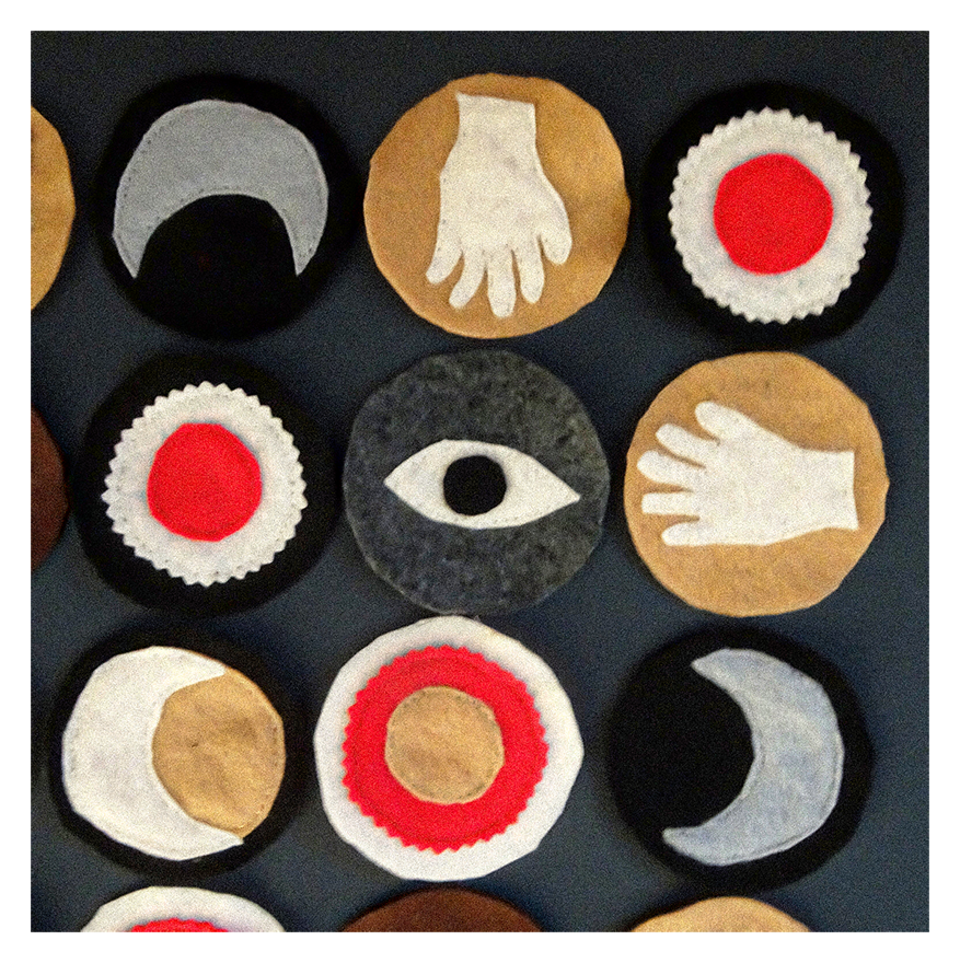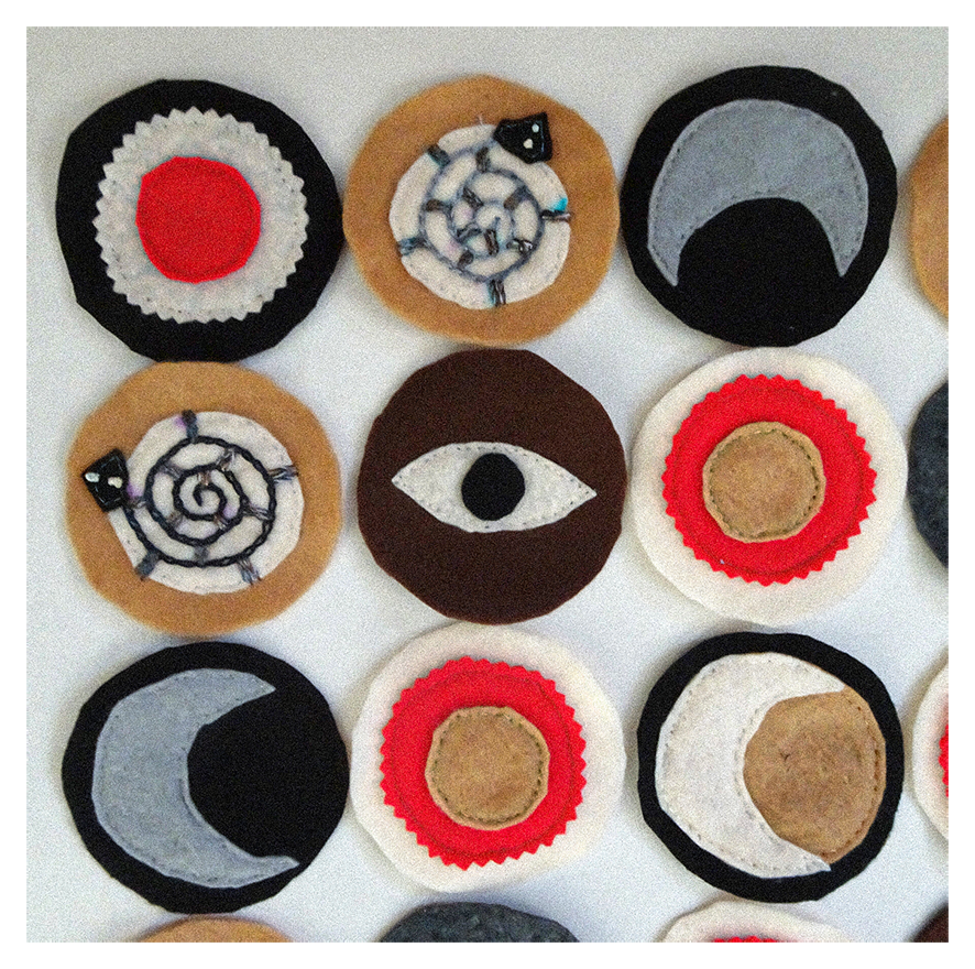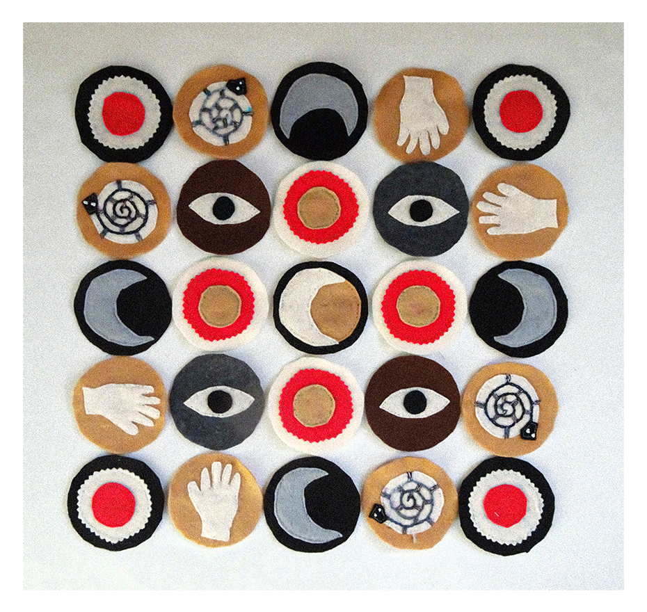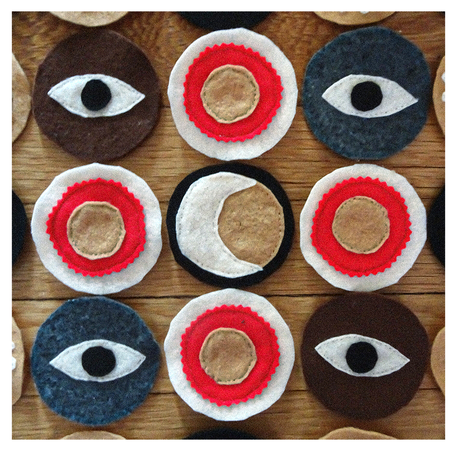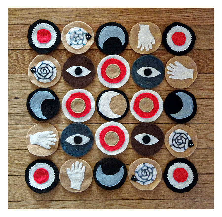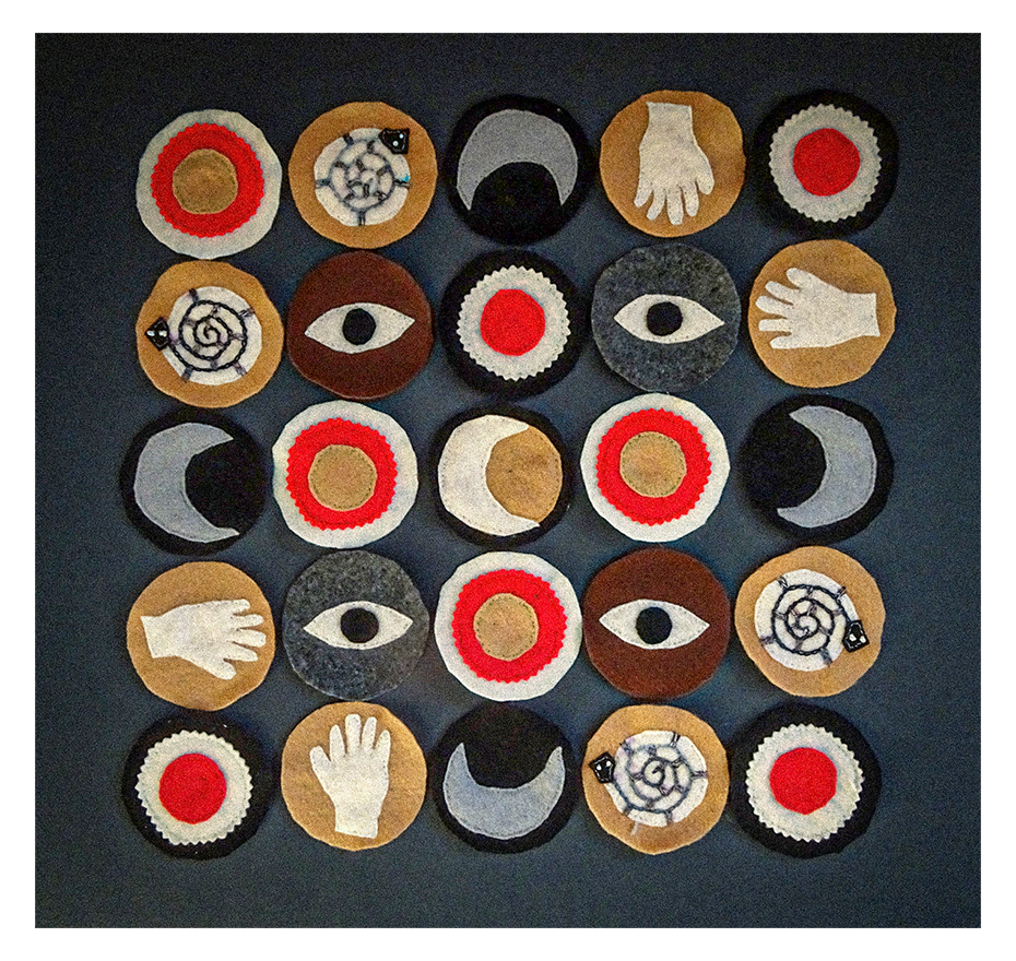 “I know these quilts, but I never examined them closely before. So little history about their making or their maker is available, but they speak loudly for themselves. I was immediately drawn to the symbols – “sun moon hand eye circle snake” – that would fit easily into a circular form. (The birds need their own story, which I had no time for this week.) I thought of Penny Rugs, made of felt circles, and put together a grouping of my own appliqued felt circles in the earthy colors of the quilts. I don’t have a large enough piece of fabric in any color at the moment to sew them on, but photographed them on three possibilities: white and black paper, and the wooden floor to represent the camel color. Each has its own feeling and I’m not sure yet what I would choose. With six words to work with, I meant to do a sestina, but only completed the first stanza. As so often occurs with my projects, to be continued…”