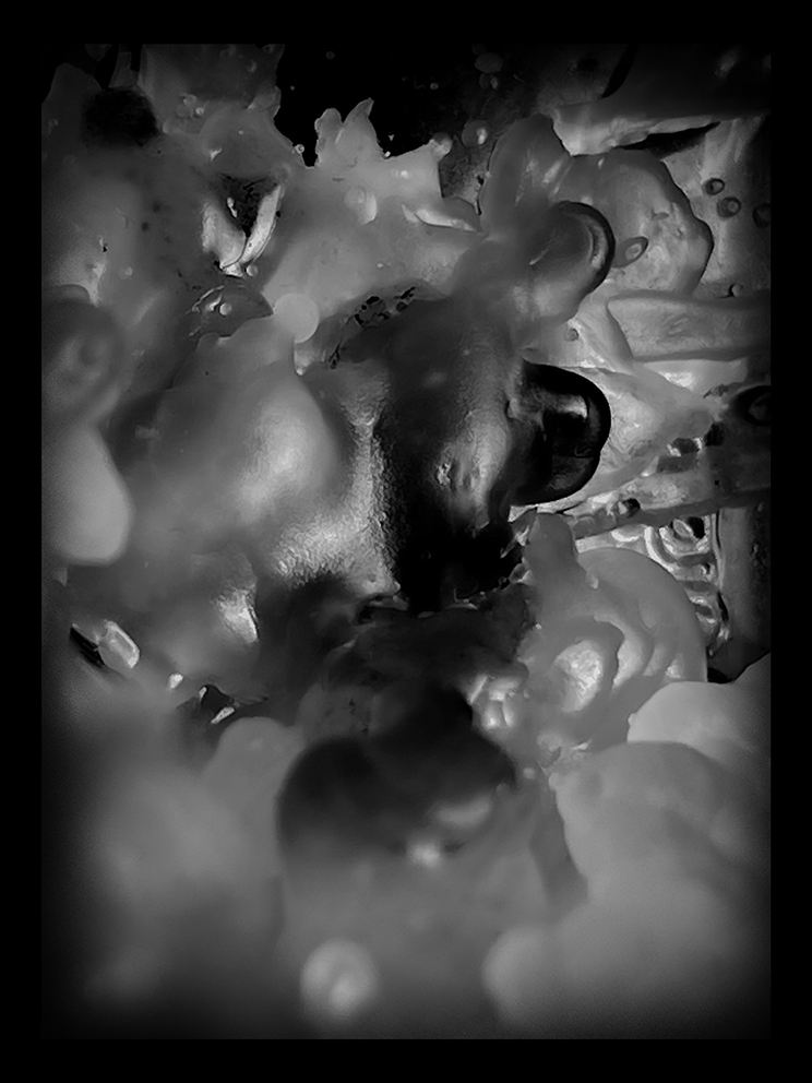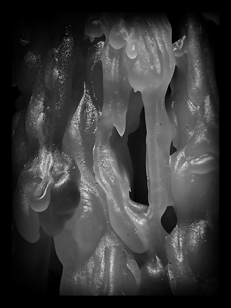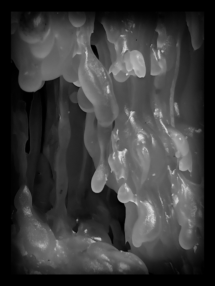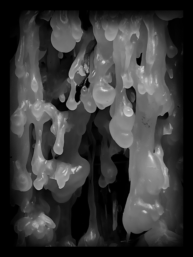 “I was reminded very much of the fluid melting magic of lava lamps and, in certain elements of Asawa’s creations, I envisioned eyes that reminded me very much of Hitchcock and Dali’s dream sequence in the film, Spellbound. My images were created from photographing melted wax accumulated on a wine bottle over a period of time, with a couple of videos of my own eyes overlaid on top to pay homage to that surreal dream sequence.”