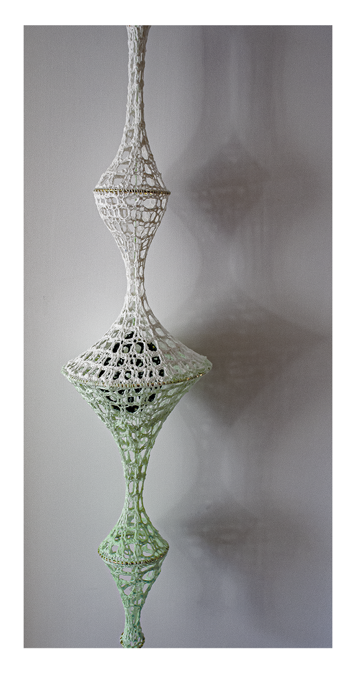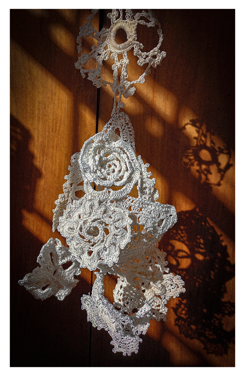 “I remembered I had made a lot of Irish crochet motifs over the years with wonderful designs from Irish patterns inspired by roses, shamrocks, ferns and leaves. I didn’t want to use PVA to stiffen them so I decided to weave some very fine wire around the edges so I could bend them into some unusual shapes. This proved a rather tricky business, but when I photographed them hanging in the sunlight they appeared like a small delicate chandelier.”