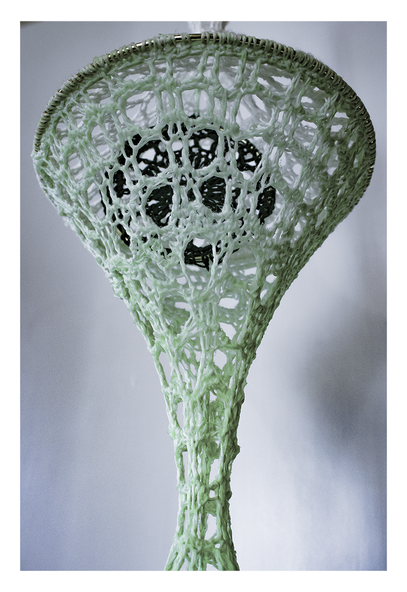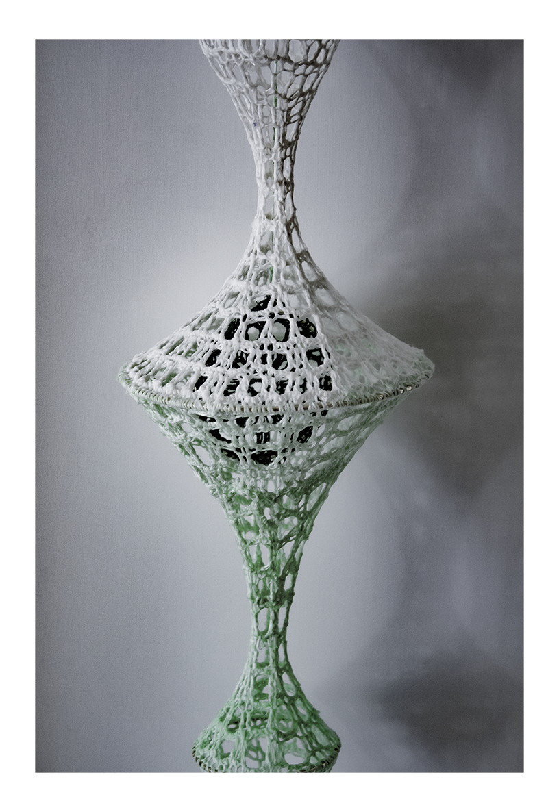 “I love the simplicity of line and strength of presence of Ruth Asawa’s work and have often thought about how you could achieve something similar. Asawa often uses wire to create shapes that are both sustainable and supported. I have used wire circles to support the main shape, then used balloons and pva glue to ‘encourage’ the crochet to resist gravity. I don’t know how long my ‘sculpture’ will maintain its shape – and next time I will spend more time on the mathematics of the shape before starting, rather than working it out as I go along. But, for all that, I have learnt a lot from this exercise and will certainly try it again.”