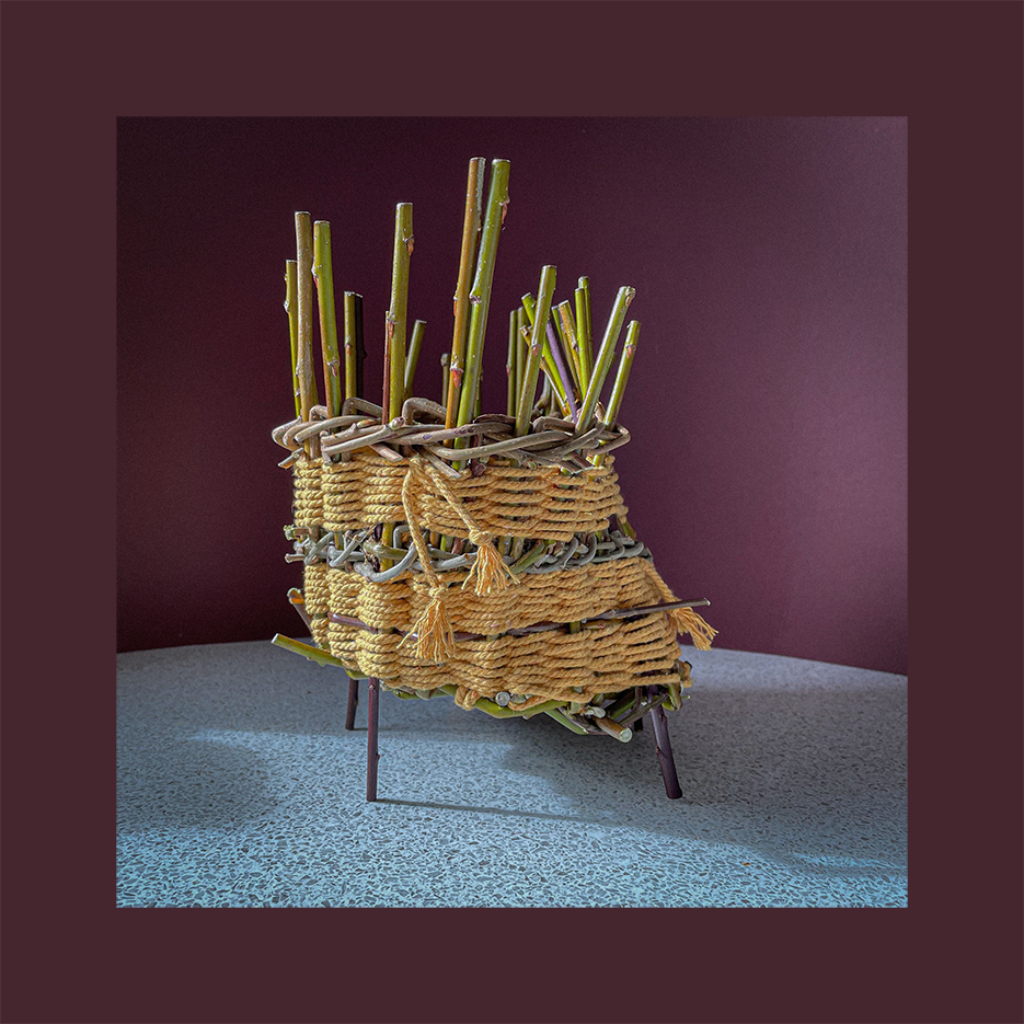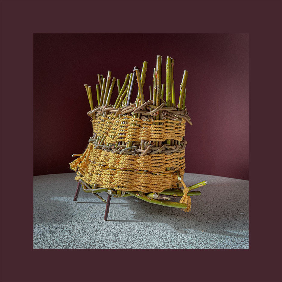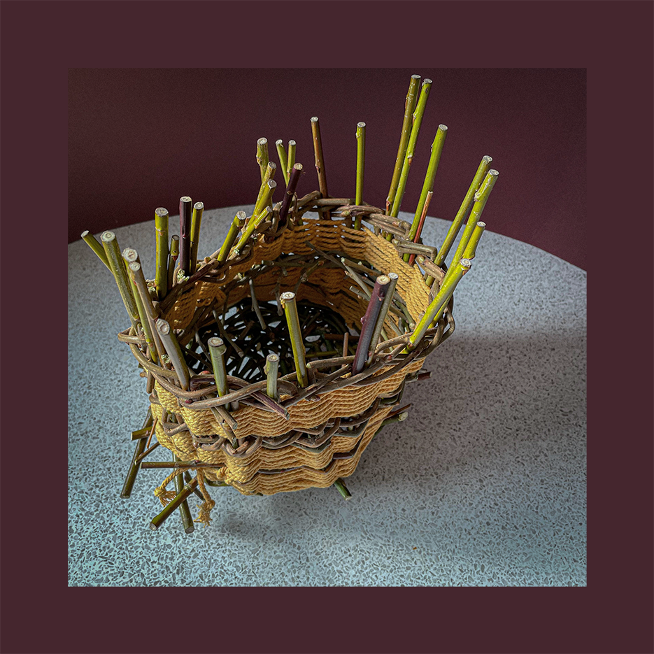 “Amazing that wire can weave such intricate organic forms and leave your 10 digits intact. Local resources return into play for KA#74; as Asawa suggests, play enough with one material and discoveries unfold. Struggles to sway a material to bend your way however, demanded an alternative for the side weave, and to the rescue old-fashioned macrame 3mm cotton-wool twist, adding a pleasing colour. Not a basket for much more than Italian Grissini, but, as a lover of all things Italian, that’s just fine by me.”