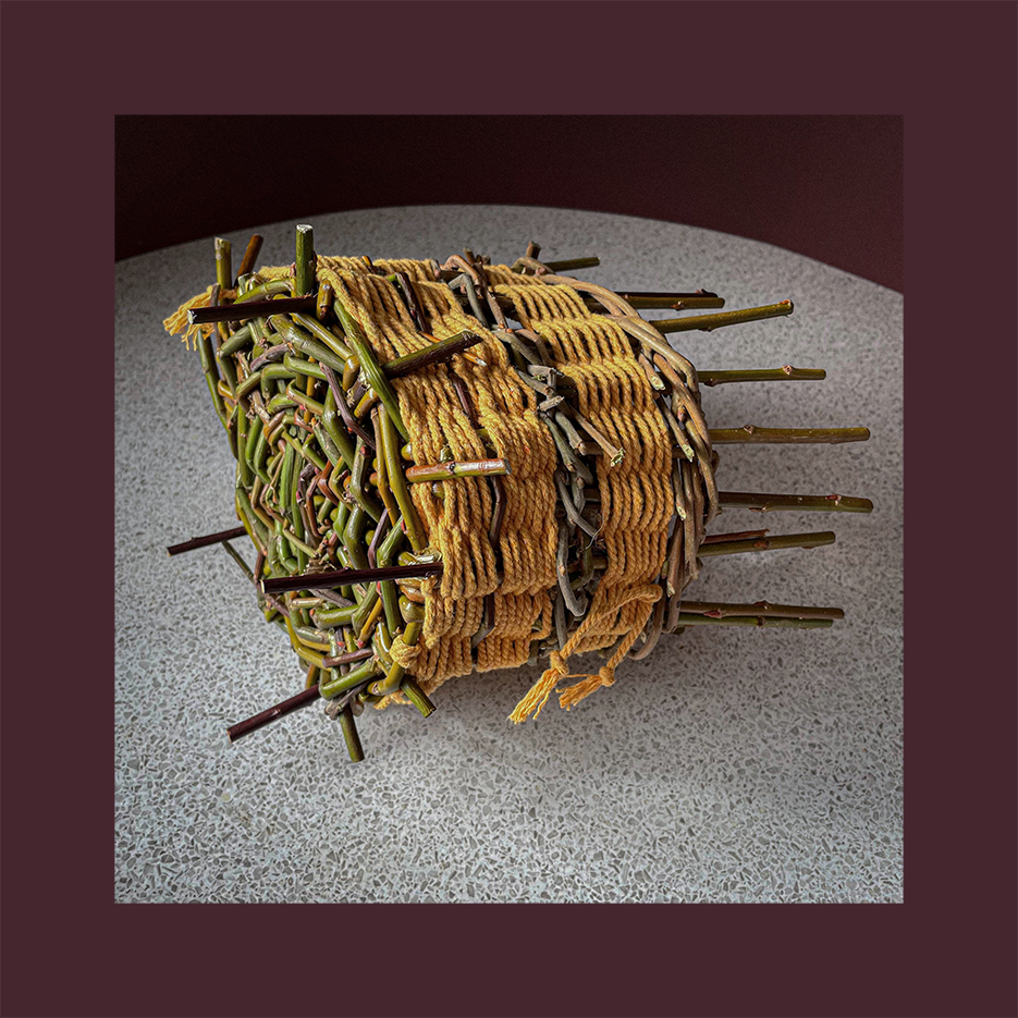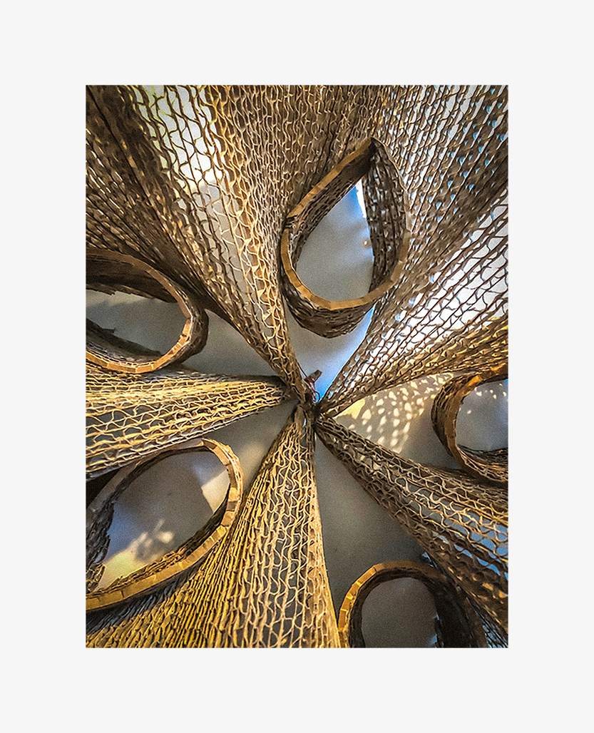 I have included in the images a piece I had already started – Pod – and some experiments I have been meaning to do for a while. There is an enormous Cordyline palm that grows in my garden I brought from London nearly 30 years ago as a seeding, which I’d nurtured. It has flourished, so much so it strews plentiful dead swathes of its fronds everywhere. It occurred to me last year that, apart from burning them, I could make use of them, so bundles were made as a temporary fencing, but more kept falling. I started to collect them and strip them apart as they naturally disintegrate into thin strips. It was a bit like making daisy chains as a child, easing holes that became wider to be able to thread them and so on. Soaking them made them more malleable but still tough when I tried to crochet, as Ruth Asawa had done with the metal wire. That was very tricky and needed more time to soak and make them softer to handle… however tiny nests for tiny birds appeared anyway.”