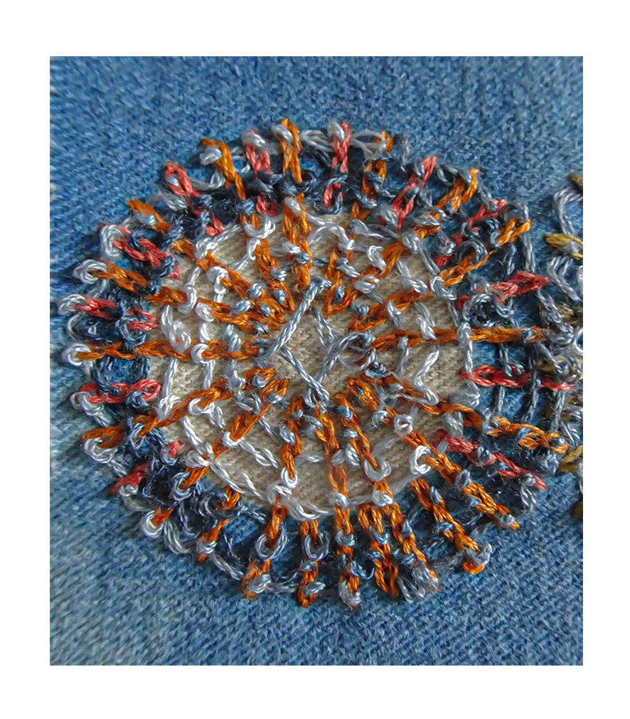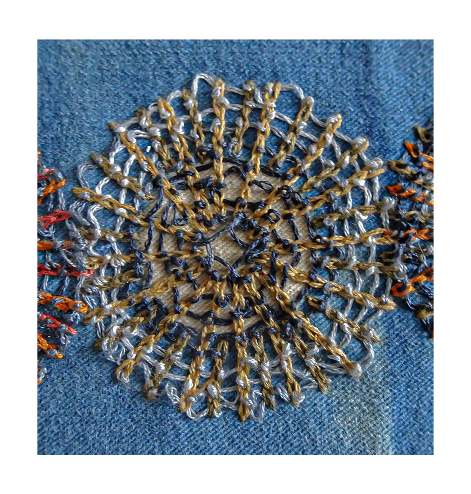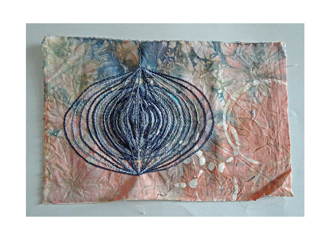 “I went back to my tiny shibori fabric pieces and first did three circles trying to imitate her looped baskets. I think these were pretty successful. Then I attempted to layer circles in chain stitch to reproduce the effect of her hanging circles within circles. I think it might have worked better if I had used one strand of floss instead of two. But even if it doesn’t resemble Asawa’s layering that closely, it’s an interesting idea for future embroidery explorations.”