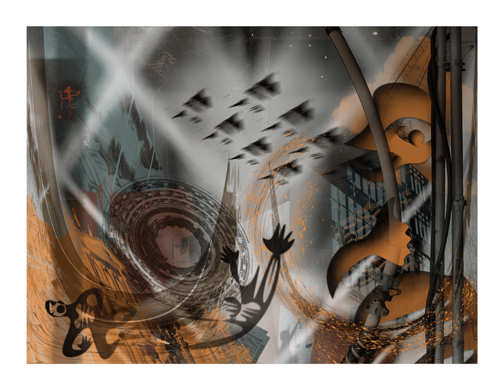 “Charles Sheeler created great strongly composed images. So I took off with my camera around Brisbane city and really didn’t take any inspired pics. I did take some textures; a couple were of grey black hoardings on a building site, which I overlayed with a shadow (reversed to be white) of a collapsible clothes dryer. This combination looked like search lights over a ‘war sky’ whatever that is. Thus I lost sight of Mr Sheeler and fell down the war rabbit hole – in Australia there has been so much news coverage about defence spending and new nuclear powered subs – having trouble with government’s spending of tax payer’s money on weapons, while our less wealthy citizens go homeless. Any how, I kept layering parts of my city photos and distorted or modified them and finally added a couple of quick Illustrator drawn figures.”