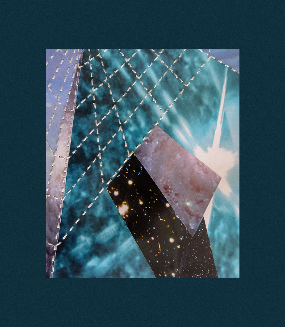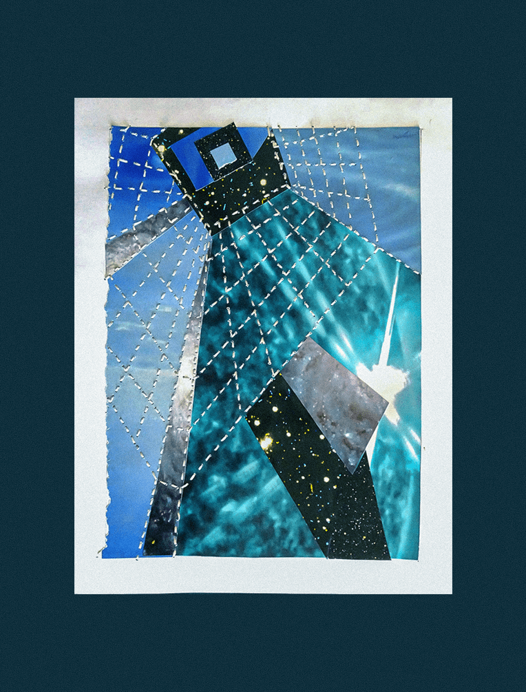 “I was immediately drawn to Sheeler’s Against the Sky a Web has Spun, as much for the title as the painting. I made a cosmic collage, simplifying the forms, and embroidered a web on top, then wrote a short poem to accompany it.”