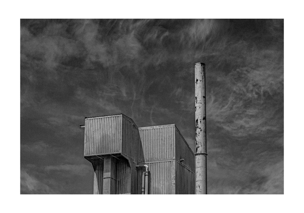 “One of the things guarding against the prettification of my home town is the presence of an aggregate factory slap-bang in the harbour. With Sheeler’s flattened abstractions in my sights, and likewise his use of colour, I went out to photograph the factory buildings, with the idea of collaging them, so moving quickly beyond this first act of recording them. Whitstable is celebrated for its skyscapes. and on this day, the clouds were so much lace and the light was pin-prick clean. Had my camera been old school, I’d have anyway plumped for a polarising filter by which to pull more drama and detail from the clouds; in the instance of these images, I polarised my images in post and licked my lips as the skies offered up all this tonal range and texture. The dystopian vibes of these photographs diverge at once from Sheeler’s calming expressions of modernity; my photographs remind me of sets from science-fiction movies; they’re all a bit Metropolis and I don’t mind saying I’m very happy about that. I walk past this factory all the time; it’s never felt this cinematic before.”