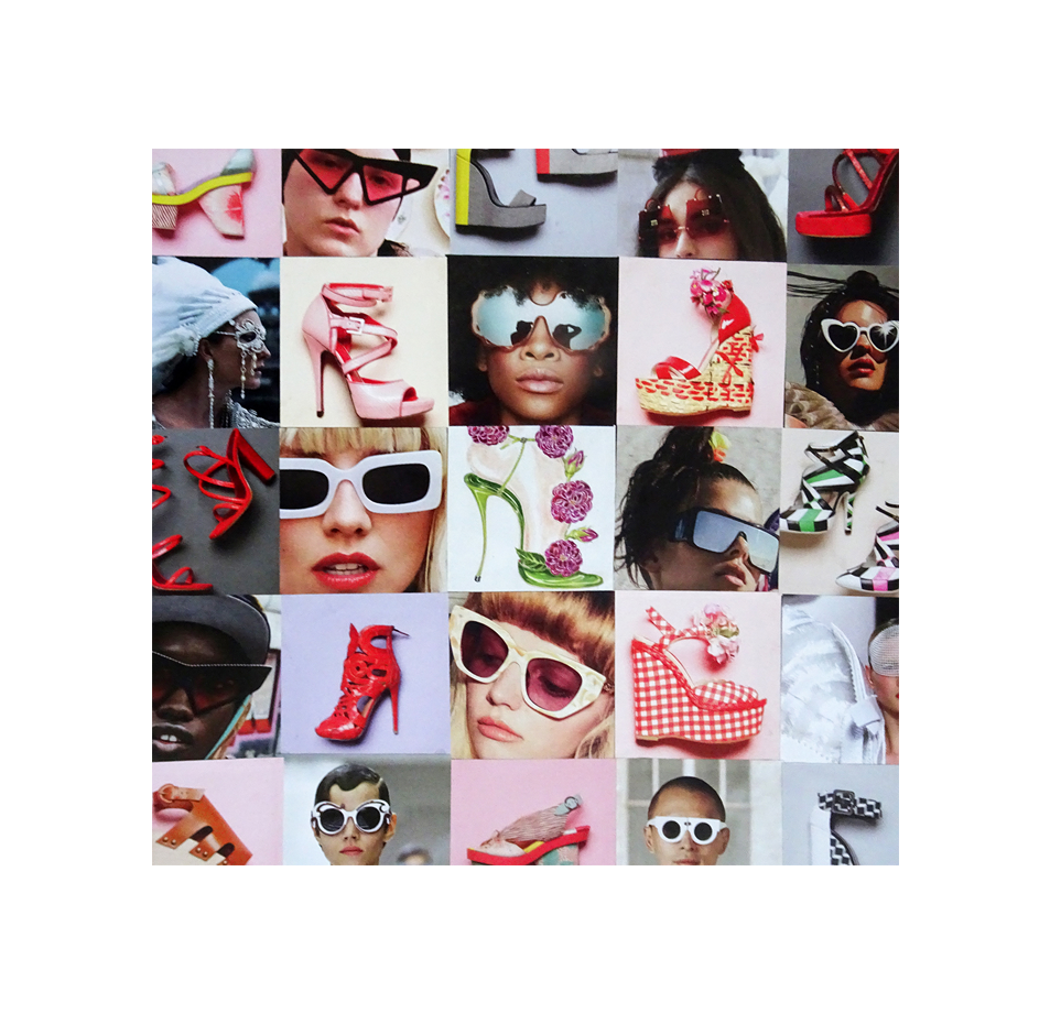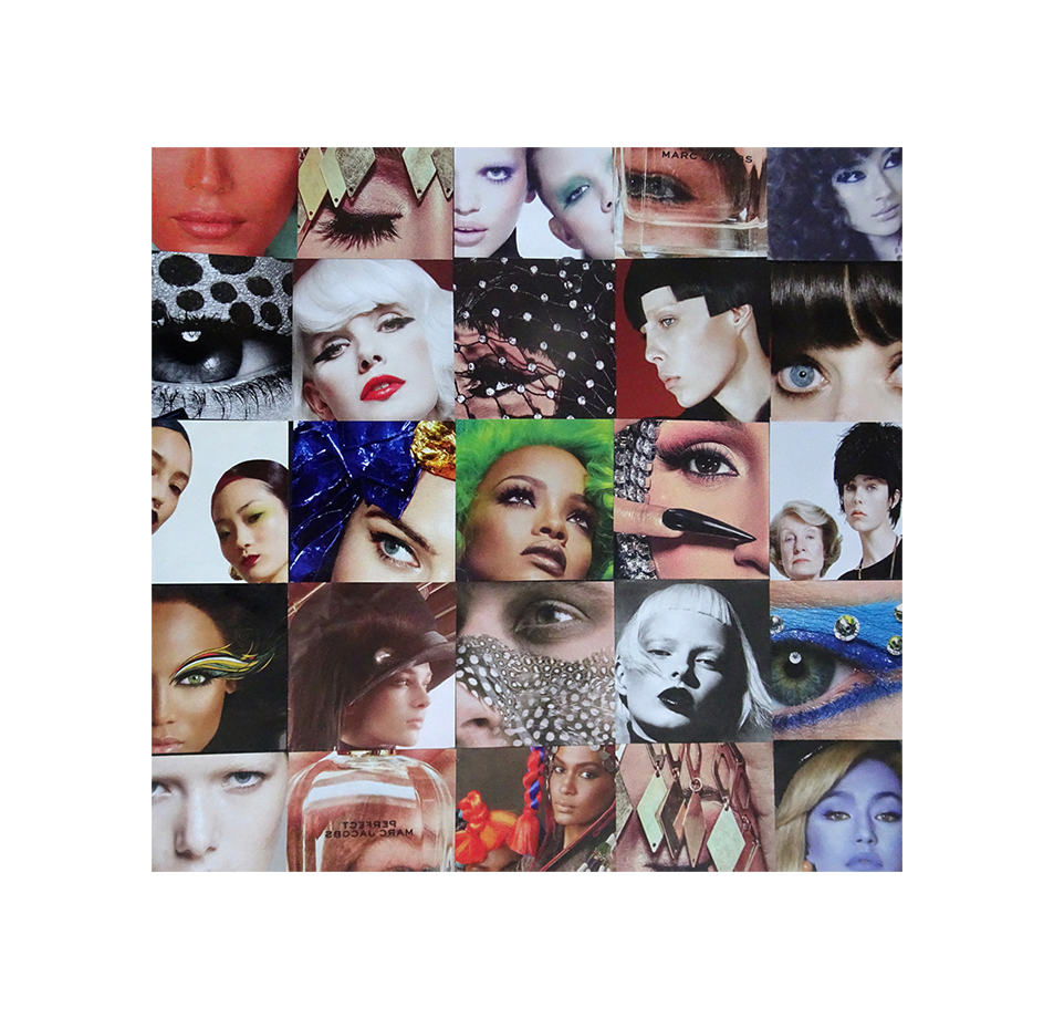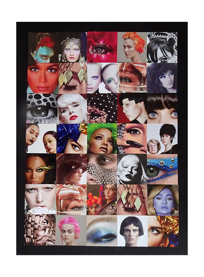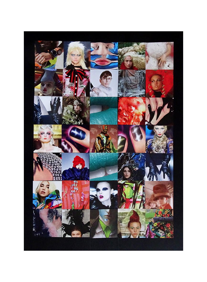 “I didn’t think I could out-word Lewis Carroll, or out-image John Tenniel, so I tried to think of something in my life that was just as nonsensical. I worked in the fashion industry for over 40 years: there’s little in life as nonsensical as couture. I still have a stack of fashion magazines from my time as a designer that I use for collage. These grids are the result.“