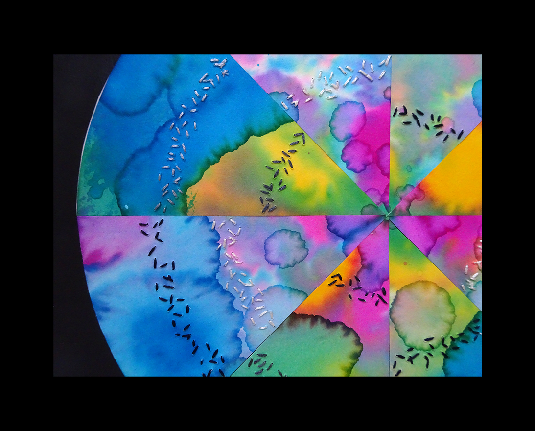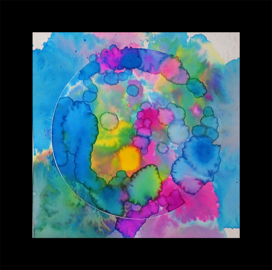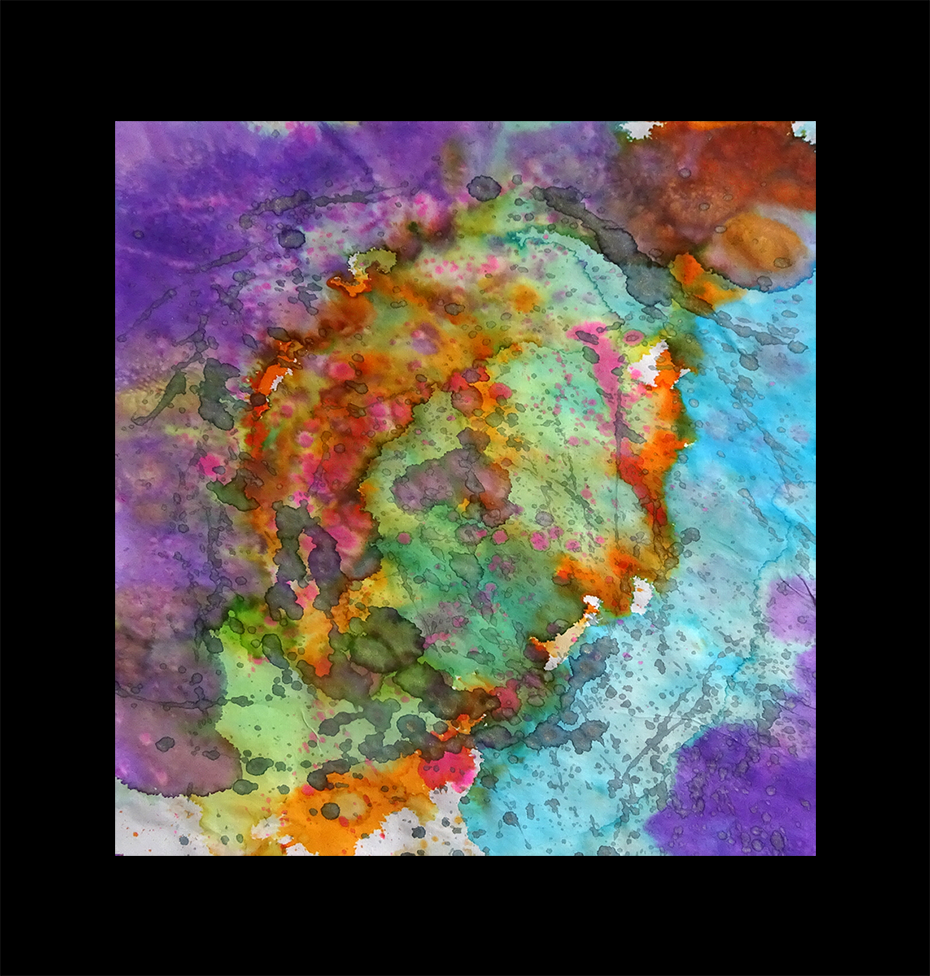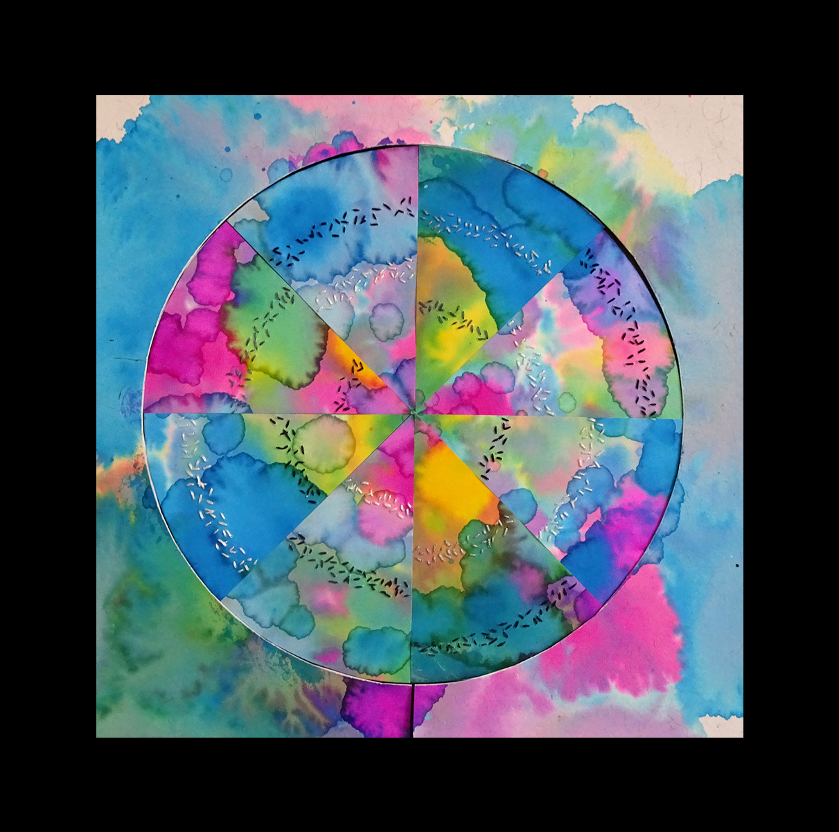 Cosmic, of course. And cosmic communication. I painted a bunch of mandalas and picked out the two that seemed closest to the essence of the music. On the first one I did some asemic writing, then I cut it up and rearranged the pieces and put it inside the outside of the second mandala, which I also cut up and rearranged. But I embroidered some messages on that one. I photographed #2 on black, and also with its original ground. It felt good to get back to some painting.
