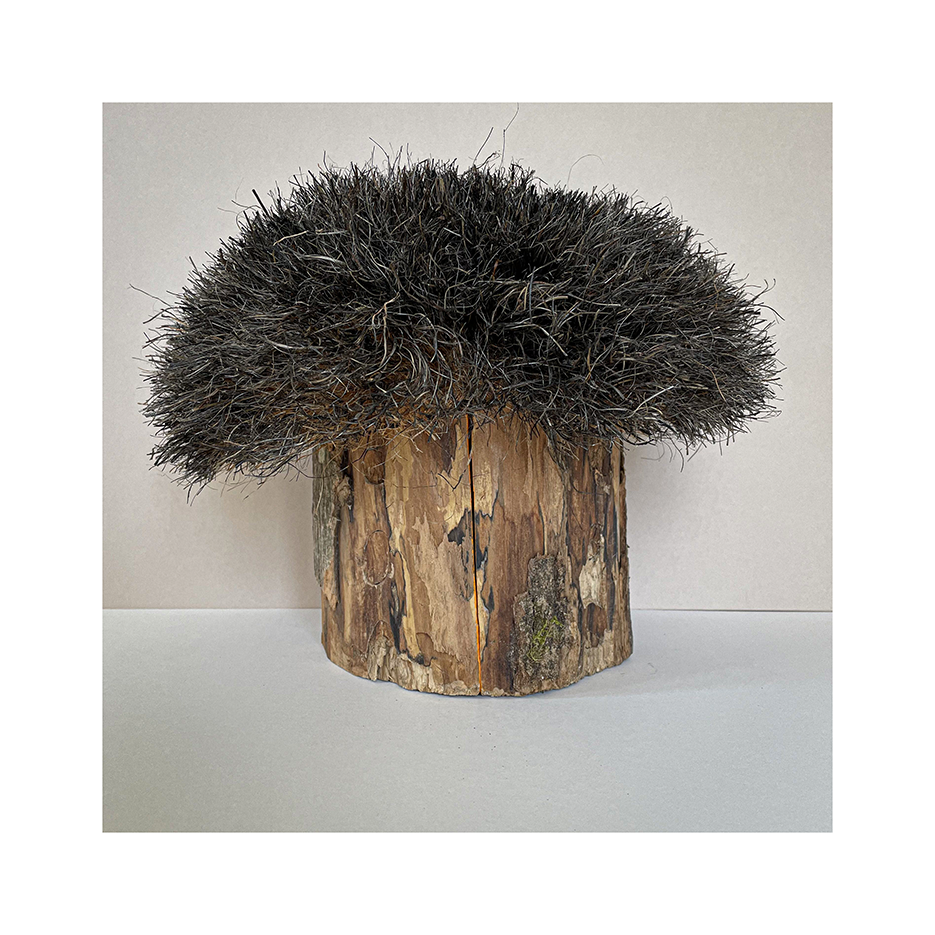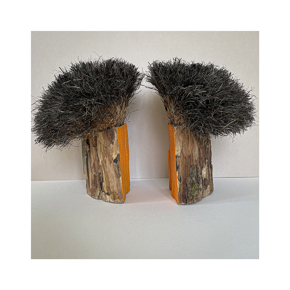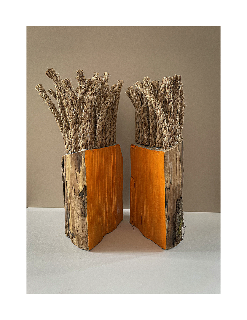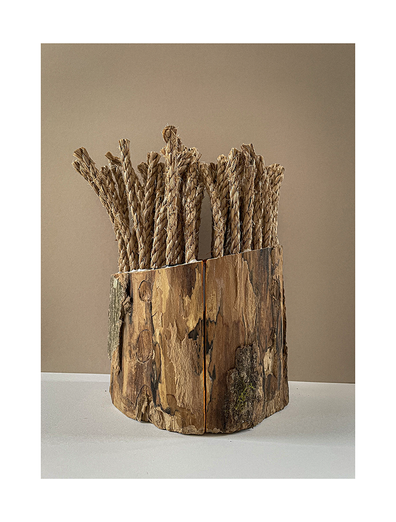 “Off-cuts of 6mm manila rope with frayed ends nicely tied-in with sea anemone characteristics, and in a former life Abaca enjoyed life in the tropics. The fluid patterns upon the outer surface of a once free-growing UK tree then caught my eye, with happen-chance offering the matched quarter to form this half-round form. The vibrant colours of anemone inspired the flashy orange innards, which prompted the contrast of dipping rope-ends into Indian ink. Saved from the wood-burner and now bookends they begged the usual related by-product filling. The log rings read 31 years growth, but being dried prior to purchase I’ll say 33 which dates this KA to its birth in 1990. Hopefully, this winter I’ll find the two missing quarters to form a 360-degree bookend centrepiece, a bit more in compliment to Actiniaria. Thanks for a most satisfying prompt!“