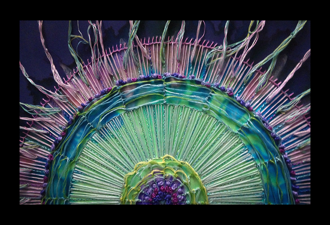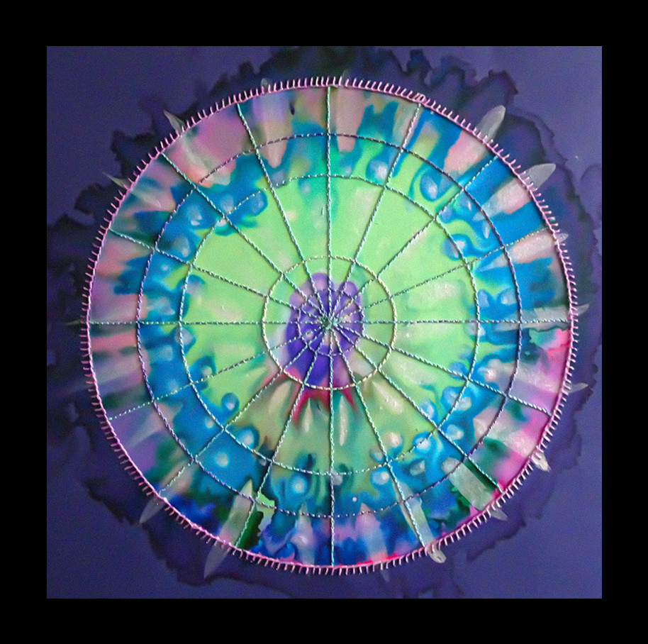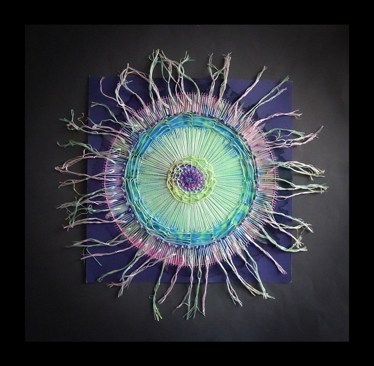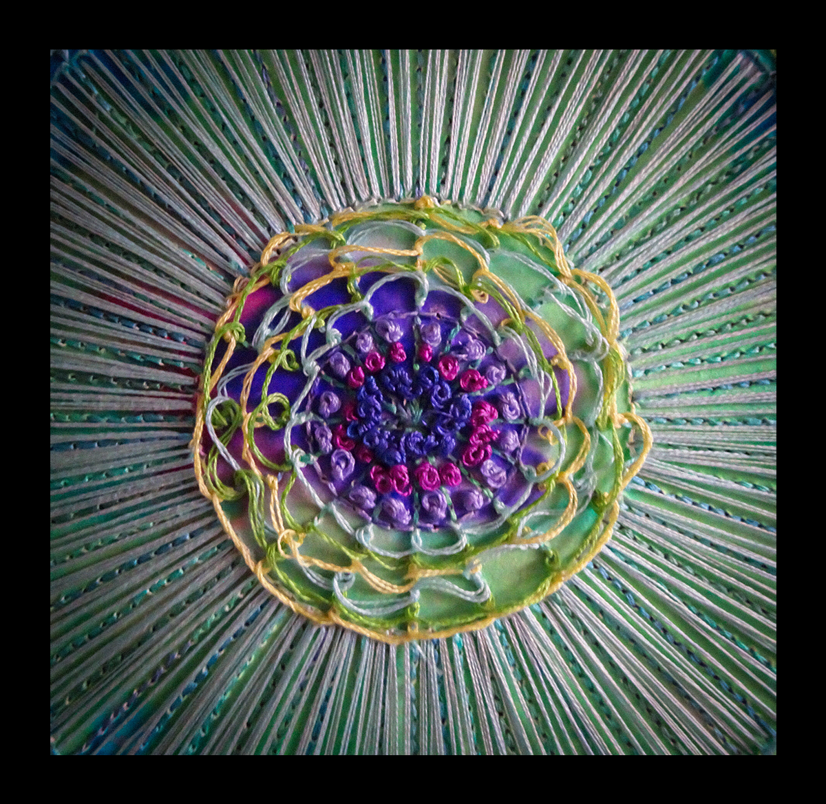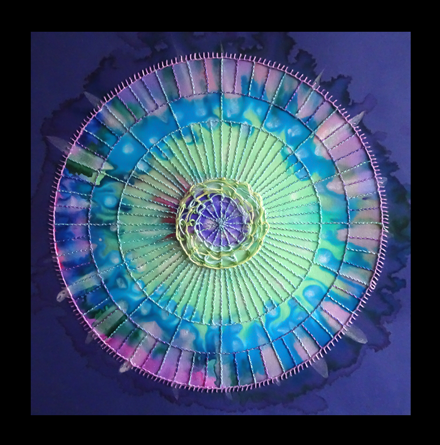 “The sea anemones reminded me of a stitched mandala I had done a few years ago that had all kinds of loose ends. So I painted a couple and started stitching. I’ve shown a few of the steps from painting to where I am now. I’ve taken a few liberties with the colors, combining several actual combinations. I think when I add two more rings of tentacles it will be just right.”