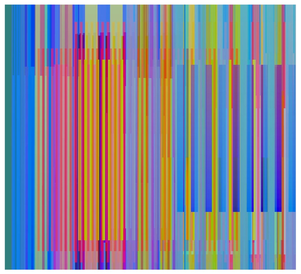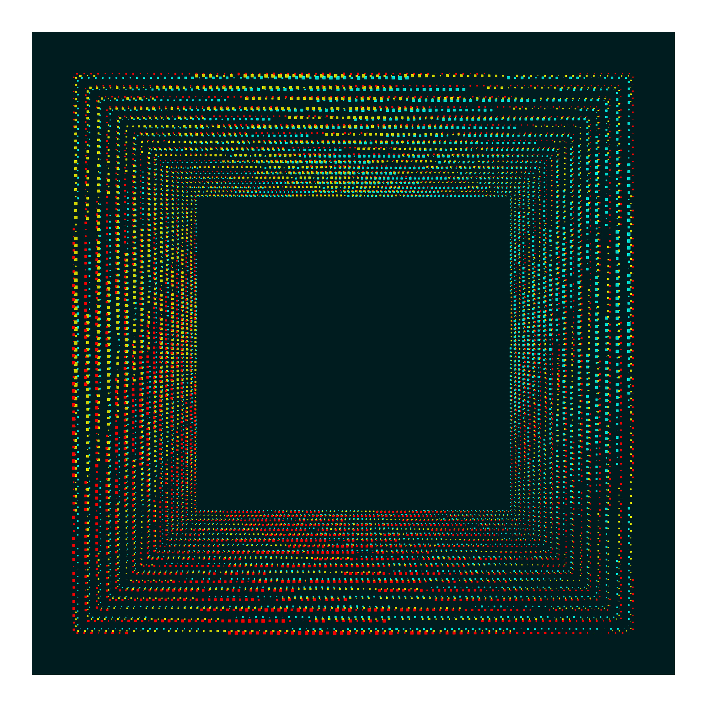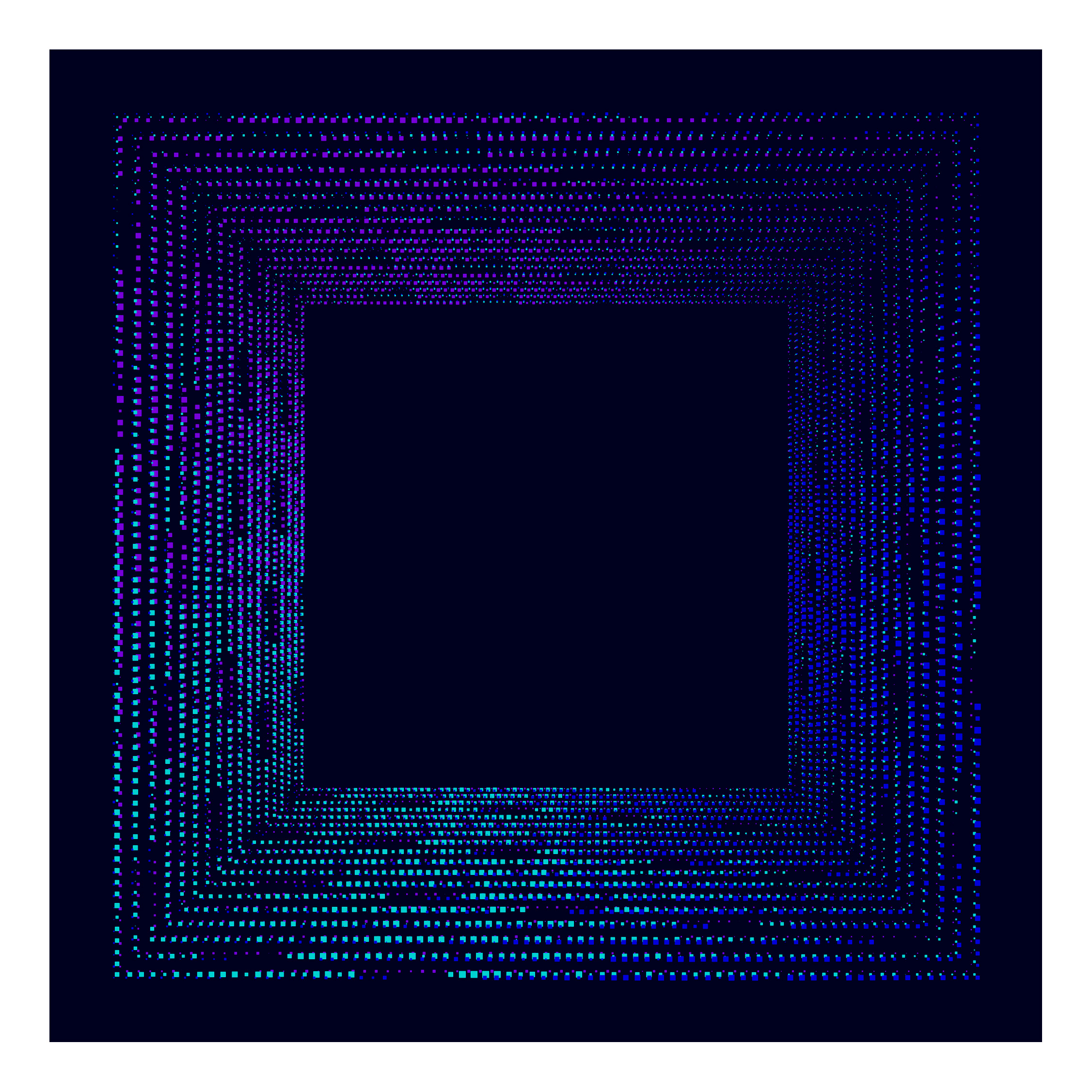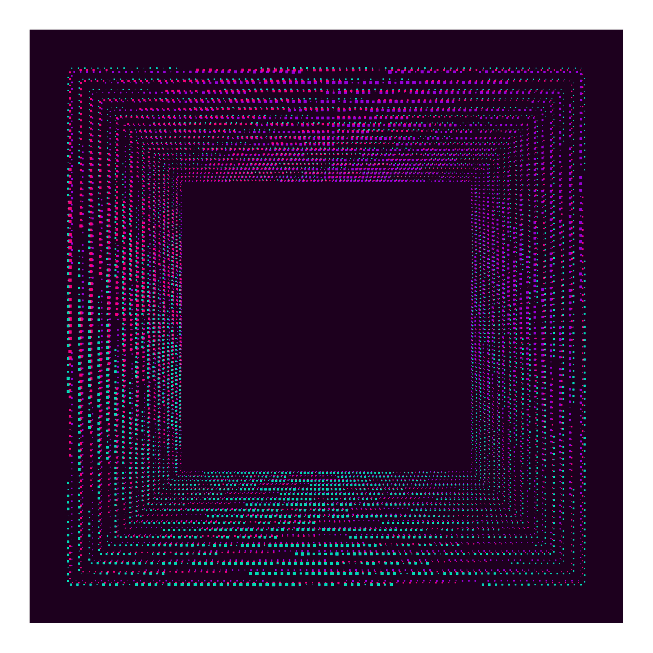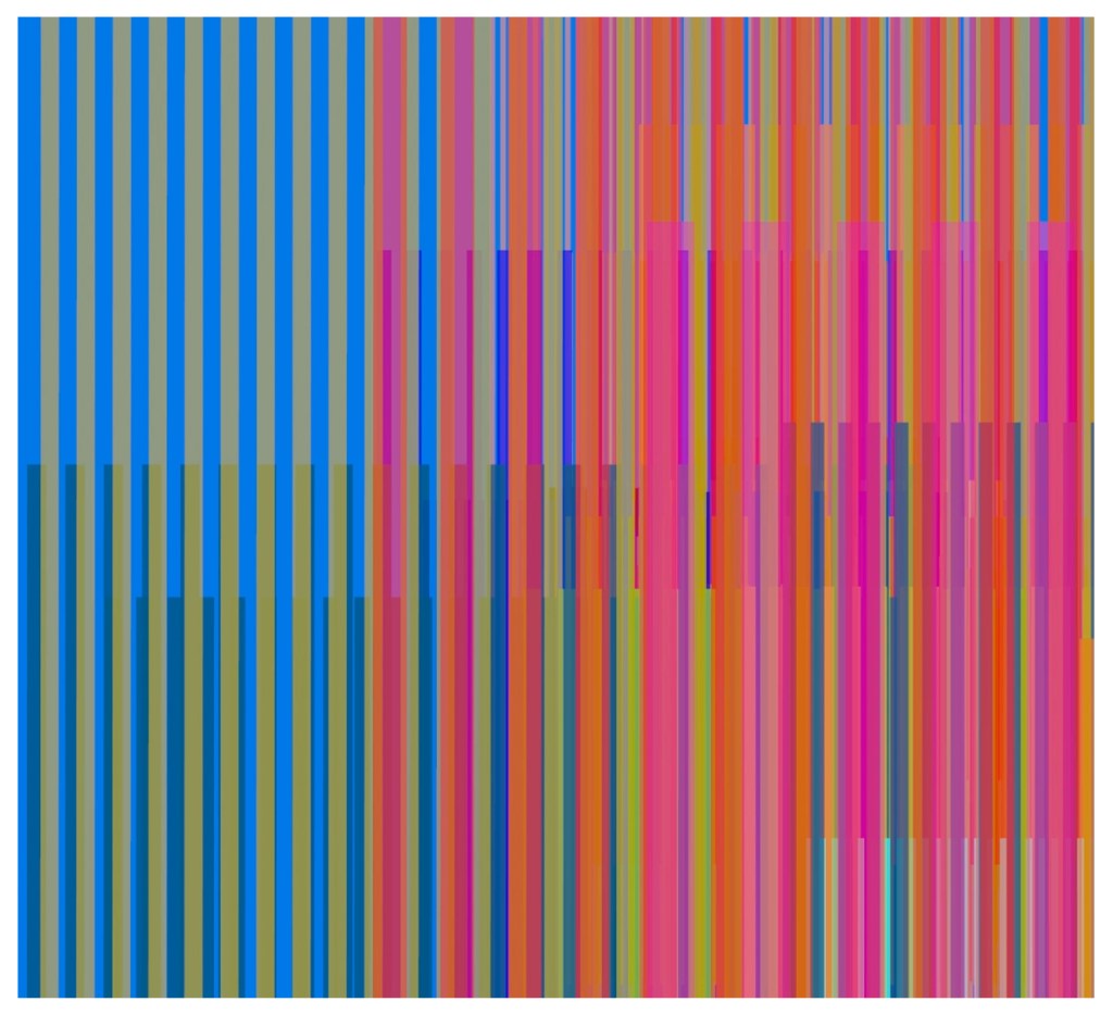 “I think the work of Carlos Cruz-Diez demonstrates the transformative potential of layering basic shapes with differing colours and making subtle positional adjustments to create something visually interesting and rather primal. I incorporated a couple of algorithmic elements into this concept, resulting in some unexpected outcomes that produced these graphical textures and patterns. I had reservations about using a basic square shape as the container for these experiments, but I found that its simplicity enhanced the overall visual aesthetic rather than complicating it. The straightforward nature of the humble square seemed to complement the complexity introduced by the interplay of colours and patterns.”