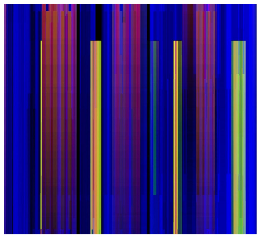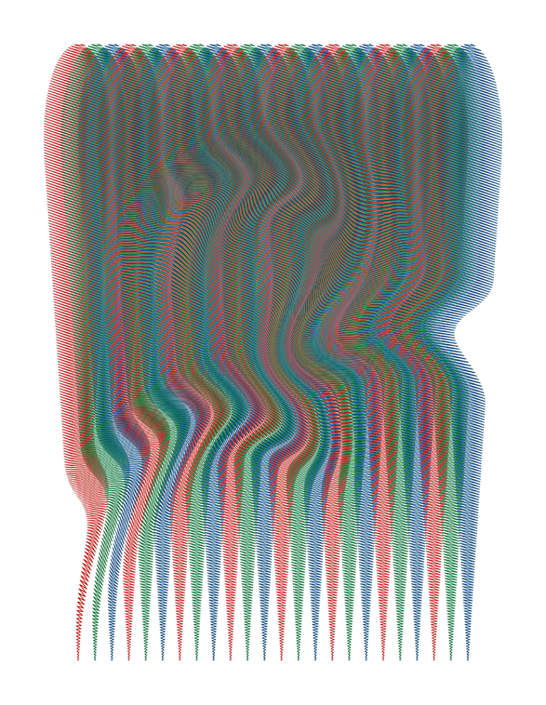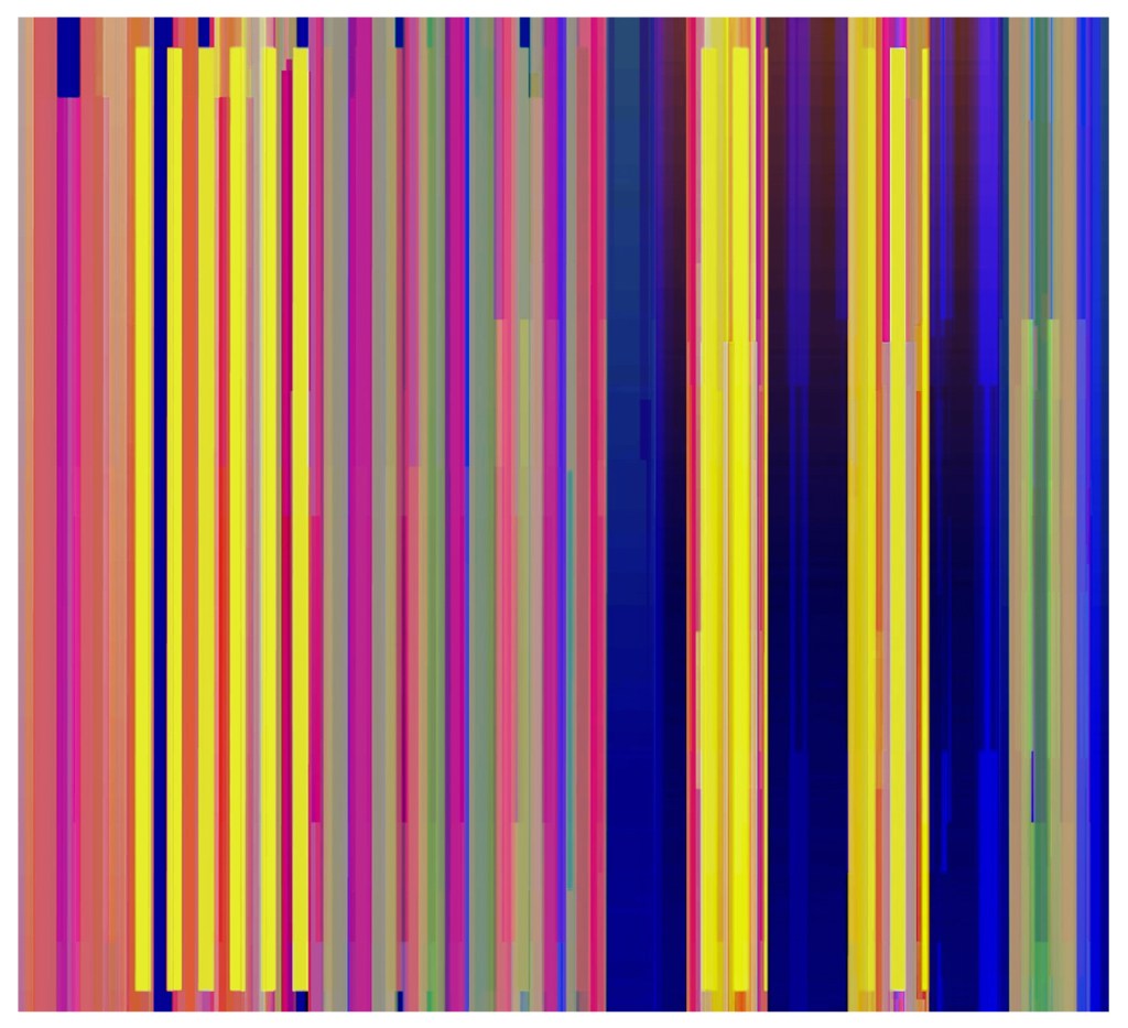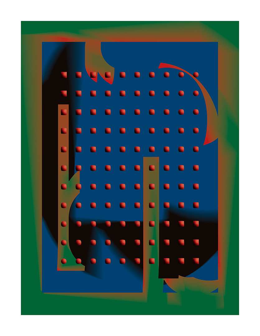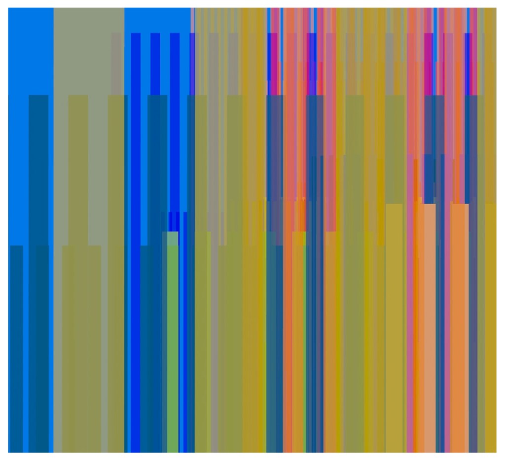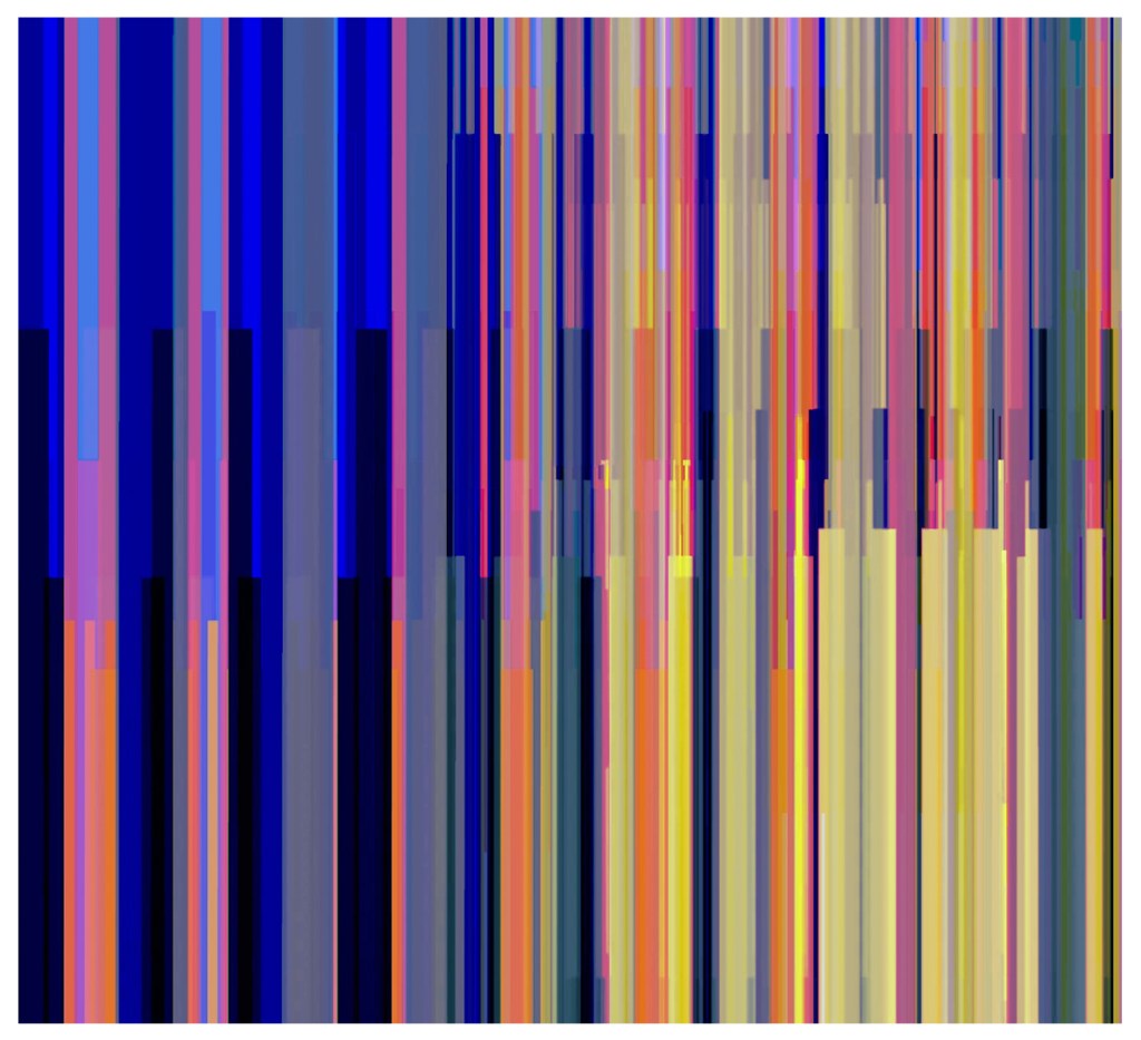 “I think the work of Carlos Cruz-Diez demonstrates the transformative potential of layering basic shapes with differing colours and making subtle positional adjustments to create something visually interesting and rather primal. I incorporated a couple of algorithmic elements into this concept, resulting in some unexpected outcomes that produced these graphical textures and patterns. I had reservations about using a basic square shape as the container for these experiments, but I found that its simplicity enhanced the overall visual aesthetic rather than complicating it. The straightforward nature of the humble square seemed to complement the complexity introduced by the interplay of colours and patterns.”