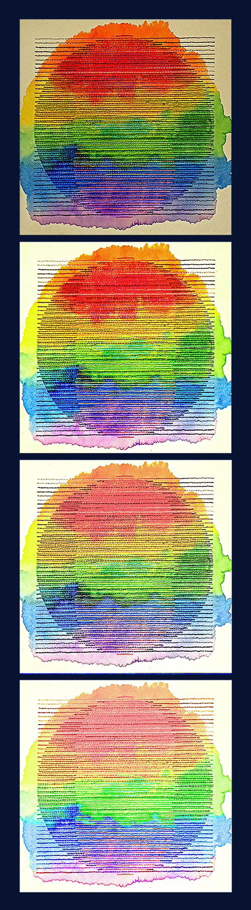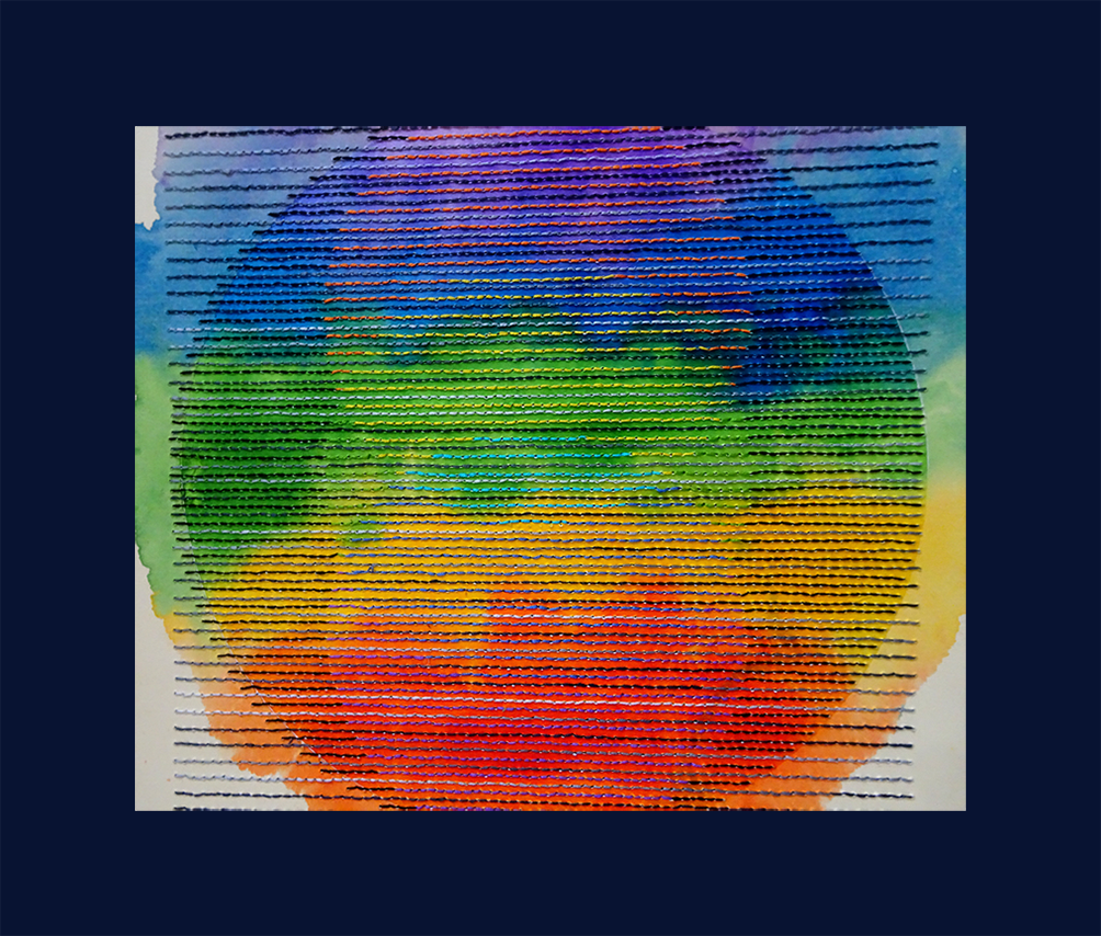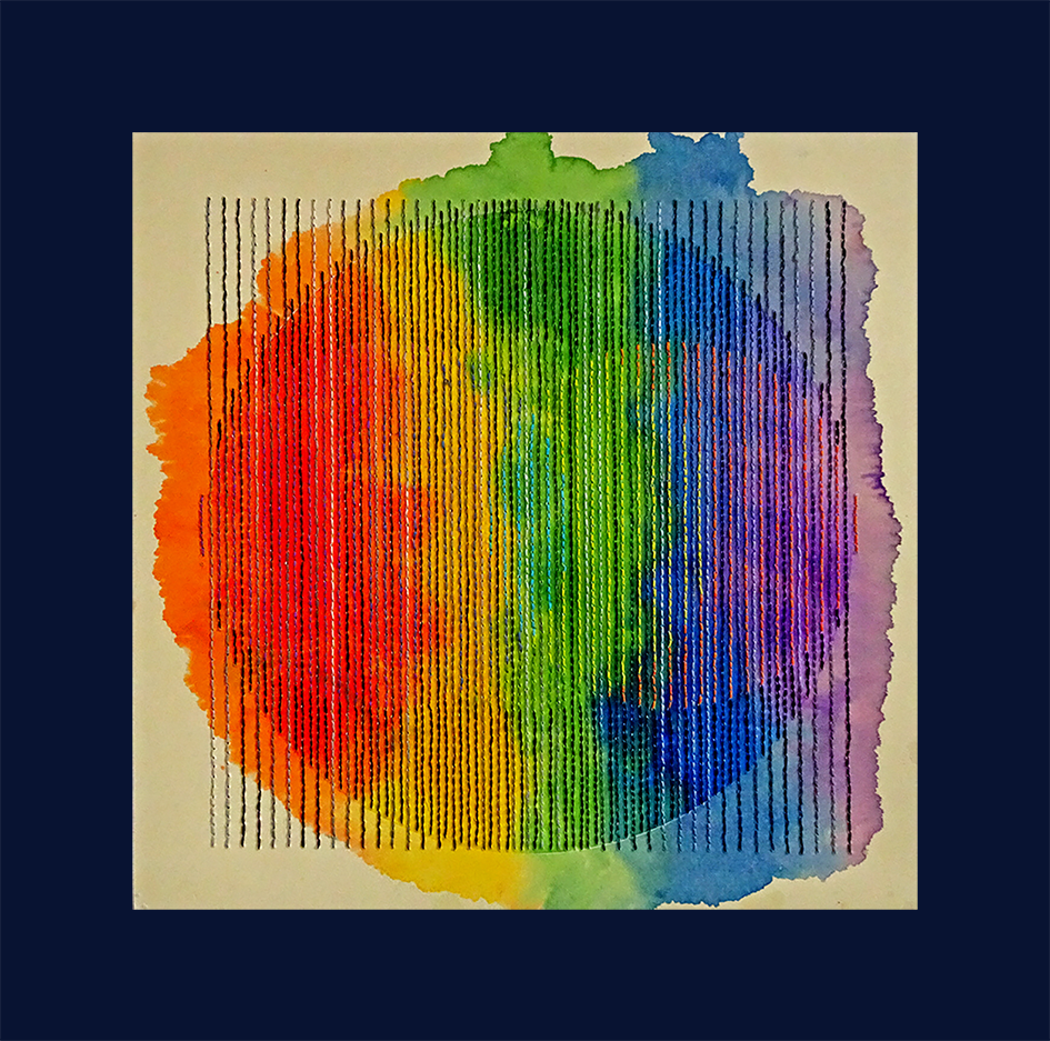 “As usual, I had no idea what I was doing, and my stitched circles turned out to be so subtle as to be almost invisible. The painted ground overwhelmed the stitching I think. But through the magic of Photoshop and a revision of some writing I had been working on, I managed to come up with a commentary on Cruz-Diez’s distortions of color and light. Not what I intended, but then that’s how things often work.“