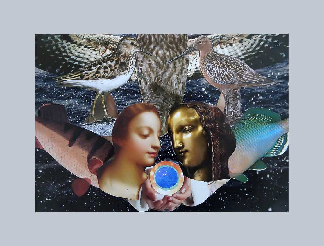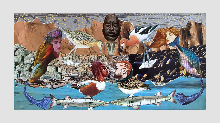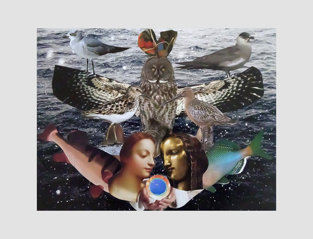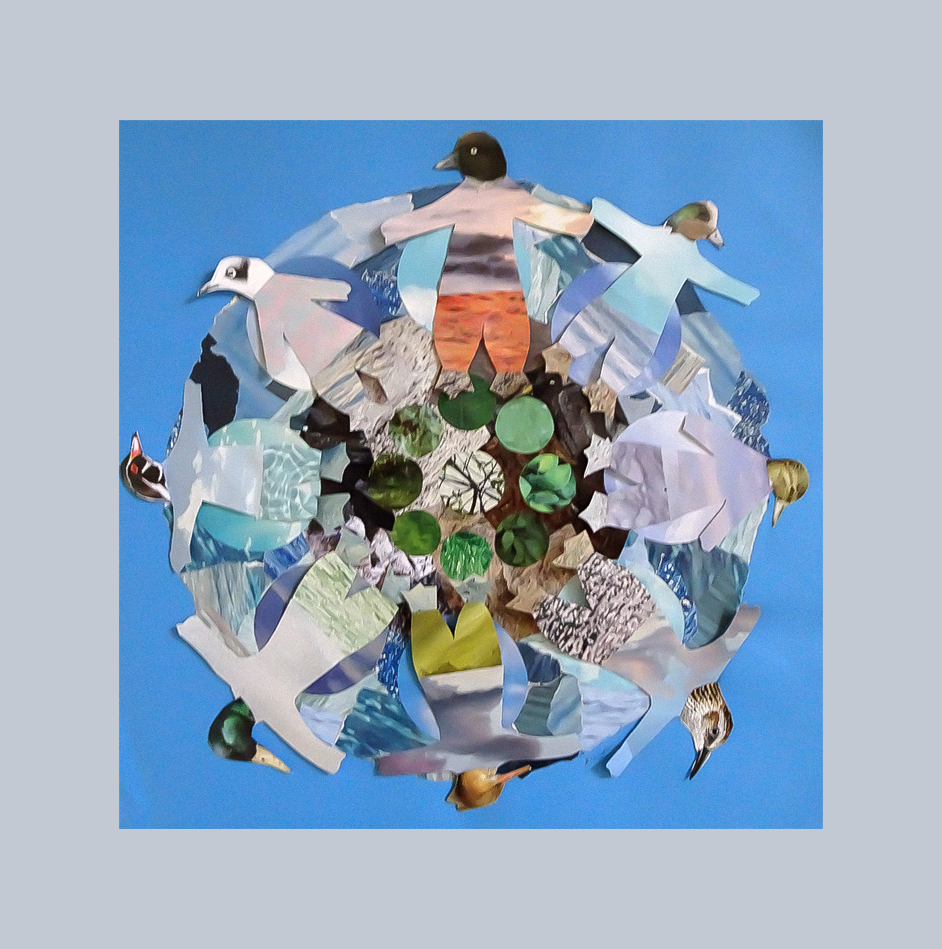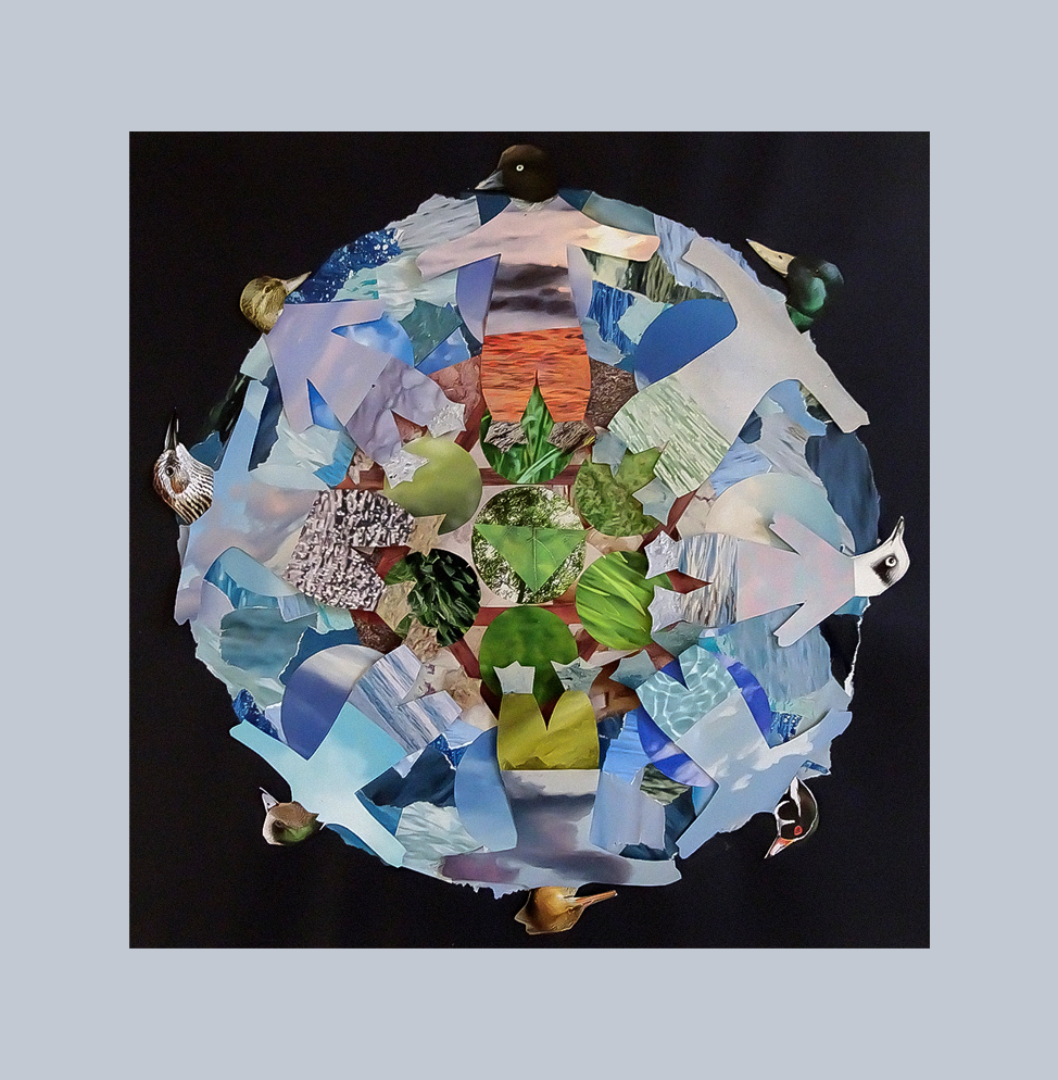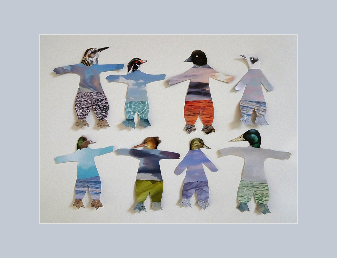 “Of course I was attracted to Ashevak’s human-animal hybrids, and her totemic designs. I love that she used so many birds; had I had more fish in my collage box, I would have included more of them as well. The first collage I did was the one where I most closely imitated her work, but I began to loosen up with each new attempt. I was delighted to see she had invented her own birdling-like creatures, and I made a group of similar birdlings in my style. Instead of actual clothing, I gave them sky shirts and ocean pantaloons. I did not have time to make landscapes for them, but discovered two old earth mandalas which worked well to show their connection to the land, as Ashevak did with all her work. I like that their ocean-sky outfits make them blend into the landscape too.”