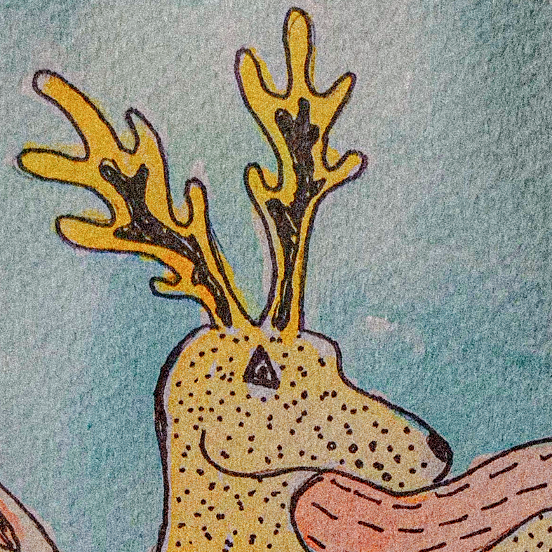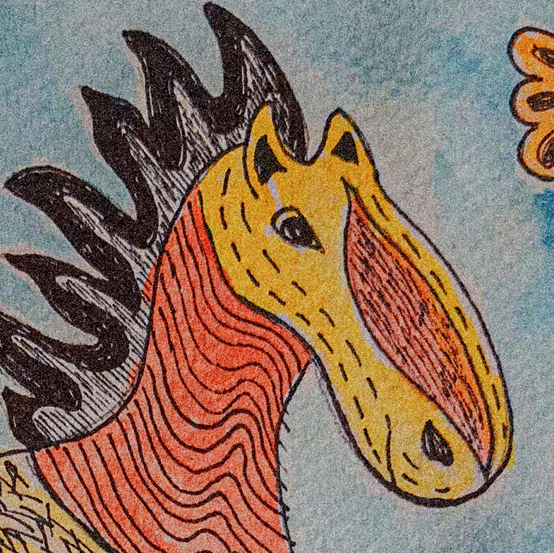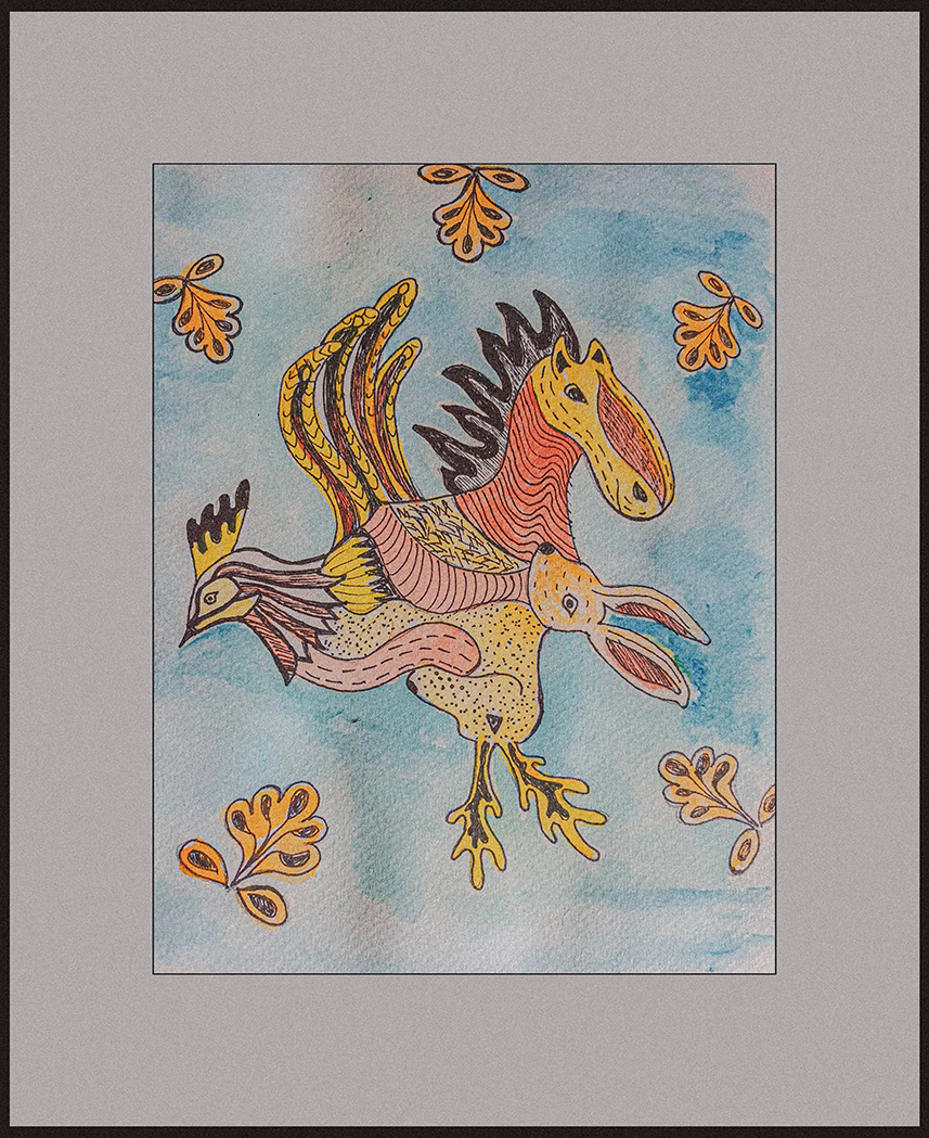 “I love the art made by Indigenous people. It has a lightness of spirit and a playfulness about it. The artists also have a special rapport with animals and have fun with their designs. After scanning through various pictures of Inuit art, I decided to make up my own fictitious creature by combining four different animals. You can imagine families gathered around the fire telling stories about the day they saw a beast with the head of horse and the tail of a cockerel, running across the skies as fast as a hare or a young reindeer!”