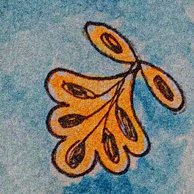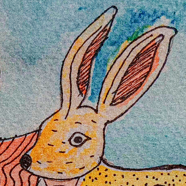 “Good to see indigenous art in the KA to inspire us. The fruit bats are roaming the end of day skies as I do my walk and the moon sits low in the darking skies. So they were my inspiration also. Didn’t intend the result to be monochrome but I mucked up my palette and started the project too late to correct it.”