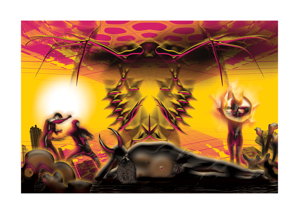 “Weird Santa is perfect – I’m so anti-Santa consumer poster boy! There were a couple of shapes from my last Kick About that I wanted to explore some more so I popped them onto a Brisbane building photo in fancy colours and I used that as this KAs background. I needed a Santa figure reference pic so got out an ancient copy of a book of Eadweard Muybridge photos and found a few that I redrew and worked into consumer Santa and his colleagues – Petrochemical and Defence Industry figures. Added a few extra building pics and bones and flowing water… So I do believe in an end of year marker to share positive thoughts for the year ahead and to send out thanks for shared creativity over the past year – particularly to Phil, of course, round of applause please. So many amazing creations come from Phil’s prompts – thank you all for sharing your beautiful art.“