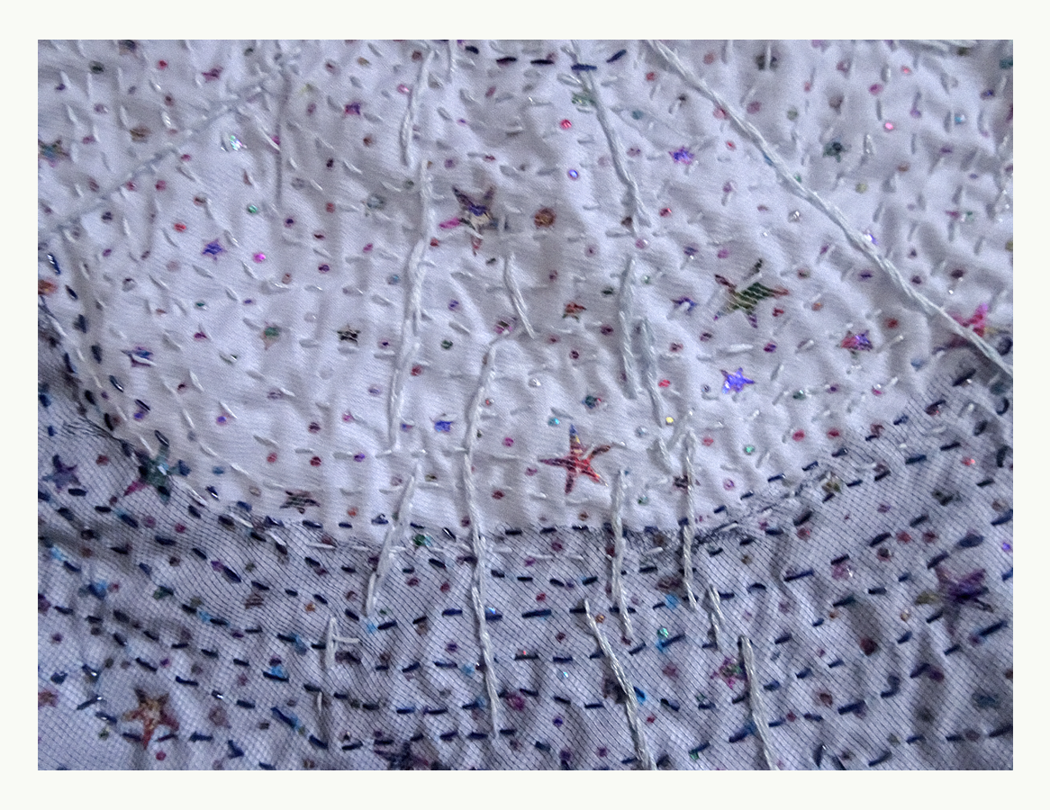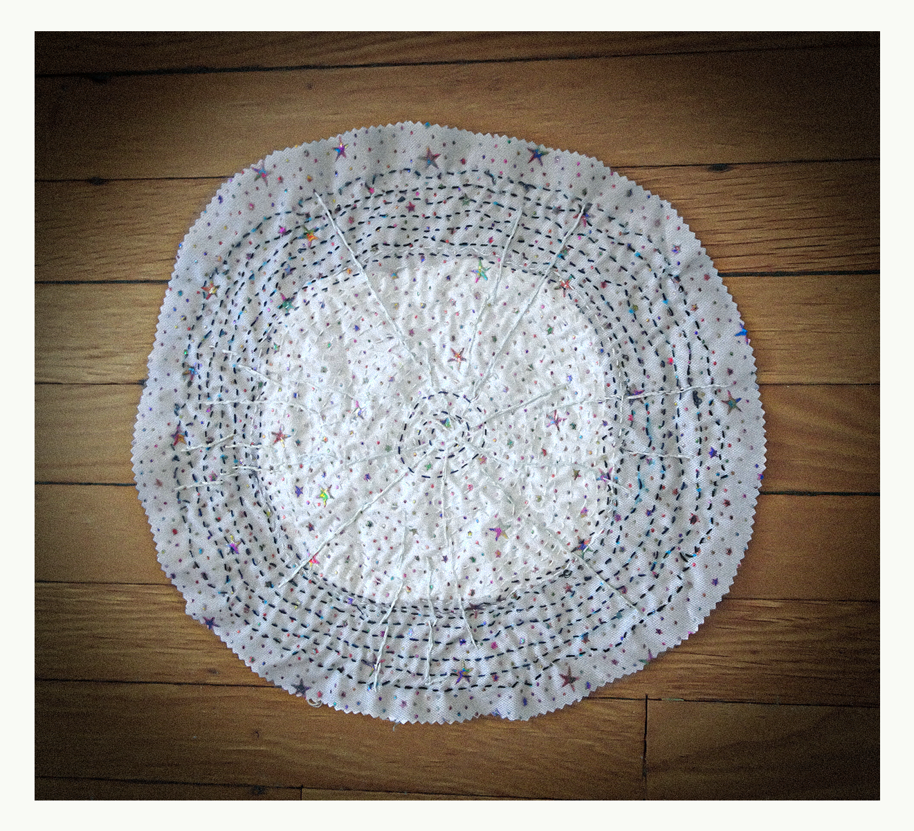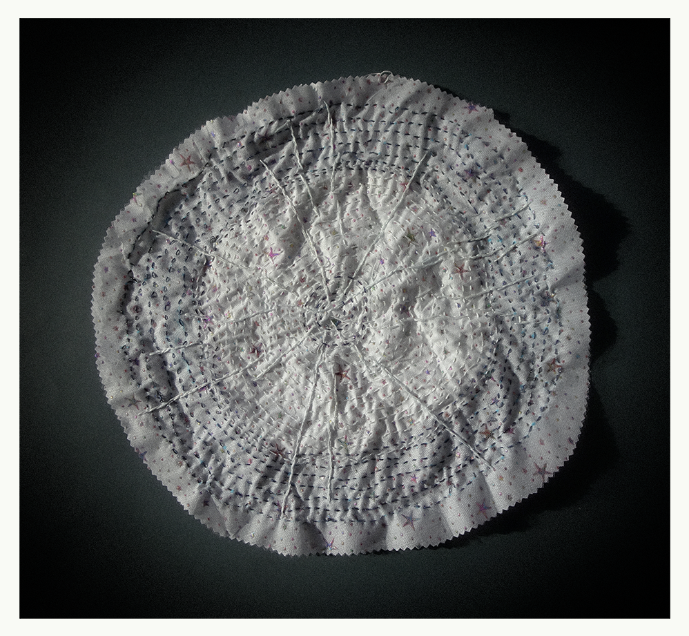 “Wanting to move away from the rampant consumerism that is symbolised by Santa in the US, I decided to do something more solstice-oriented. I thought also about the Yule log and its ancient association with marking the return of light. I have a book called ‘Woodcut’ that contains prints made from cross sections of tree trunks. The one I chose to work with was cedar, but only after I finished my embroidery did I do a little research and discover that cedar is considered the World Tree in many cultures, a symbol of new beginnings and a portal between heaven and earth. I used some star fabric and black and white tulle I found in my fabric bin, and loosely circled around the tree rings in the cross-section with my stitches. It didn’t really photograph all that well, so I did a number of different versions on different grounds and in different light. And I wrote a little poem…”