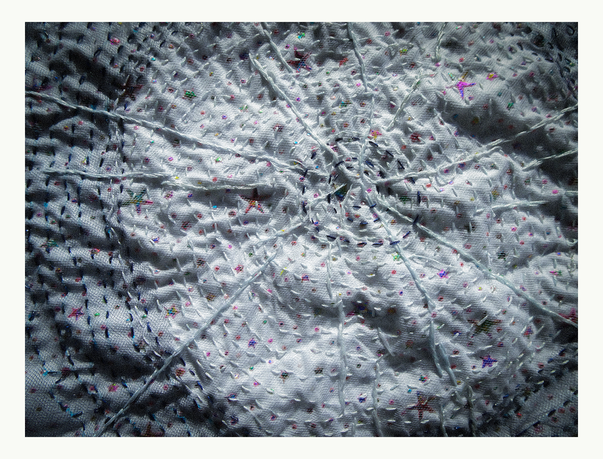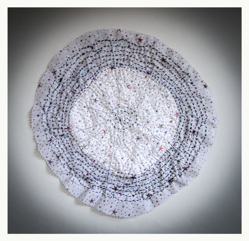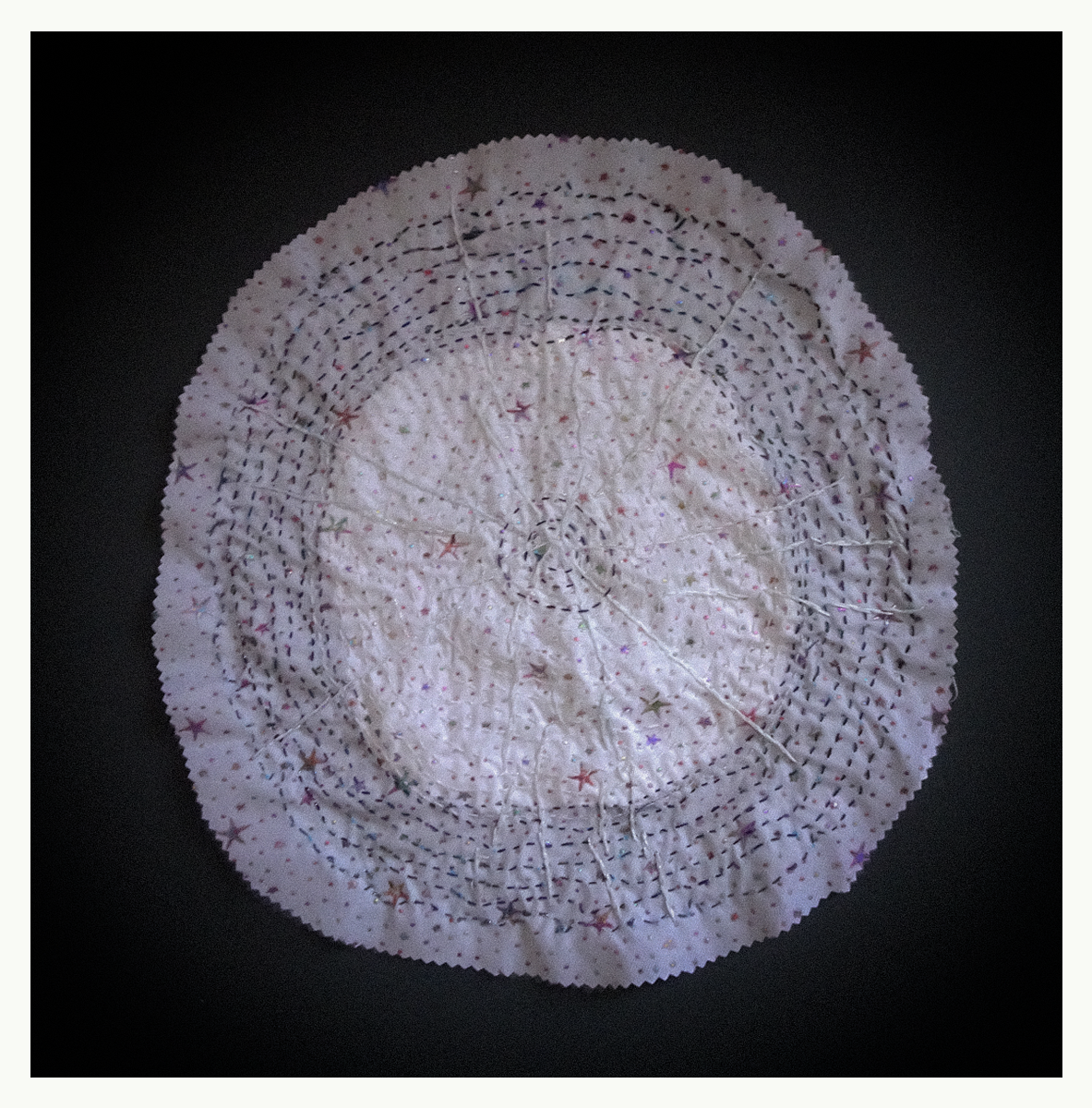 “Wanting to move away from the rampant consumerism that is symbolised by Santa in the US, I decided to do something more solstice-oriented. I thought also about the Yule log and its ancient association with marking the return of light. I have a book called ‘Woodcut’ that contains prints made from cross sections of tree trunks. The one I chose to work with was cedar, but only after I finished my embroidery did I do a little research and discover that cedar is considered the World Tree in many cultures, a symbol of new beginnings and a portal between heaven and earth. I used some star fabric and black and white tulle I found in my fabric bin, and loosely circled around the tree rings in the cross-section with my stitches. It didn’t really photograph all that well, so I did a number of different versions on different grounds and in different light. And I wrote a little poem…”