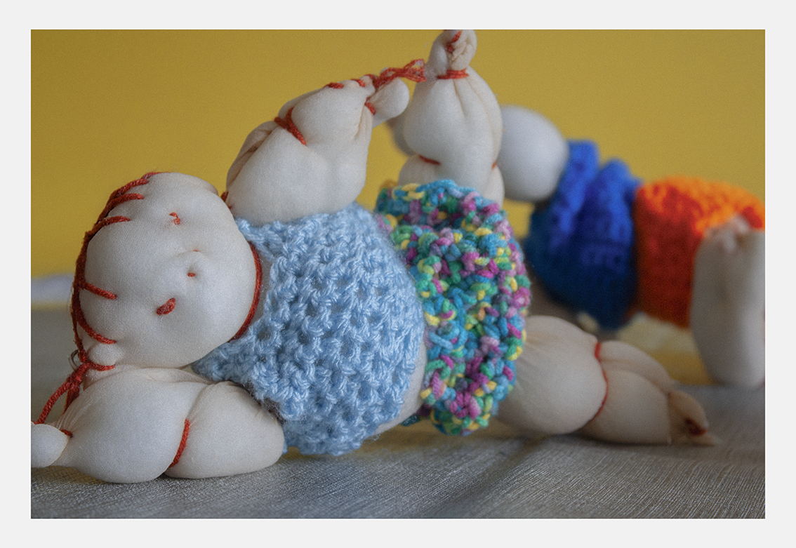 For many years, through my twenties and thirties, I taught adult dance and exercise classes in small village halls and school gyms and many of the women who attended these classes carried rather more weight than they would like. Most had never danced before and few had any structured exercise regime. But the camaraderie, the good humour, and the mutual support these ladies brought to class made them a joy to teach. Botero’s ladies remind me of my 1980’s Keep Fit Ladies and I made these figures in honour of them. (Nylon tights, soft toy stuffing, and yarn.) I call them ‘The Three Graces’ – or ‘Wednesday Morning Yoga’. Enjoy.”
