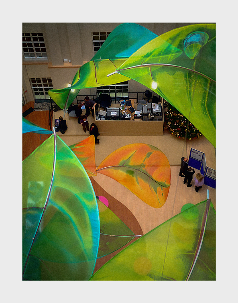 I have chosen the huge 4 metre leaves that hung in the Department of Farming and Rural Affairs (DEFRA) in London. They were made of silk organza stretched over a metal curved rod and hand-painted with dyes. They spun in a spiral slowly in this new space over 8 floors designated for discussions of world leaders re: Climate Change. Three leaves had a Trompe L’oeil dewdrop reflecting the building which was built in 1928. It just happened to be the same year that Escher engraved his leaf with a dewdrop and people were already talking about climate change. Ironically my leaves were taken down when the Conservative government took over…”