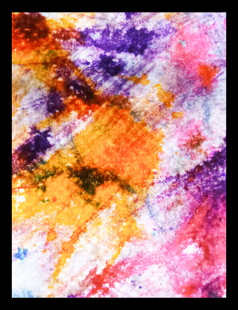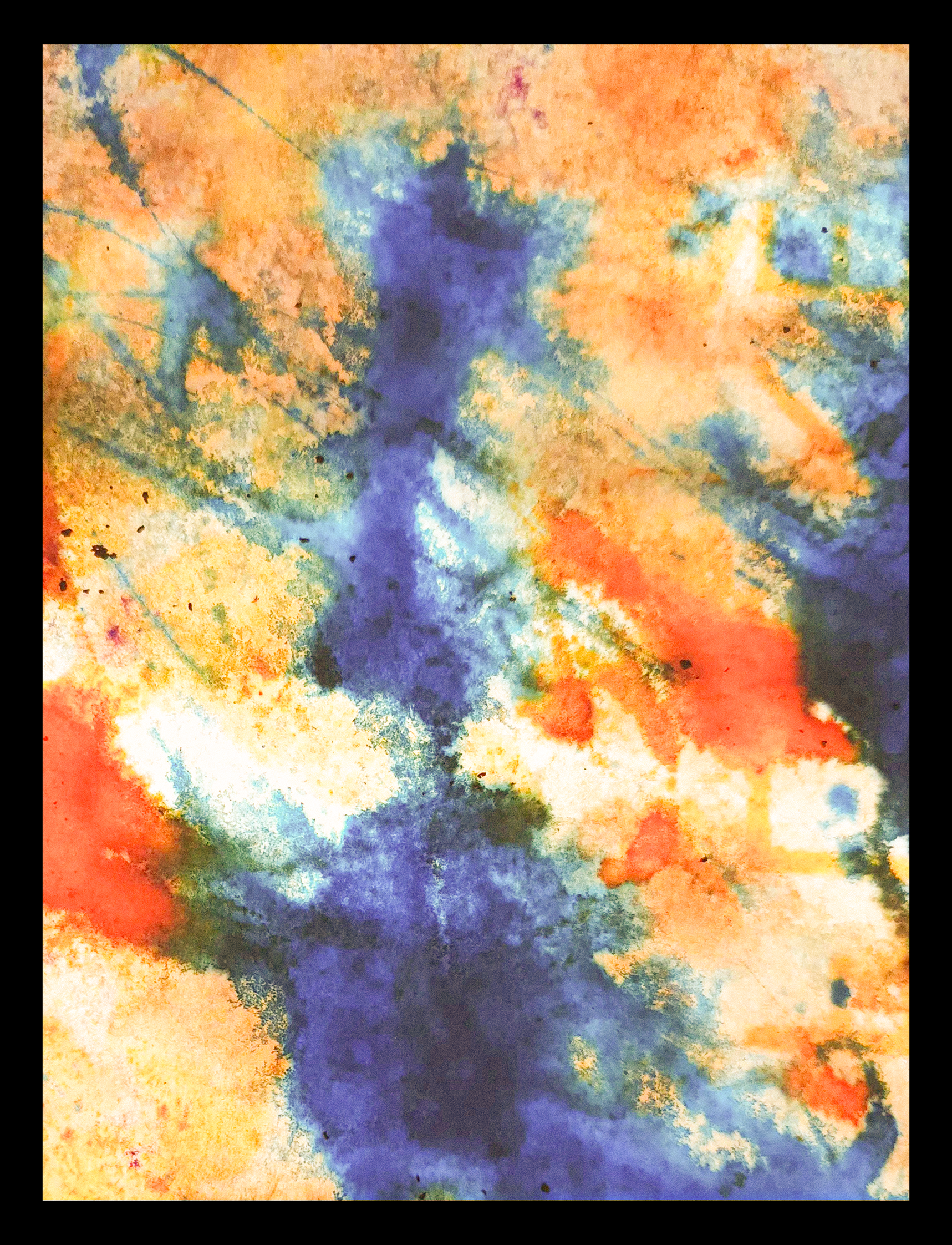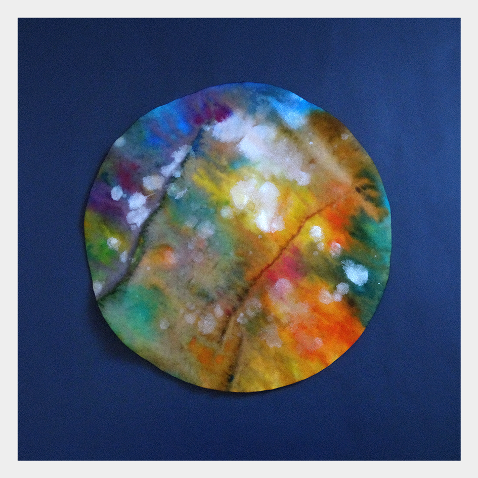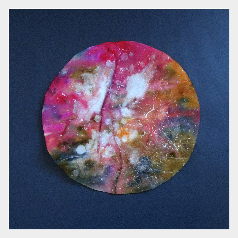 “I decided to make some abstract pictures of the Cosmos using my acrylic inks, a bit of spray oil, watercolour paper and the only card I could find, which was the back of an old cornflake packet. Then using the ink droppers I proceeded to have a bit of fun. Soon, however, I became rather despondent with my efforts and was about to consign them to the bin when, low and behold, the sun came out (very briefly!). I had a eureka moment and quickly took a few photos whilst holding my pictures up against the window while the rays of light shone through. Not quite as good as the Hubble Telescope, but it’s amazing what can be achieved with some inspiration and a cornflake packet!”