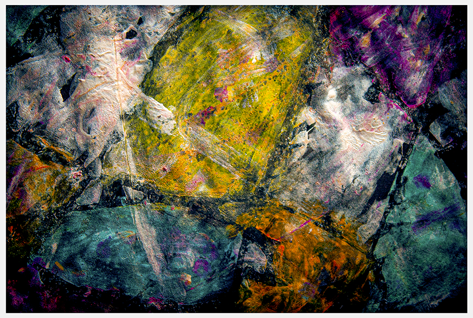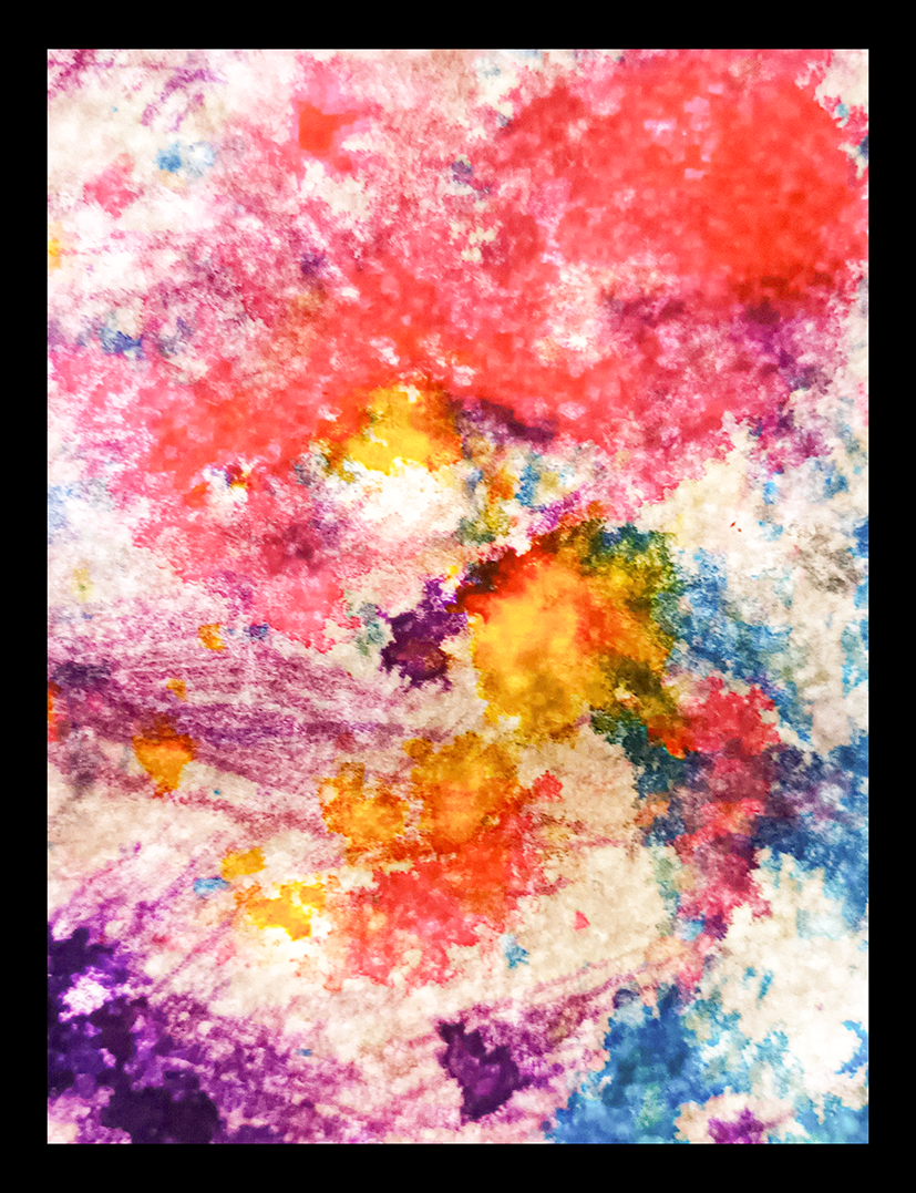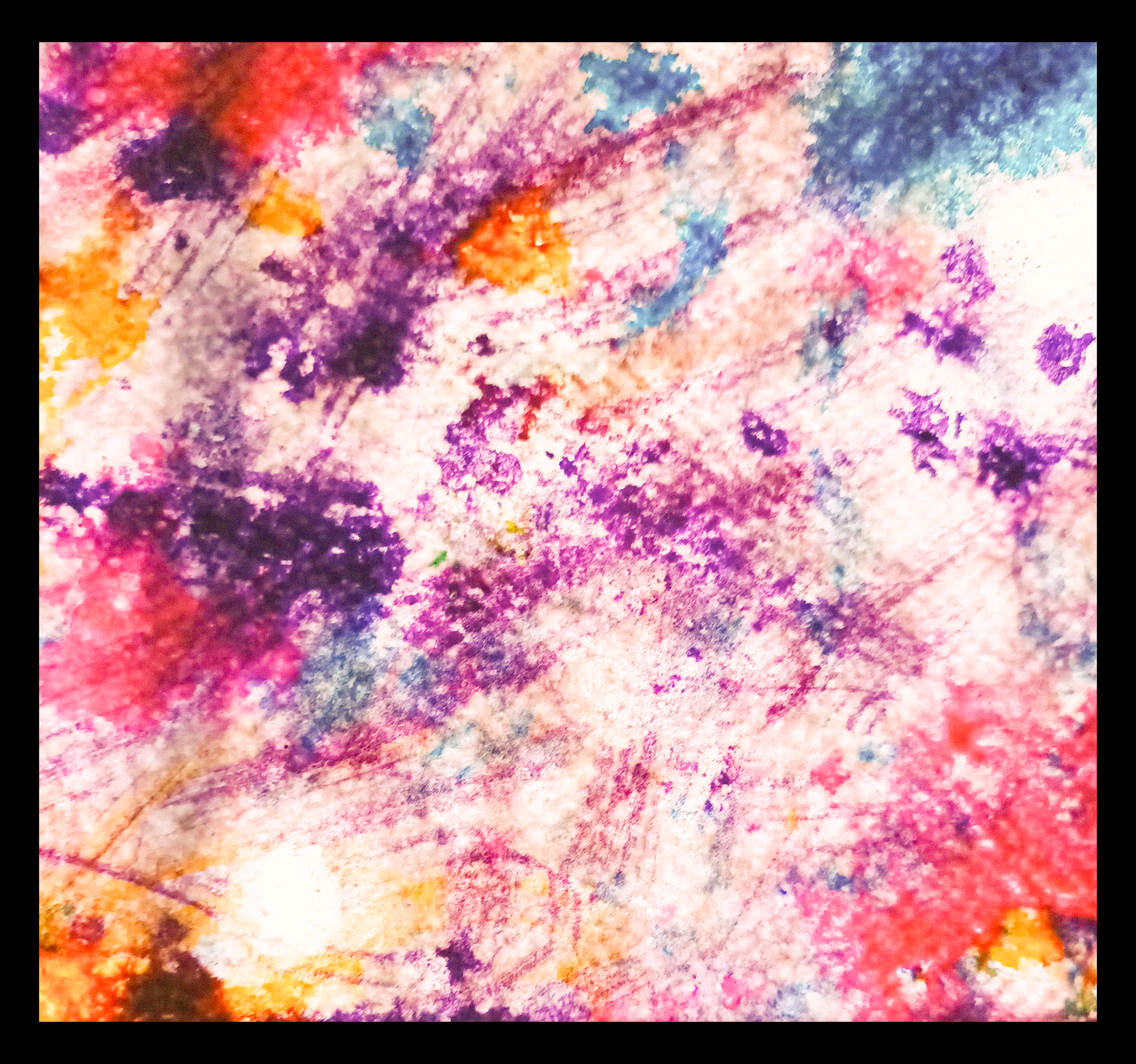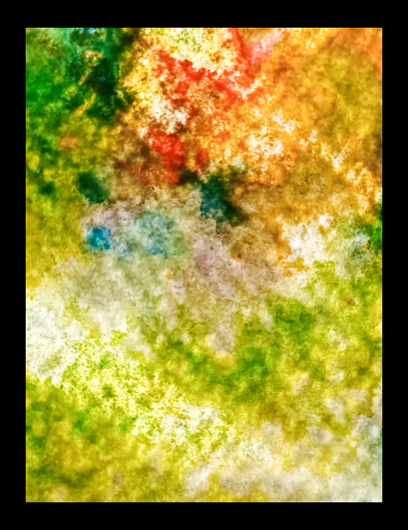 “I decided to make some abstract pictures of the Cosmos using my acrylic inks, a bit of spray oil, watercolour paper and the only card I could find, which was the back of an old cornflake packet. Then using the ink droppers I proceeded to have a bit of fun. Soon, however, I became rather despondent with my efforts and was about to consign them to the bin when, low and behold, the sun came out (very briefly!). I had a eureka moment and quickly took a few photos whilst holding my pictures up against the window while the rays of light shone through. Not quite as good as the Hubble Telescope, but it’s amazing what can be achieved with some inspiration and a cornflake packet!”