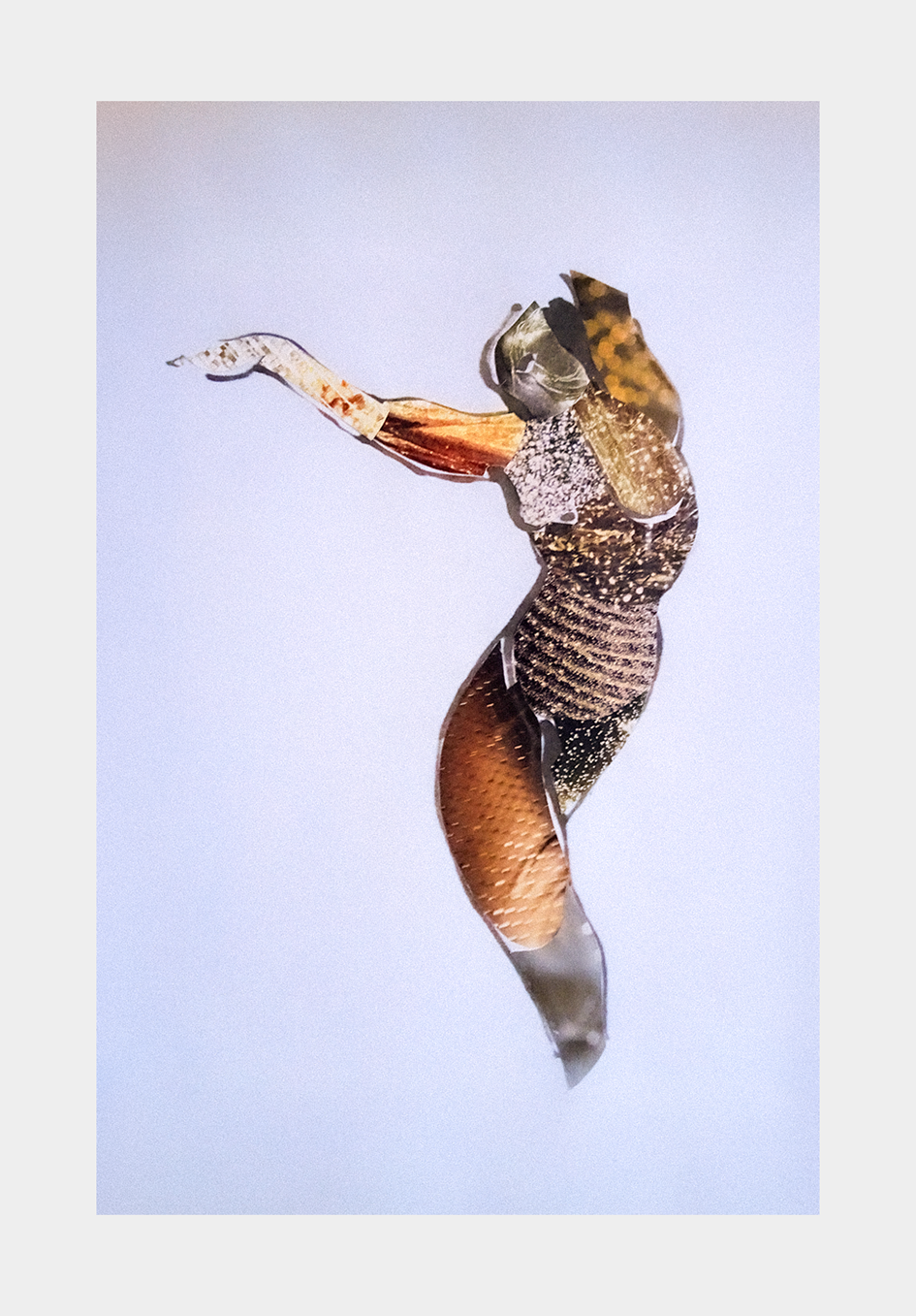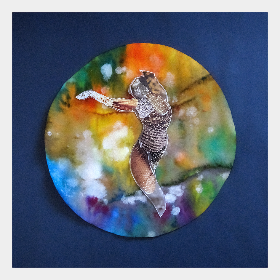 “Instantly when looking at the image I was reminded of a Kandinsky, I think because, when I observe a Kandinsky, I think of life and all its many forms present and intertwining with each other. Recently, being reminded of my collage work, I had a yearning to dip my toes back in. I collaged images from a previous experiment for the Kick About No.48 where I experimented with household ingredients and LED lights to create a colourful concoction. I then drew over the cutouts with various brushes and shapes. I adore repurposing old artwork like this into something fresh.”