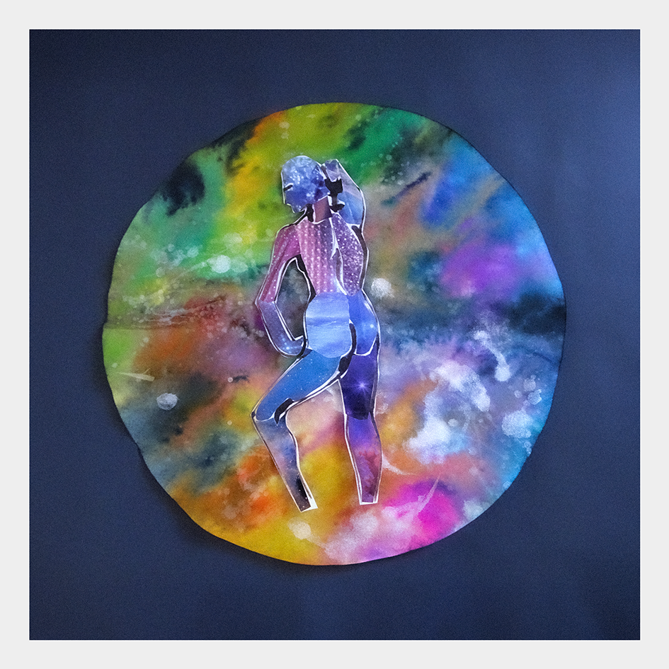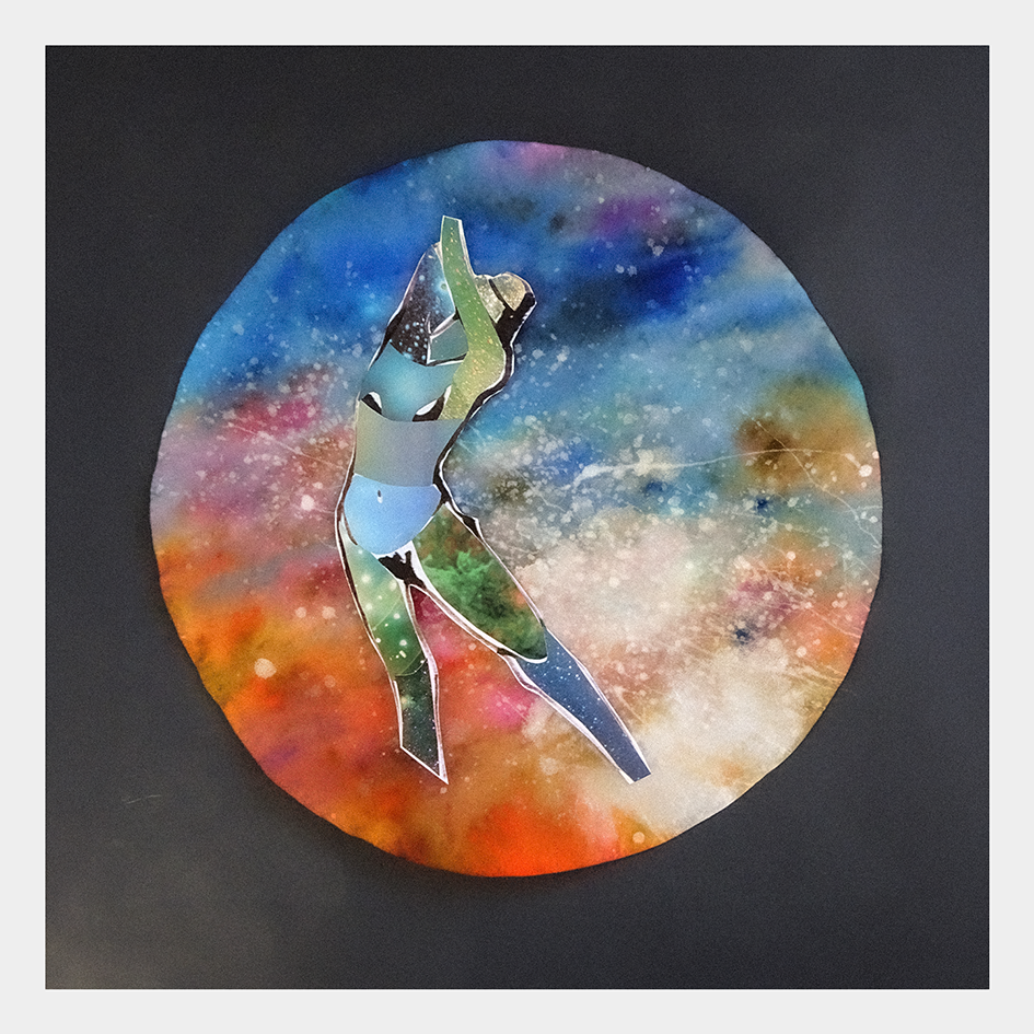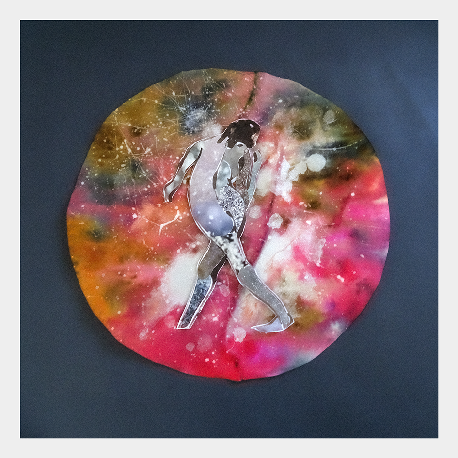 “I had just photographed some of my life drawings from the 70s and I thought they would look good dancing among the (deep space) stars. Of course I had to collage them with stars too, and play with them on top of the new cosmic mandalas I proceeded to paint. This is just a small sampling of the results…”