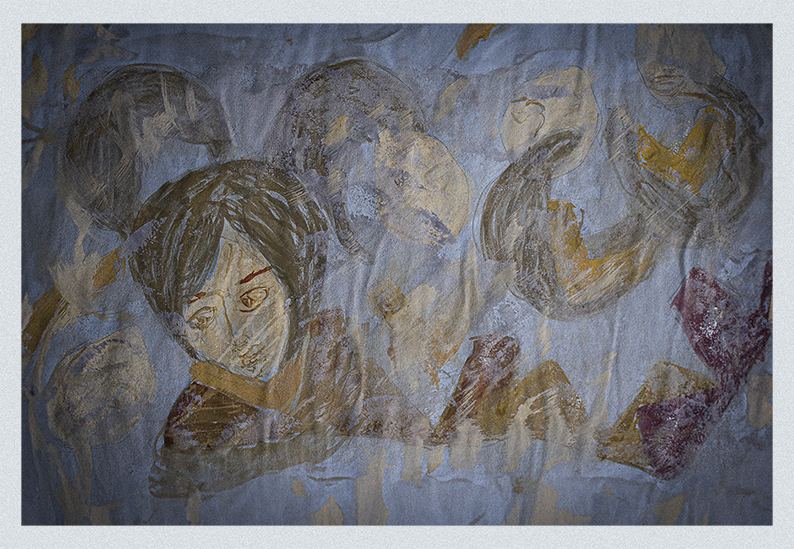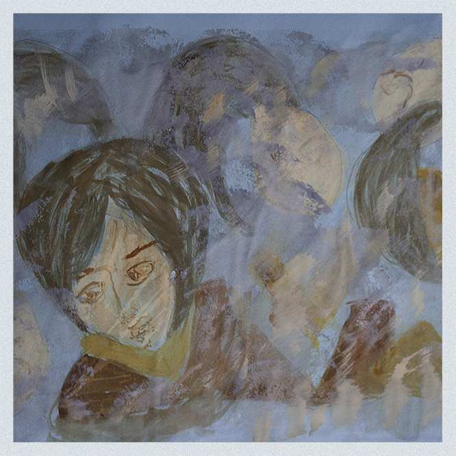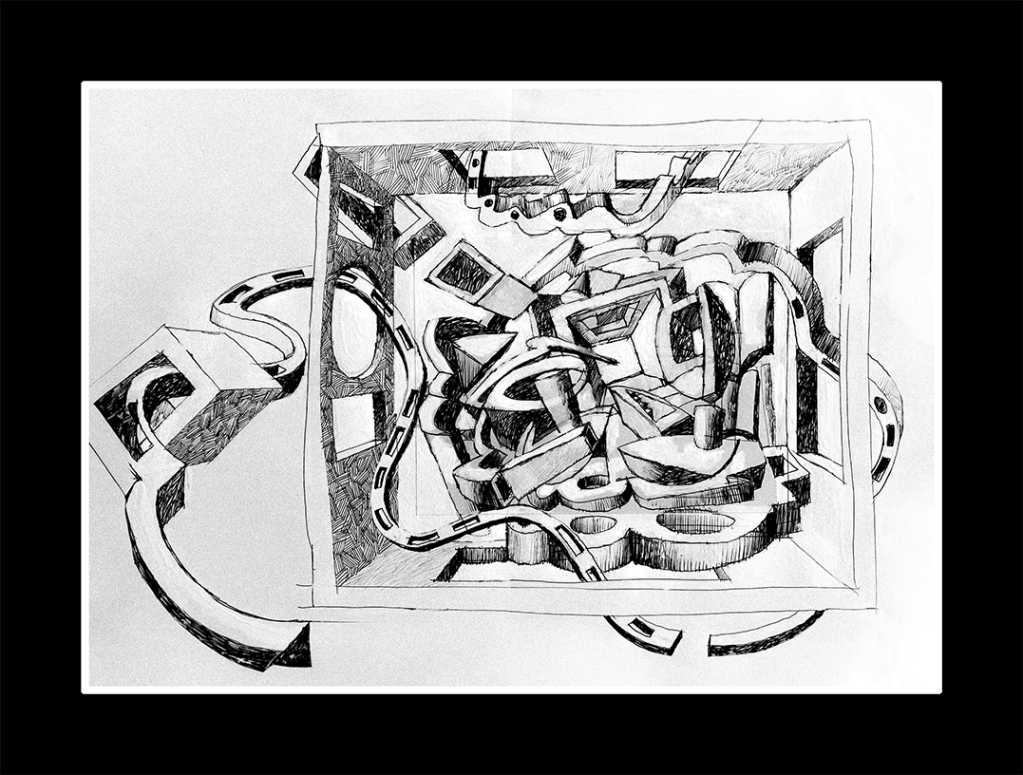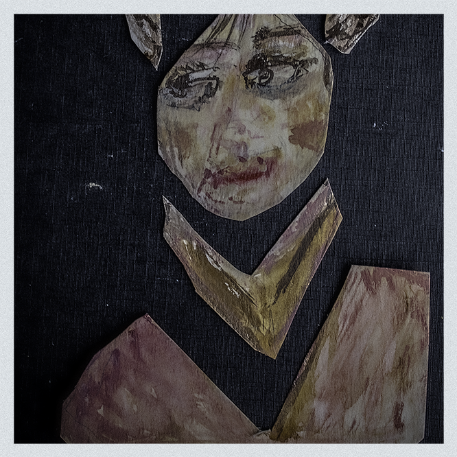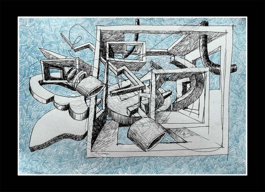 “I had this Narcissus started a month ago – an experiment in combining simple gridded shapes and dense textures – it went on hold with figures that needed development. Mainie Jellett as an art challenge prompt pushed me to include volumes and more pattern in the figures and I added a tree with an abstract posture. Could have been pulled apart and reassembled but I ran out of time.”