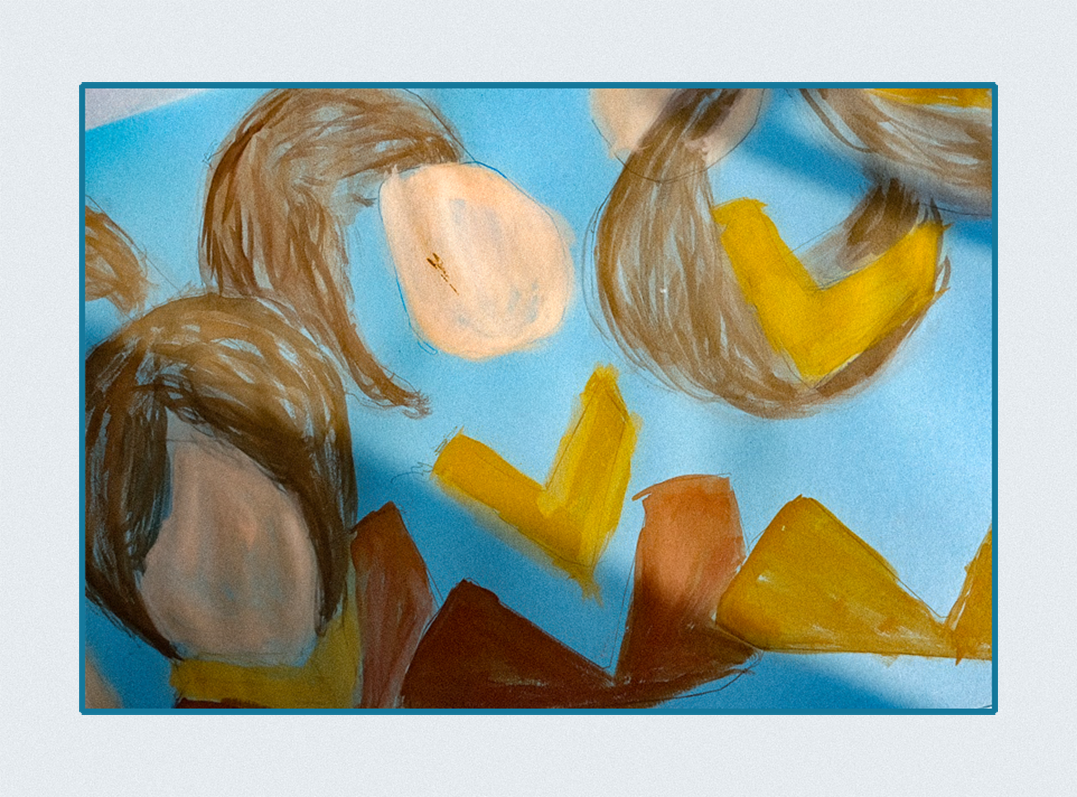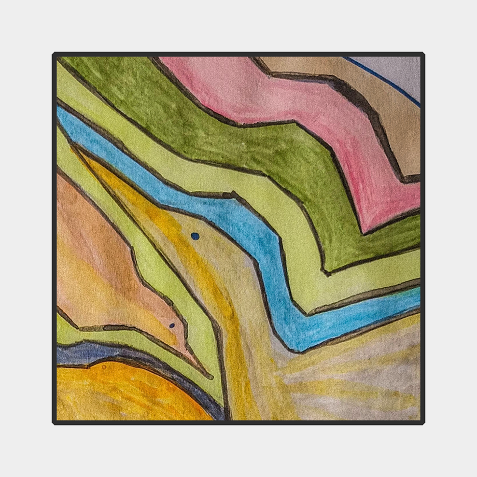 “Mainie Jellett’s artwork clearly shows the stepping stones she uses to move from figurative to abstract, so I thought I’d follow in her footsteps and see where it took me. I took a small watercolour portrait I recently painted and cut it into its constituent parts. These I then used to transfer the shapes to create a more abstract painting. As I worked on this second piece, I took a couple of photos of the developing image. I wanted to calm the colours down and did so in the painting, but I liked the shapes being formed and wanted the simplicity of the interim images to take the project further. I have an app on my computer called StitchFiddler which enables me to convert images into stitch patterns, so I used the photos I had taken, and restricted the number of colours used to create a pattern for a crochet blanket. I have not had time to actually make the final object yet, but the yarn is on order!”