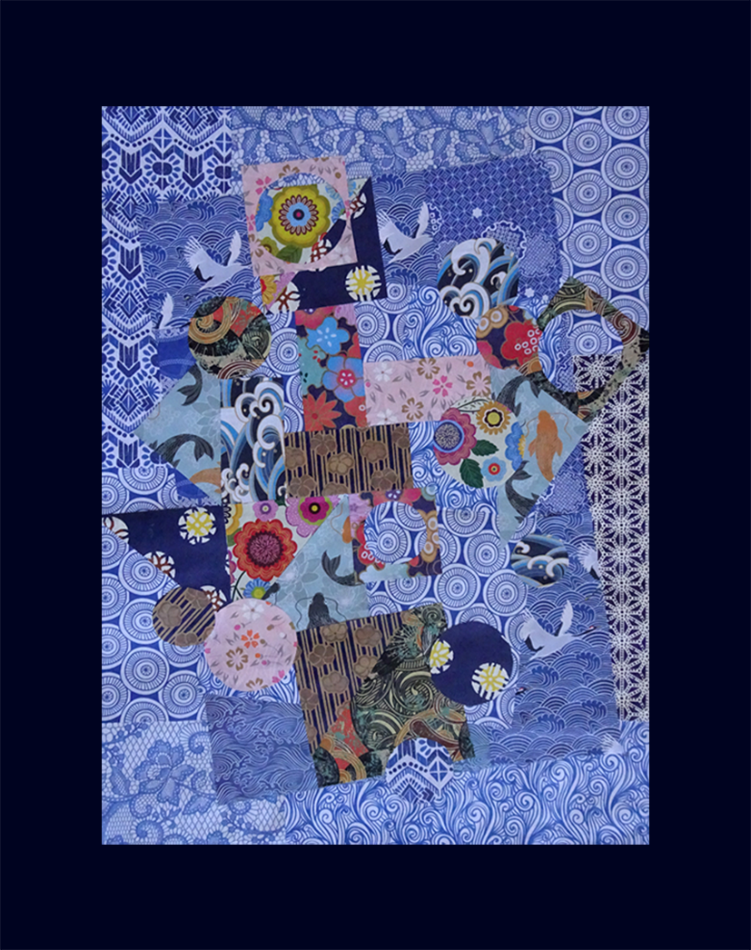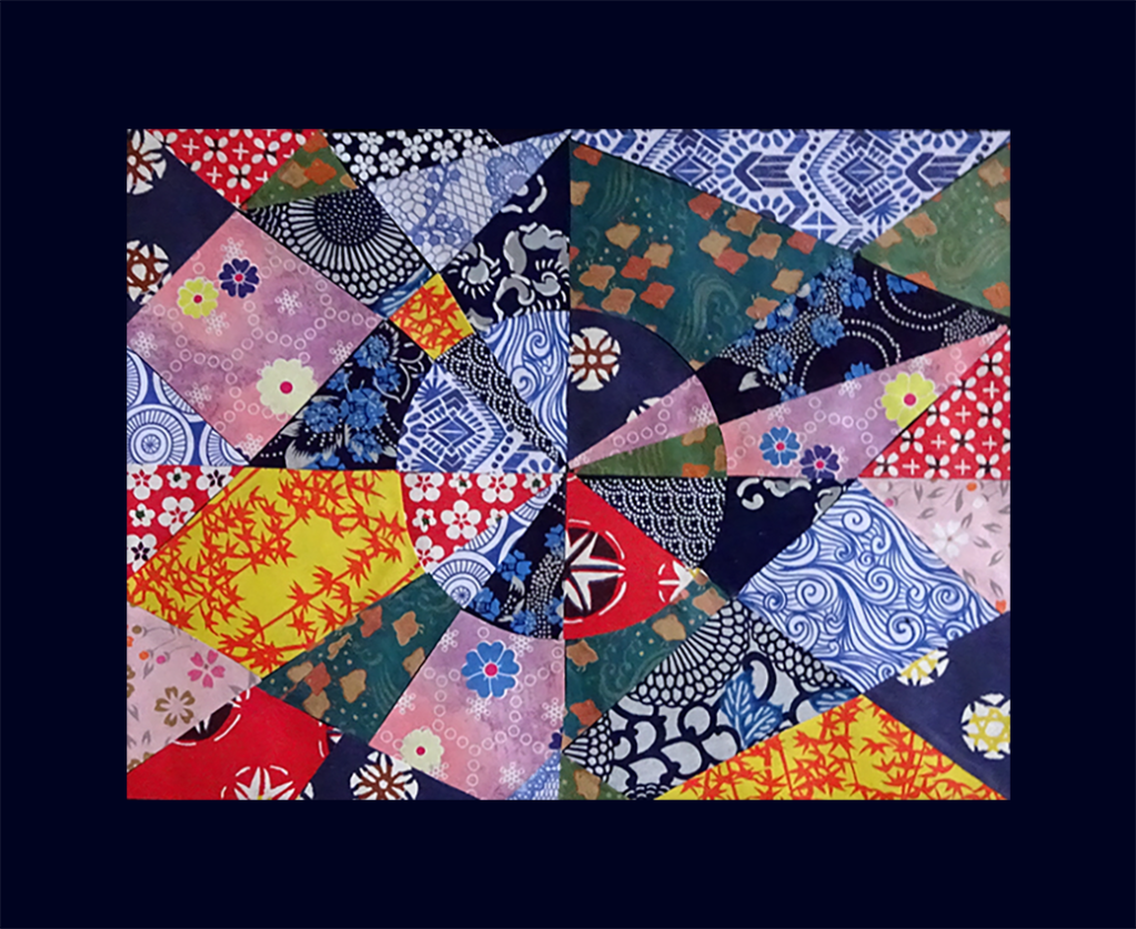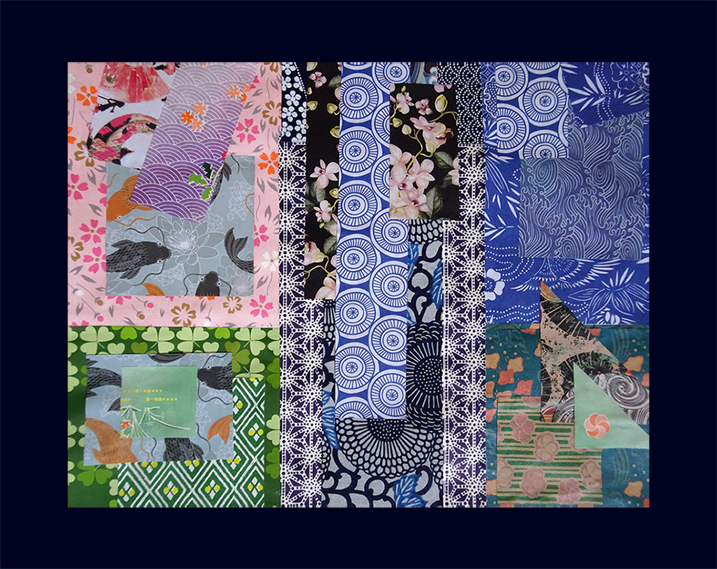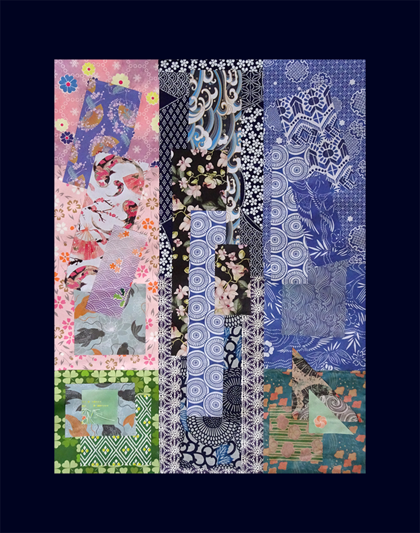 “This artist had many different ways of making art, and so many directions to go. I was most attracted to her “Four Element Composition” which reminded me of layers of origami paper. I did a fairly faithful origami rendition and then branched off from there in two other ways – one less linear, and one more quilt-like. It reminded me how much I like origami paper.”