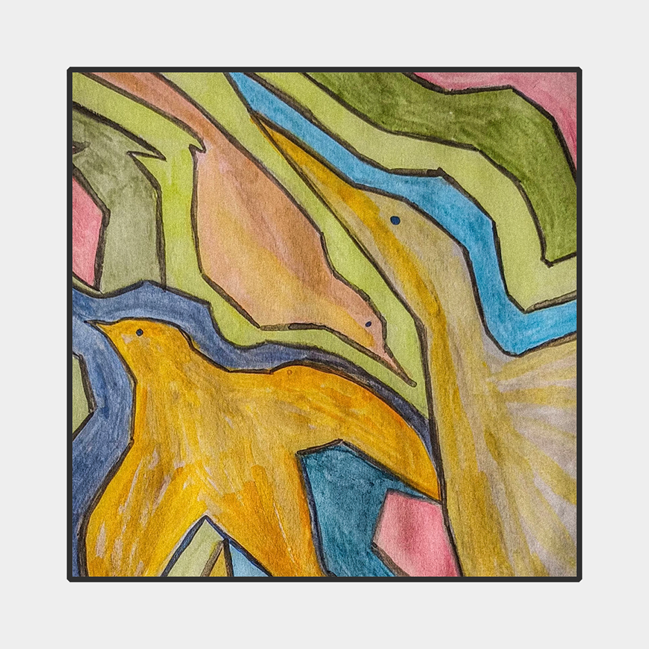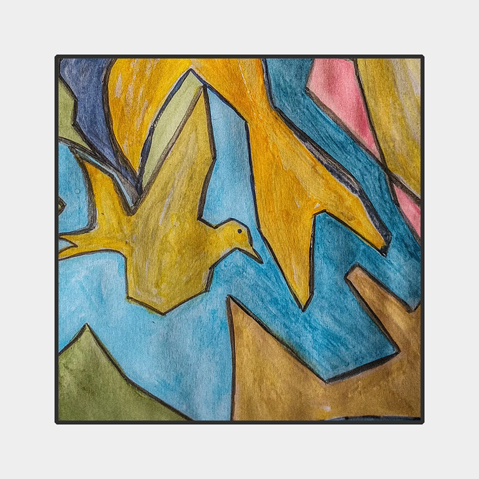“After looking at the work of Mainie Jellet I really liked her painting entitled Achille Horses. I decided to attempt an abstract design of my own but using birds as the subject. The actual picture came to me quite easily but I struggled with the colours. I don’t usually go with such muted shades so it was a bit of a challenge. Eventually it came together and by squaring off corners rather than my habit of rounding off I think it may just have ‘the look!’”