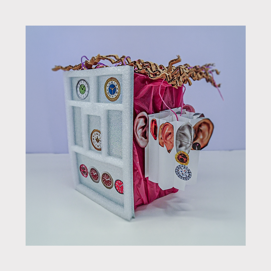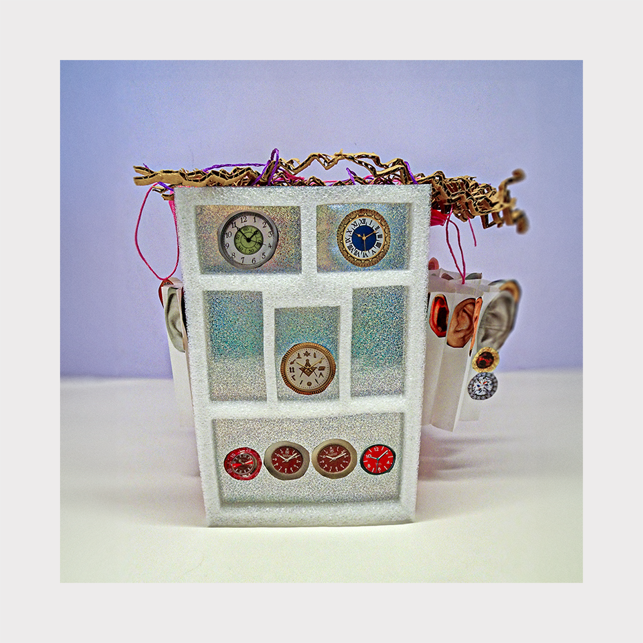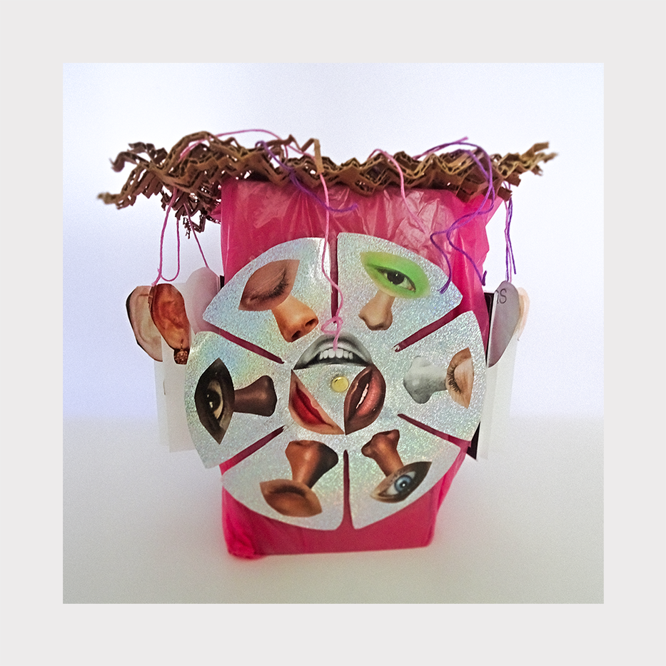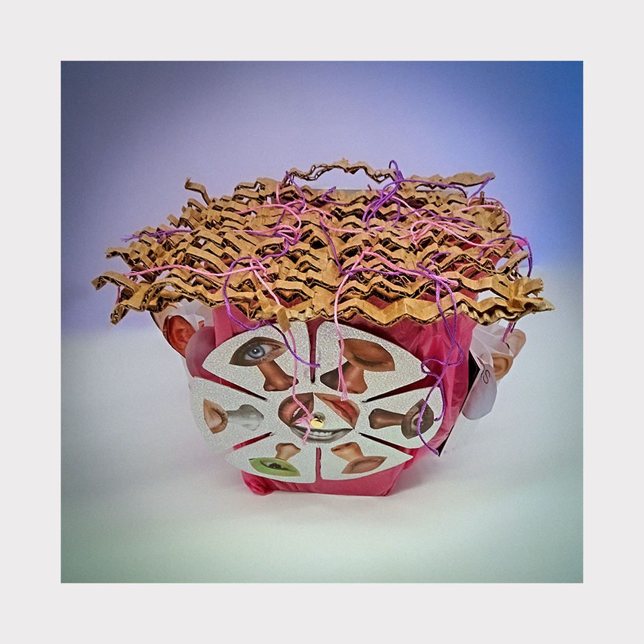 “I’m a low tech person so I made a low tech head. Despite all our technology, we generate a lot of junk—single use items that become garbage. I save many of them with the intention of recycling them somehow into art. Most of what I used for the head come from packing materials to which I added a little bit of collage.”