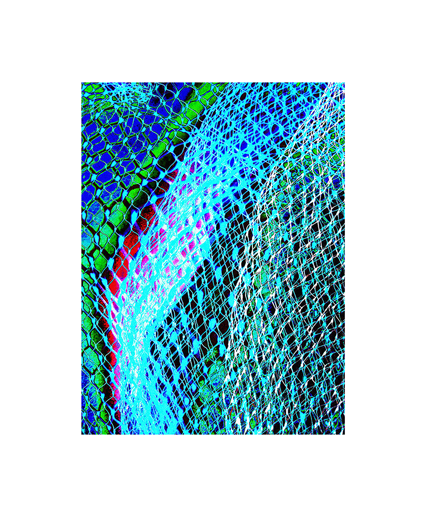 “I have no idea why I have never seen the work of Sheila Hicks before and other women artists of this particular era! What a great discovery. Striking and powerful. Having worked myself within vast architectural spaces and in theatre, I felt a kinship with her idea, attention to spaces and love of masses of colour. I like to see through the colours and the mixing of the layers in relationship to one another as they move, held within a skeletal structure in architectural space. I have been collecting these netting pieces that hold fruit and vegetables and the metal tags that are wound round the end that have been waiting in the wings for an opportunity. Their restriction of colour bothered me at first and yet it was a release to see what i could make with them. They are bouncy and can be twisted into rather wonderful shapes that brought me back to something more organic and lively. Playing with the results on the computer to find new colours was fun if a little bit frustrating as my tech knowledge is rather limited! I was intrigued though about how the overall texture looked more like a tapestry. More food for thought!“