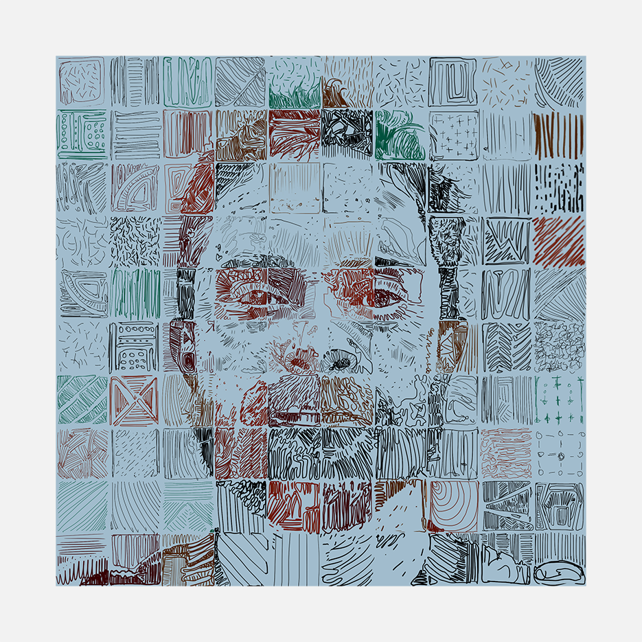“Here’s my little offering for the 100th edition of the mighty Kick-About. Good opportunity to say ‘Jolly good work that man’ for keeping this going! With this one I took the concept of ‘Centum’ and decided to create a self portrait in Photoshop using 100 squares, using one hundred individual ways of representing the information within those squares. Riffing slightly on the work of Chuck Close, I saw this as a good opportunity to explore this method of looking at the macro via small and often detached decisions in the micro level.“