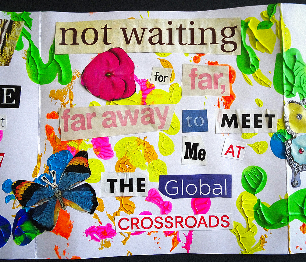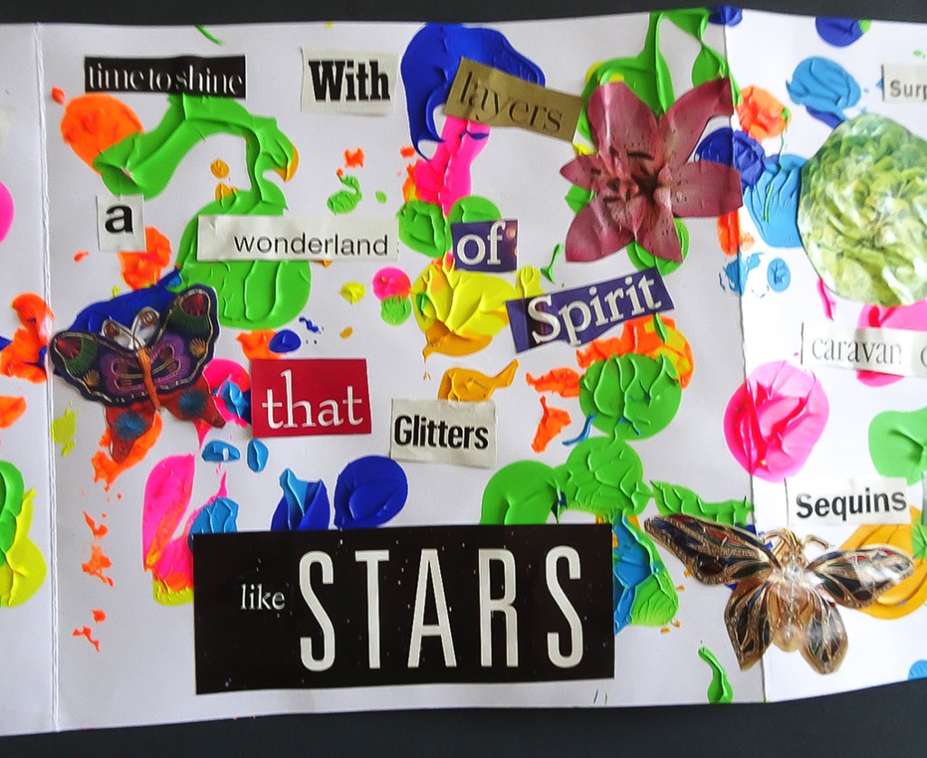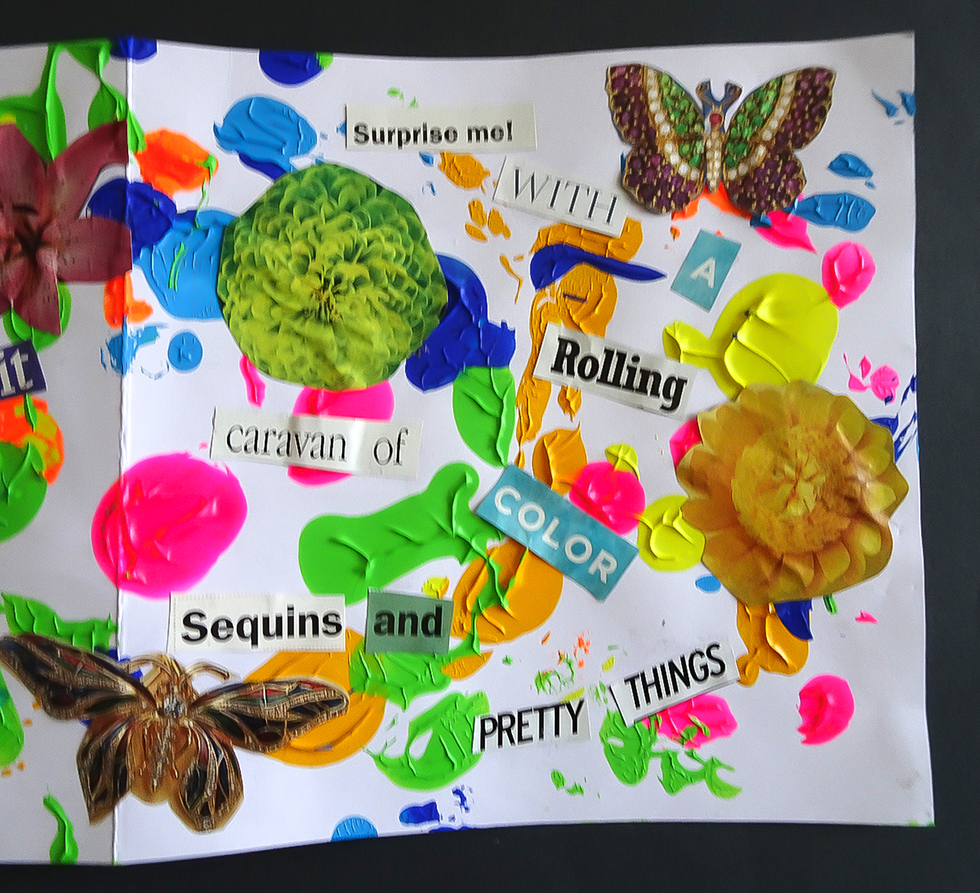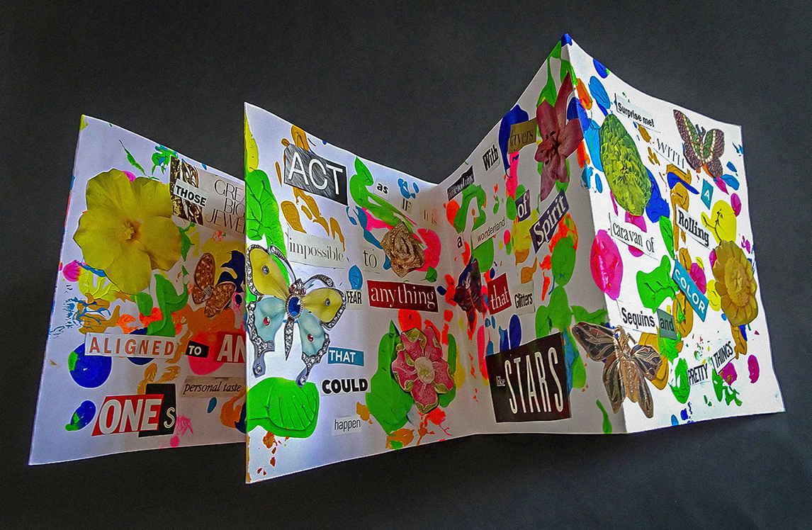 “I have all these blank accordion books my daughter gave me, so I decided to make one by monoprinting the bright carnival colors and consulting the collage box oracle for some short poetry in the spirit of the celebration. I then added some collage flowers and butterflies, both being Aztec motifs used on the costumes. I only put words on one side, but I may decorate the other side more at a later date.”