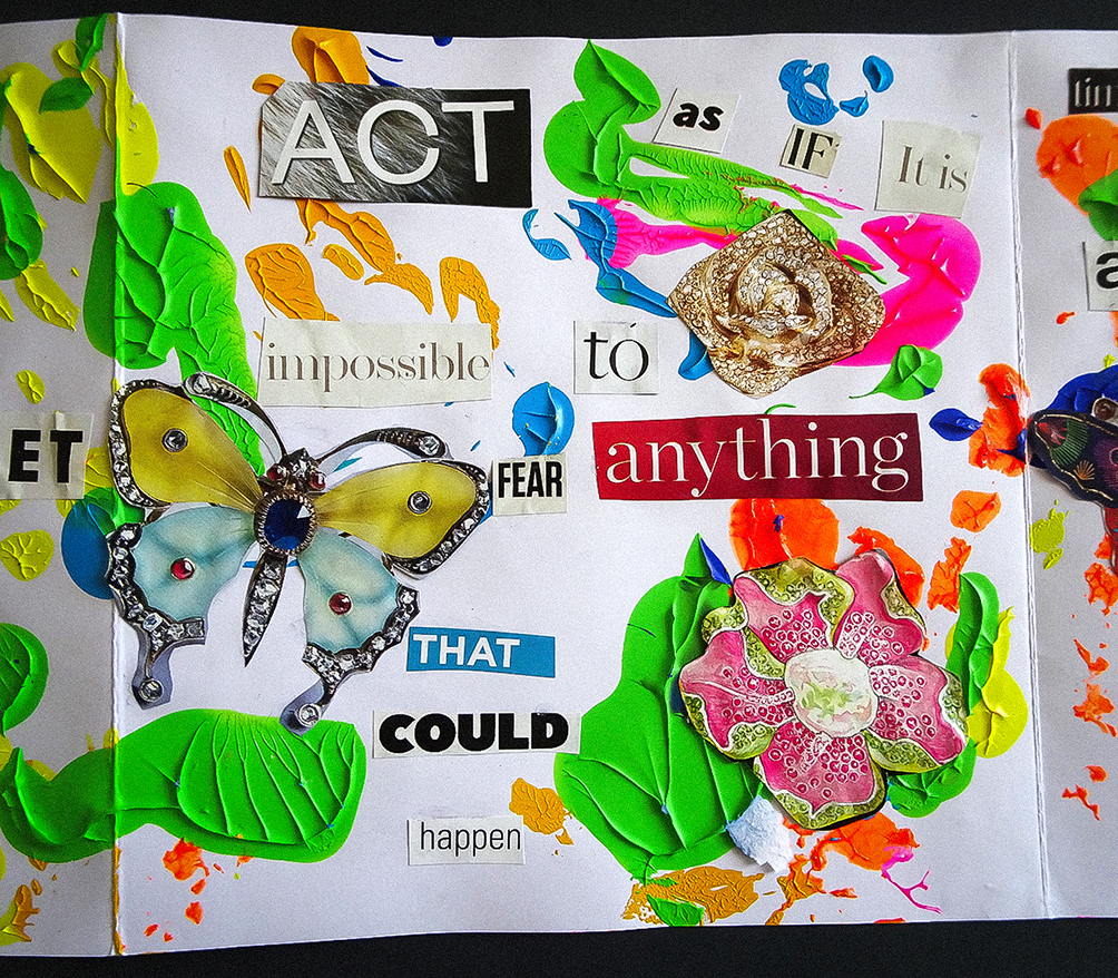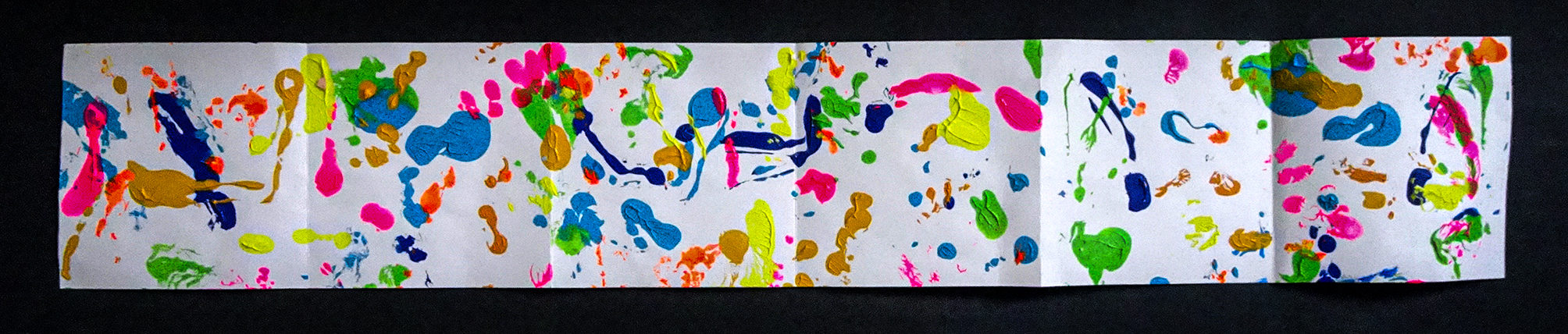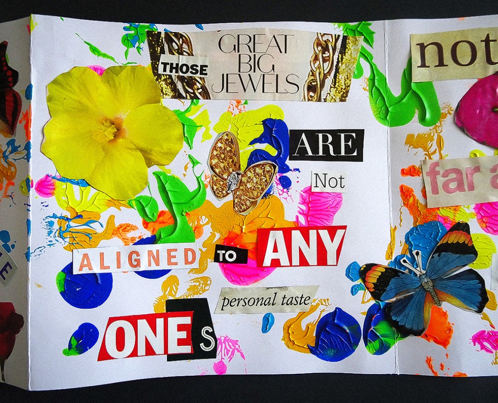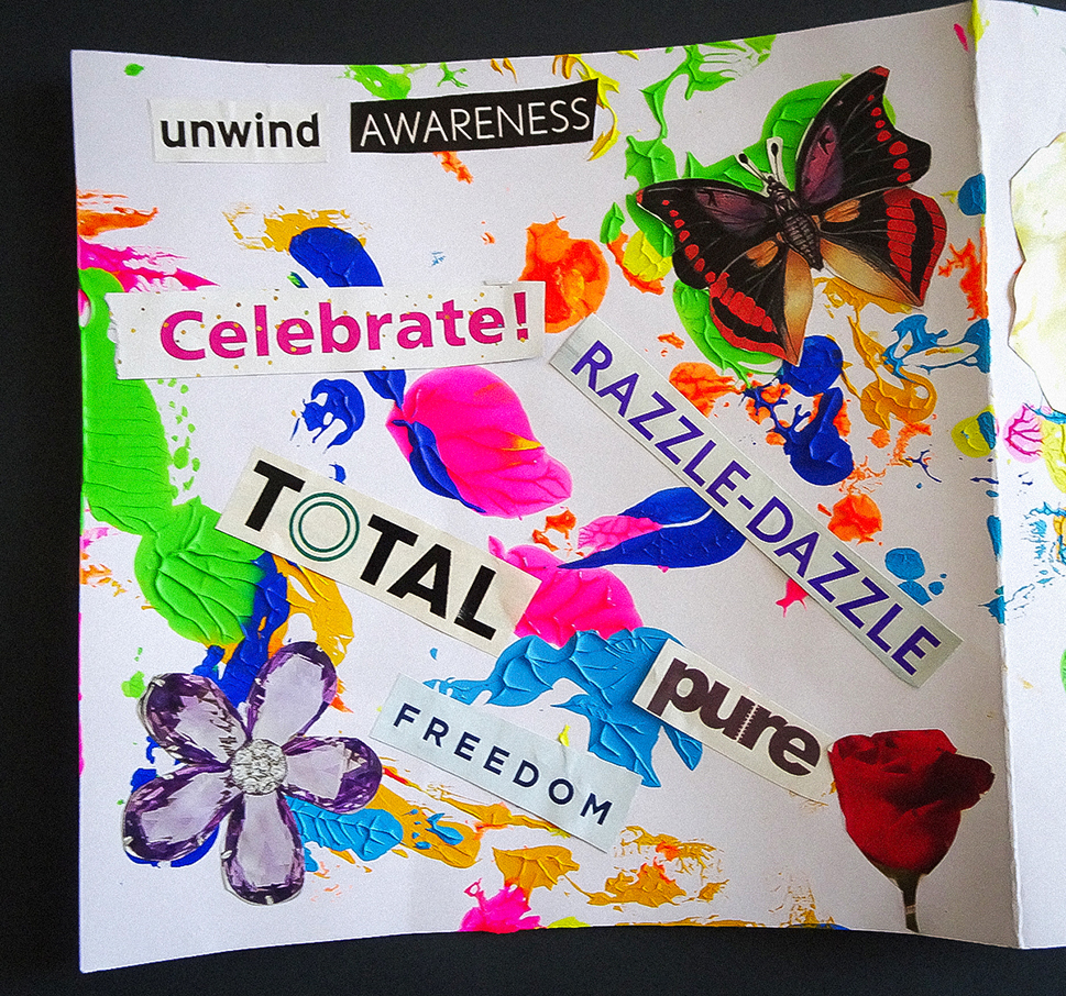 “I have all these blank accordion books my daughter gave me, so I decided to make one by monoprinting the bright carnival colors and consulting the collage box oracle for some short poetry in the spirit of the celebration. I then added some collage flowers and butterflies, both being Aztec motifs used on the costumes. I only put words on one side, but I may decorate the other side more at a later date.”