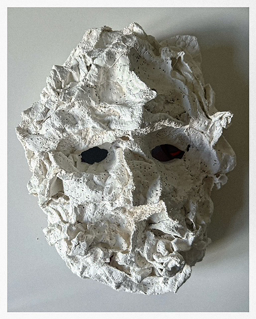 “I love how the Chinelos tradition used mask, costume and dance to mock the European colonials. I‘m sure they deserved much worse! I never need more than half an excuse to make a mask. I think I‘ve made masks for the KA twice before and this week I‘ve made another one. This one is plaster bandages laid over tape stuck on a basic mask form. I was going to paint it, as I love the highly coloured Chinelos costumes, but then I decided I liked it plain white, which shows off the texture quite nicely. Wearing the mask is strange; a bit claustrophobic, and also quite liberating, I feel like an actor, I can be somebody else. I think my husband is getting used to my Kick-About antics these days, although I haven’t got him to wear the masks… yet!“