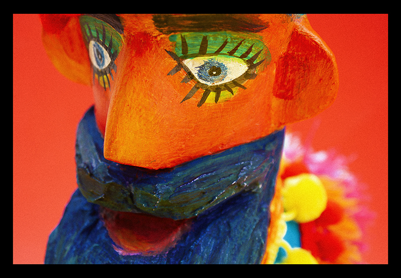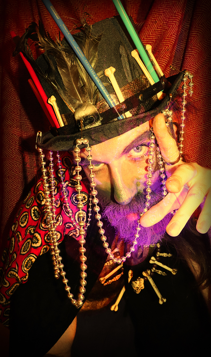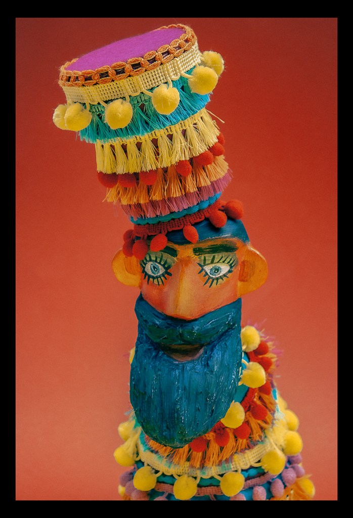 “I used what I had for this photoshoot inspired by those colourful Chinelos. My throw blanket dropped over the front of my wardrobe made for a handy backdrop. Previous halloween costumes coupled with some colouring pencils and Christmas decorations adorned the hat held together with safety pins to create some Boy George/Jamiroquai hybrid. Green and purple face-paint I previously used for a Beetlejuice costume was painted on my face and beard. A cheap but powerful sunset lamp lit the scene and set the vibe. I had a fucking blast doing this and becoming a character.”