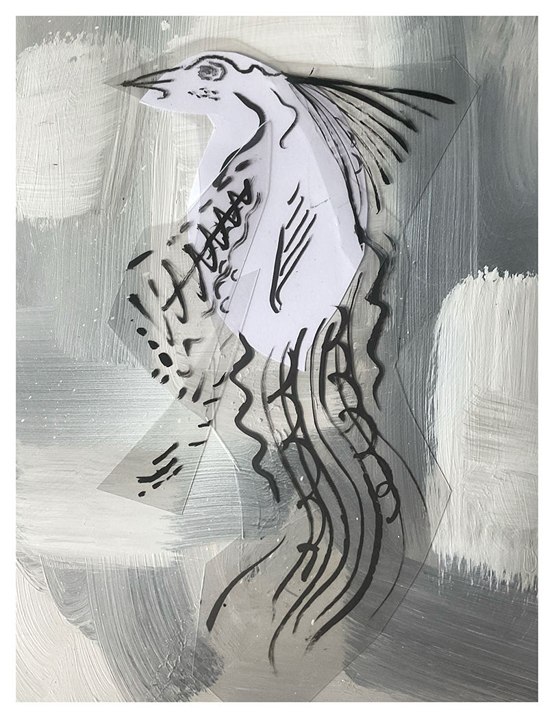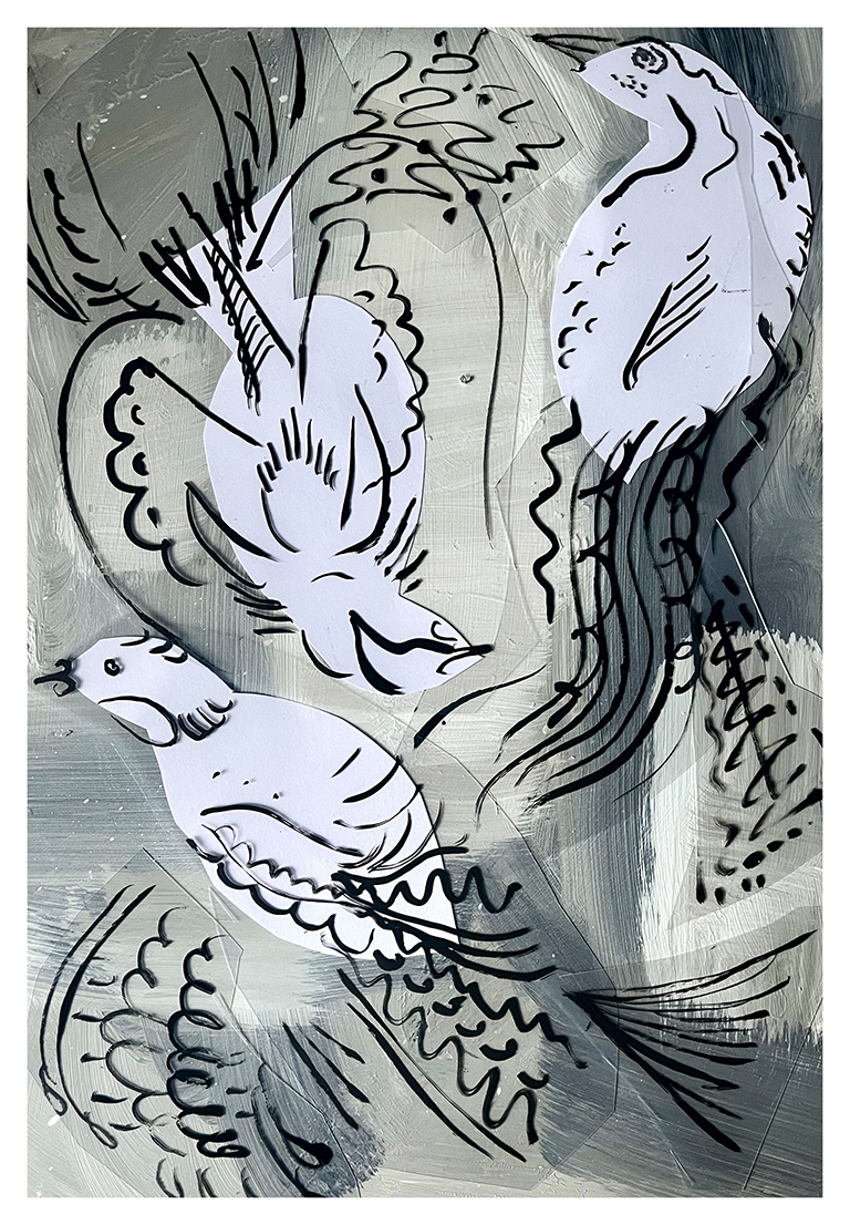 “I remember looking at pictures of birds-of-paradise when I was a kid, marvelling at the intensity of the colour and the beauty of the feathers. Then I‘d look in the garden and see a few brown sparrows hopping about and go oh, why do I live somewhere so boring! I‘ve gone monochrome with this prompt (as I often do) and tried to simplify the festoons of feathers and jazzy shapes to make a sort of mid-century modern wallpaper design. Not sure why I‘ve gone in this direction, sometimes it just goes its own way. I painted an abstract background, cut out some basic bird shapes from paper and then drew on transparent acrylic sheet which I laid on top. I love how the paint skids around on the plastic sheet, you have to be quick and decisive; not my comfort zone!”