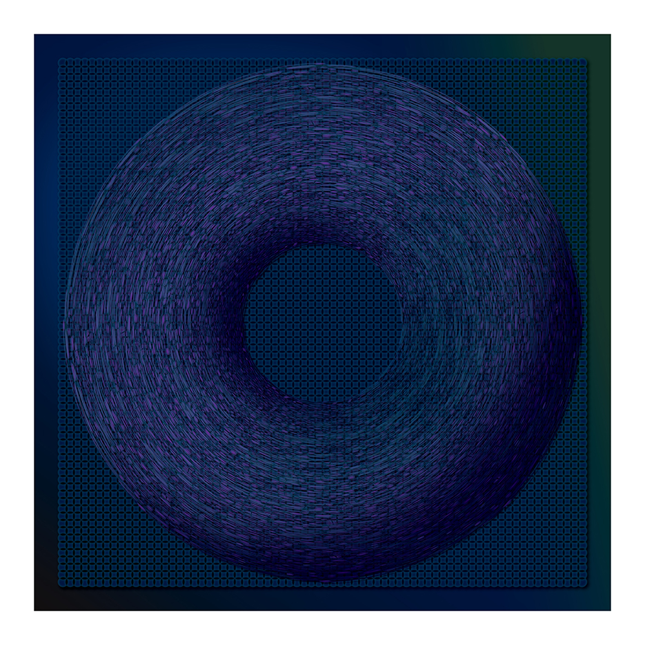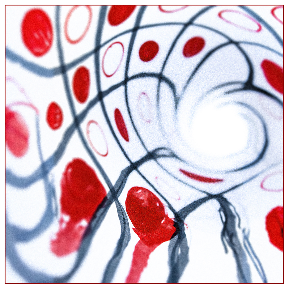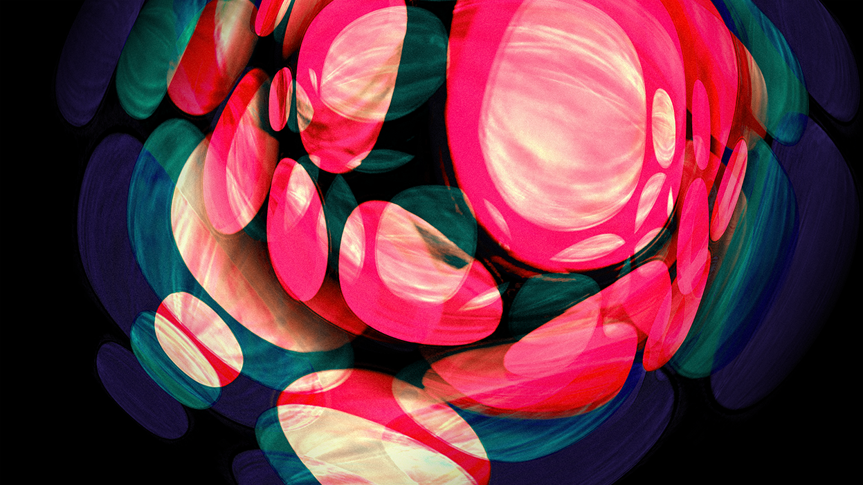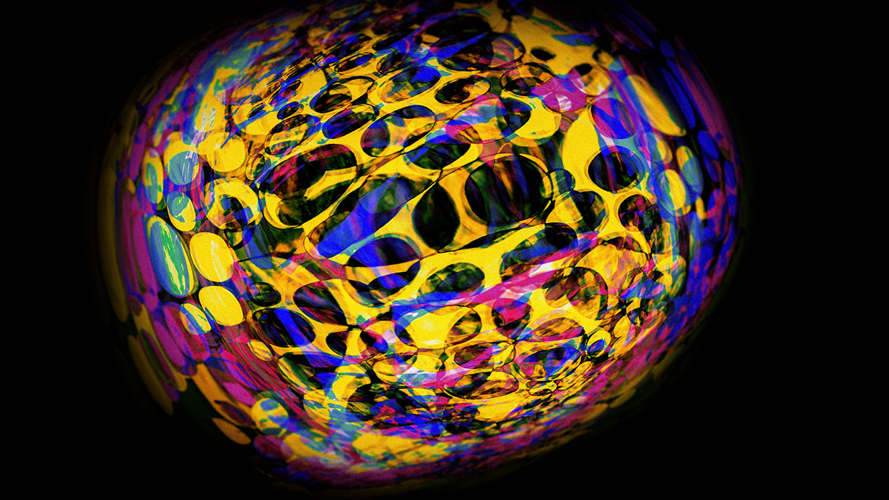 “I was drawn to the tumescence of some of Vasarely’s op-art – that slight sense they give of deformations produced by swelling—of blisters, goitres, galls and burls. I’ve got these big glass paper-weight things that are filled with suspended bubbles, and these images began with me filming them on my 4K webcam as I spun them through 360 degrees… I was then able to process the footage through various types of layering and manipulation to produce these resulting images. Some of them are very organic in a ‘Fantastic Voyage’ style, while others were nudging nicely towards ‘Pearl and Dean.’”