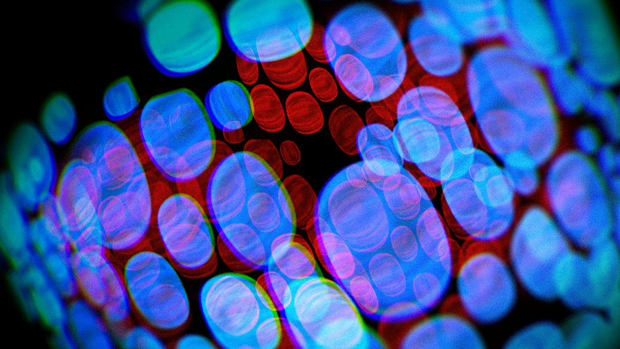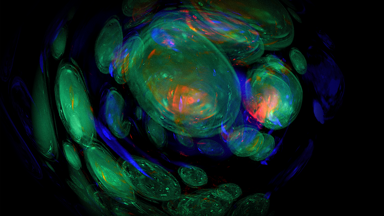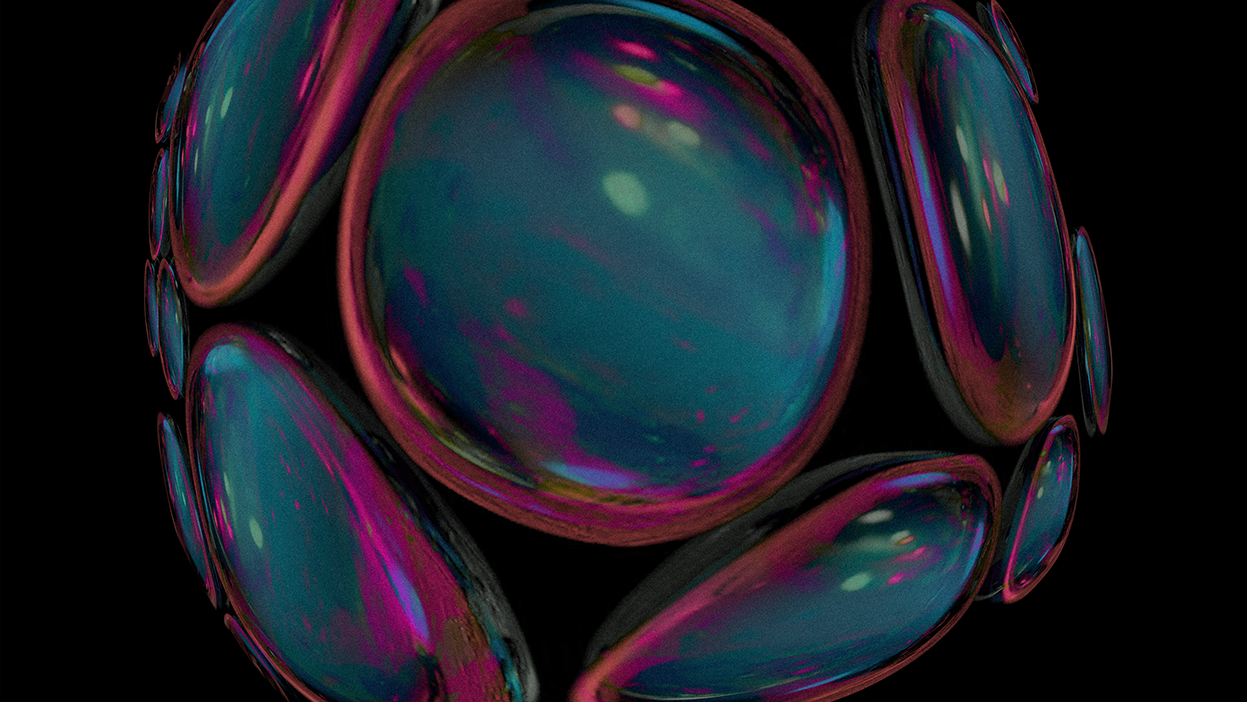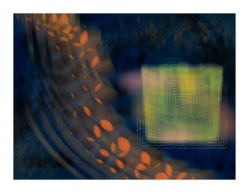 “I was drawn to the tumescence of some of Vasarely’s op-art – that slight sense they give of deformations produced by swelling—of blisters, goitres, galls and burls. I’ve got these big glass paper-weight things that are filled with suspended bubbles, and these images began with me filming them on my 4K webcam as I spun them through 360 degrees… I was then able to process the footage through various types of layering and manipulation to produce these resulting images. Some of them are very organic in a ‘Fantastic Voyage’ style, while others were nudging nicely towards ‘Pearl and Dean.’”