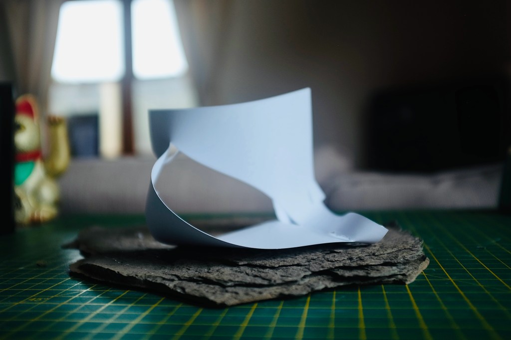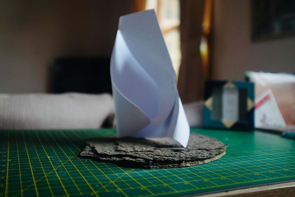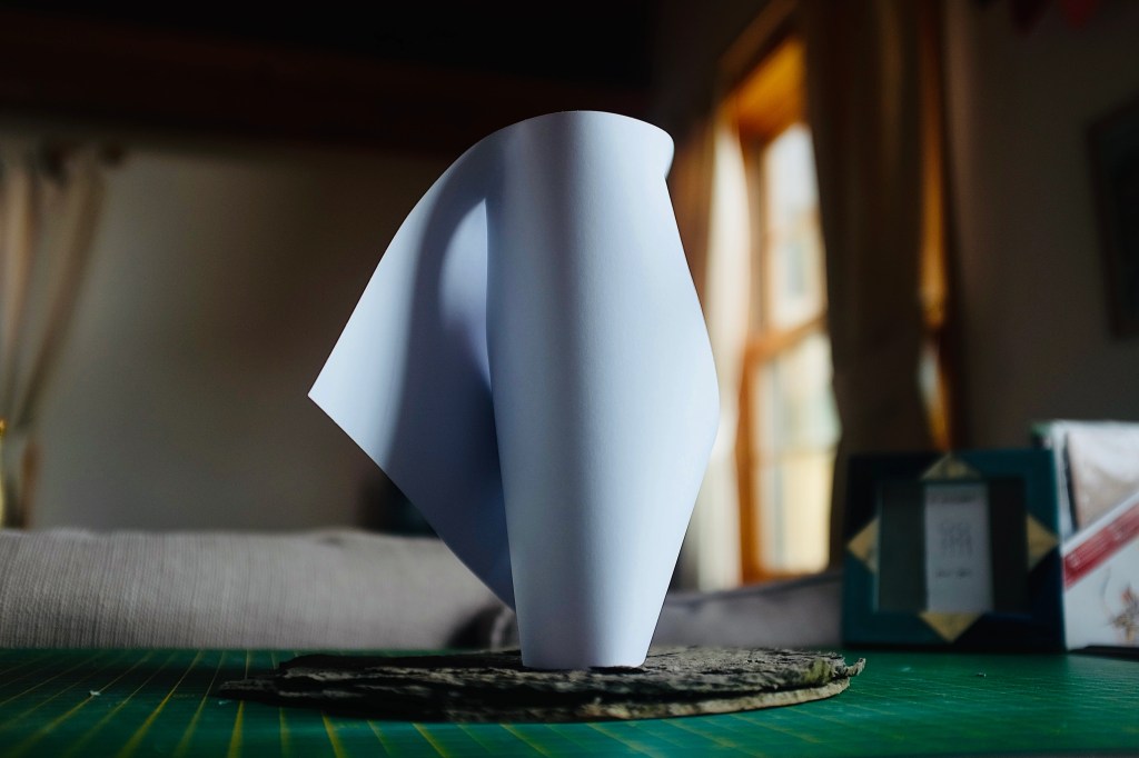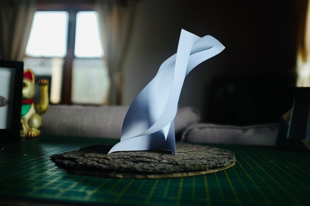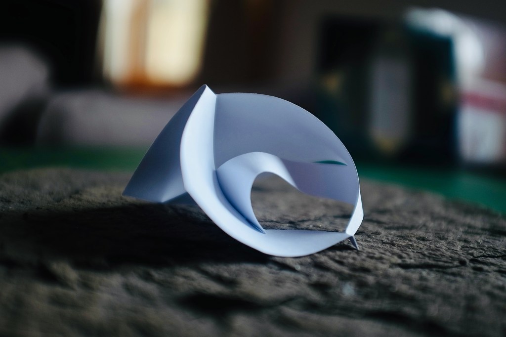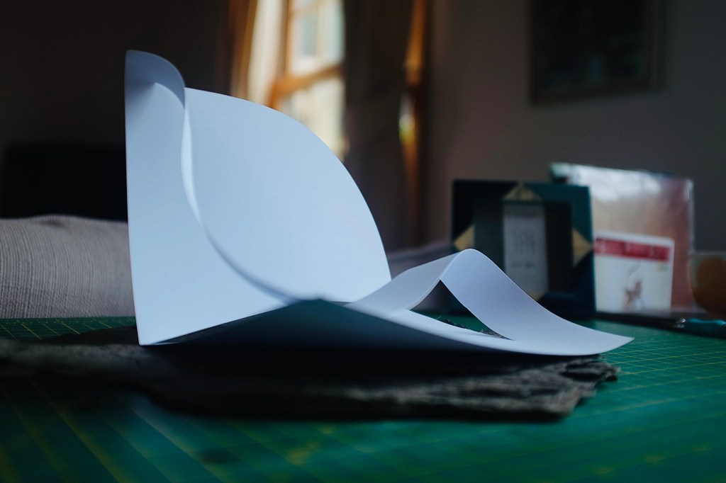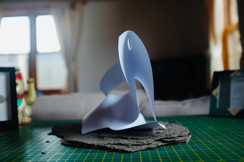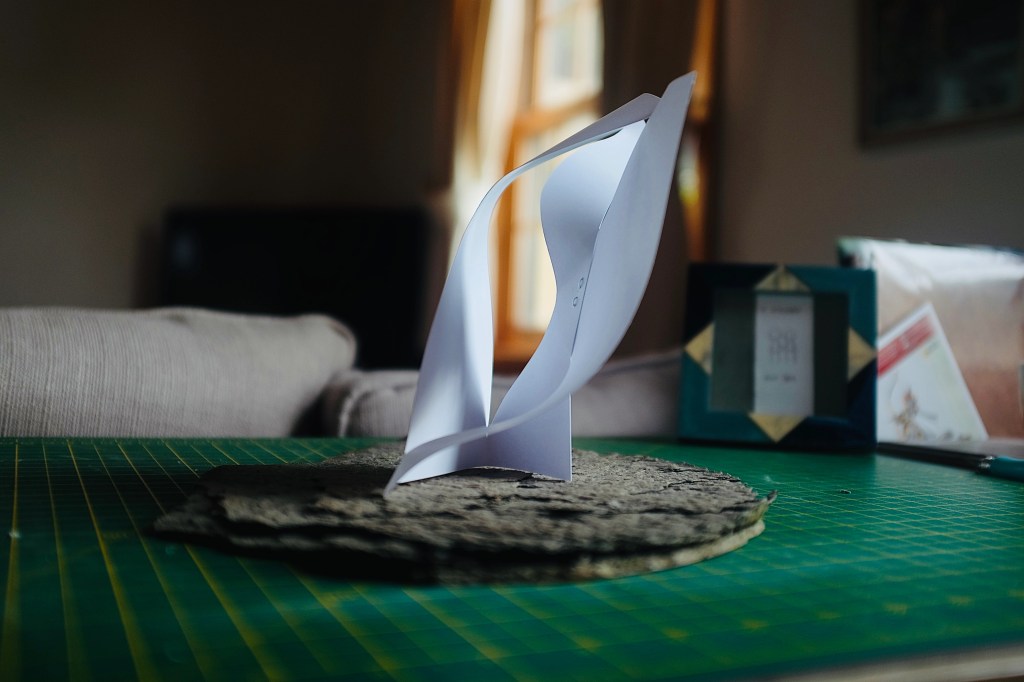 “I found that so many of Vasarely’s illusionary images read to me as warped planes of bulging structures. Foundations of worlds that boasted buildings stuck in a wonderland-like state of the uncanny. With this nugget of inspiration firmly lodged into place, I took to creating some warped forms of my own from heavy card stock, a crafting knife, and a ferociously reliable stapler – hoping that the rippling forms would play into my search for pavilions constructed from illusion…”