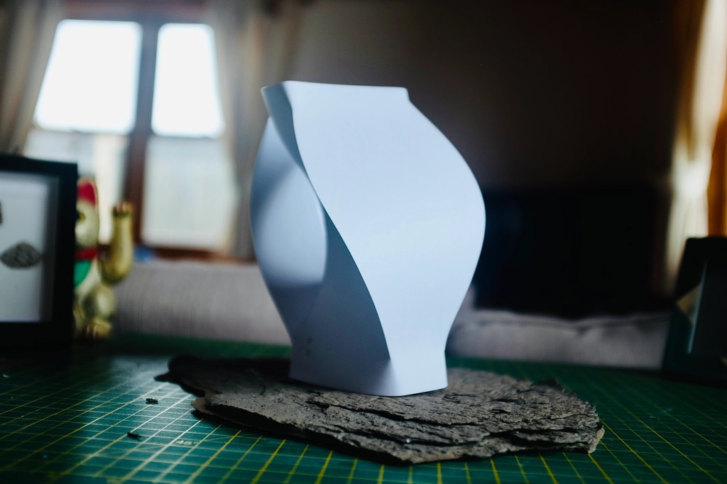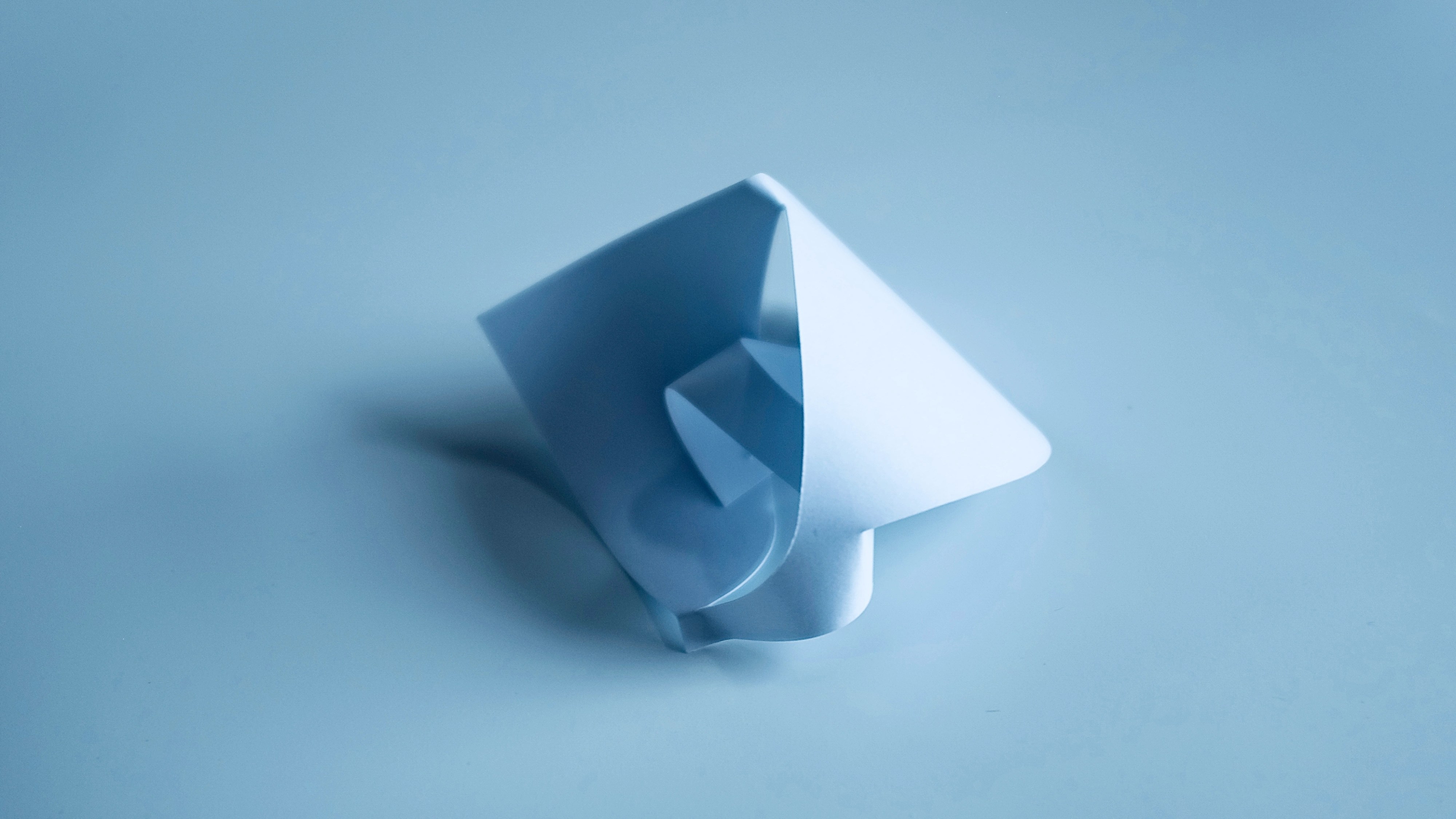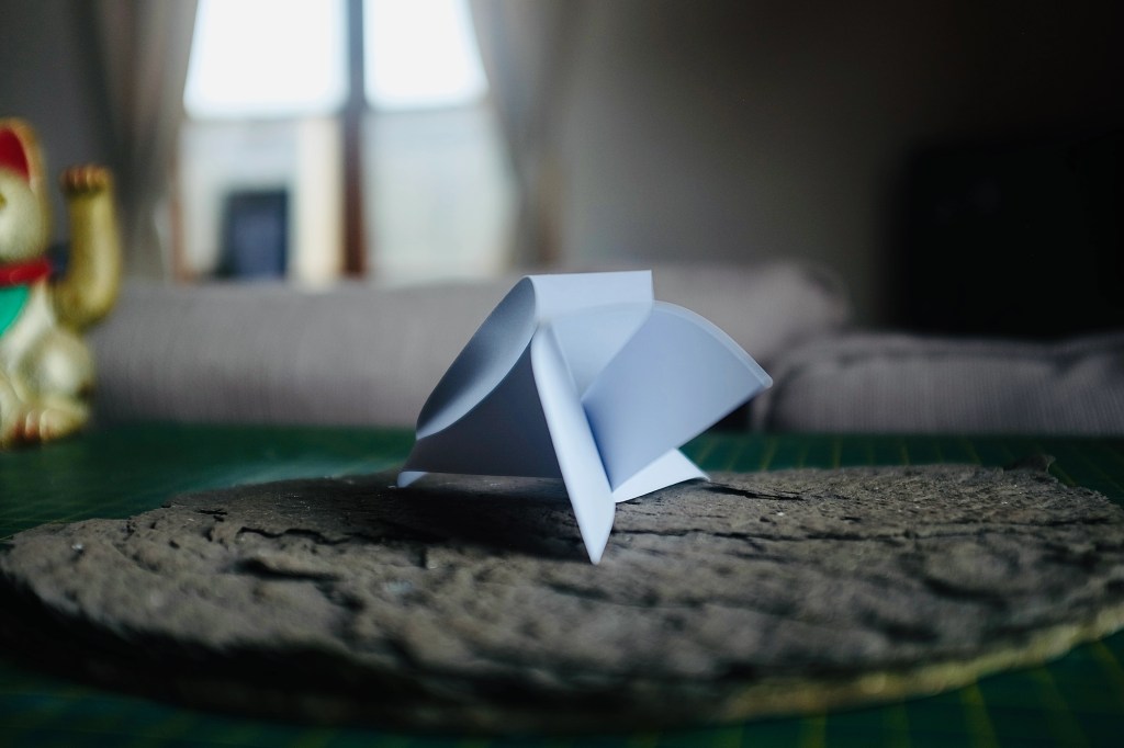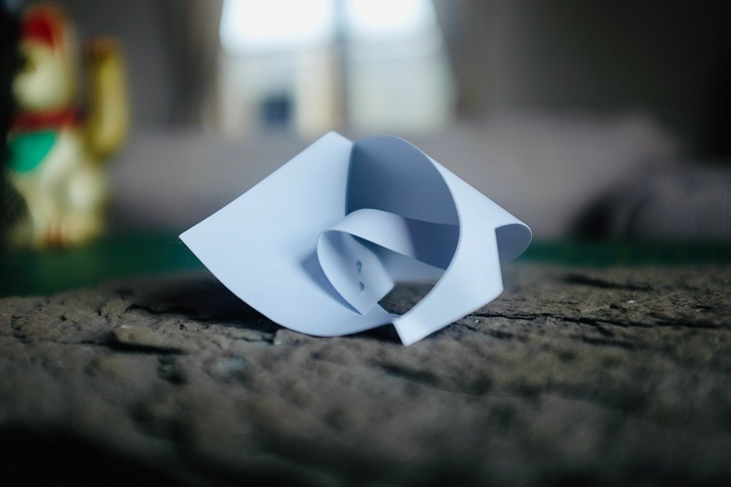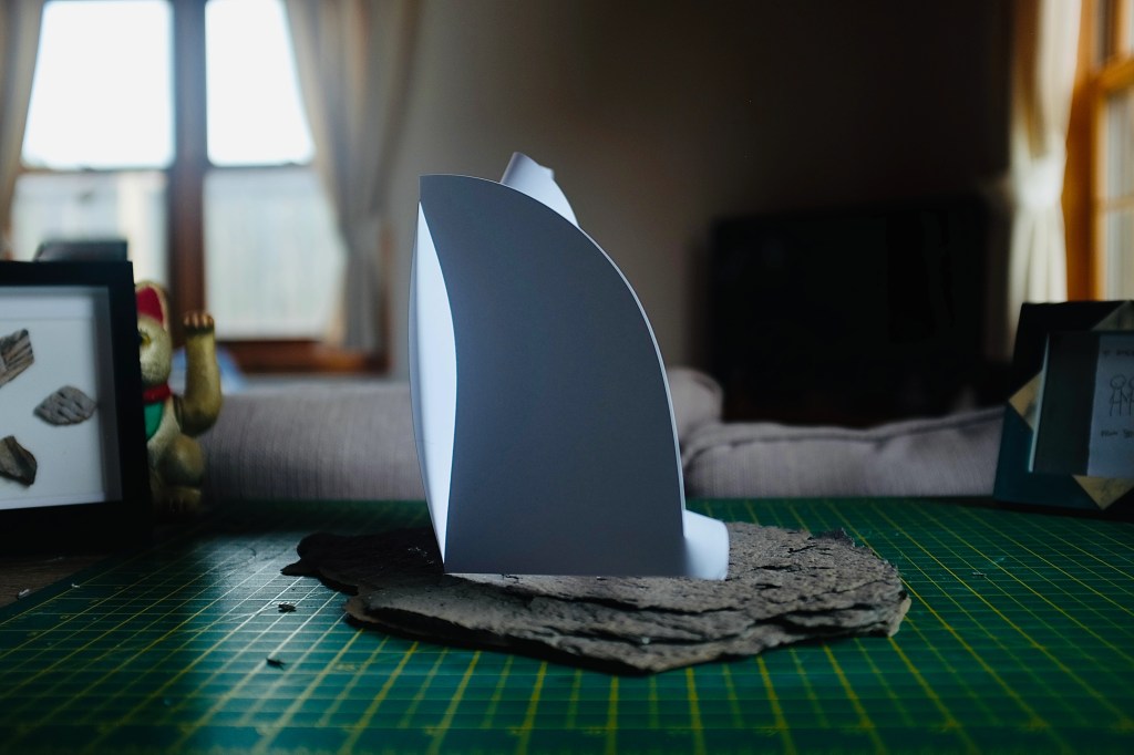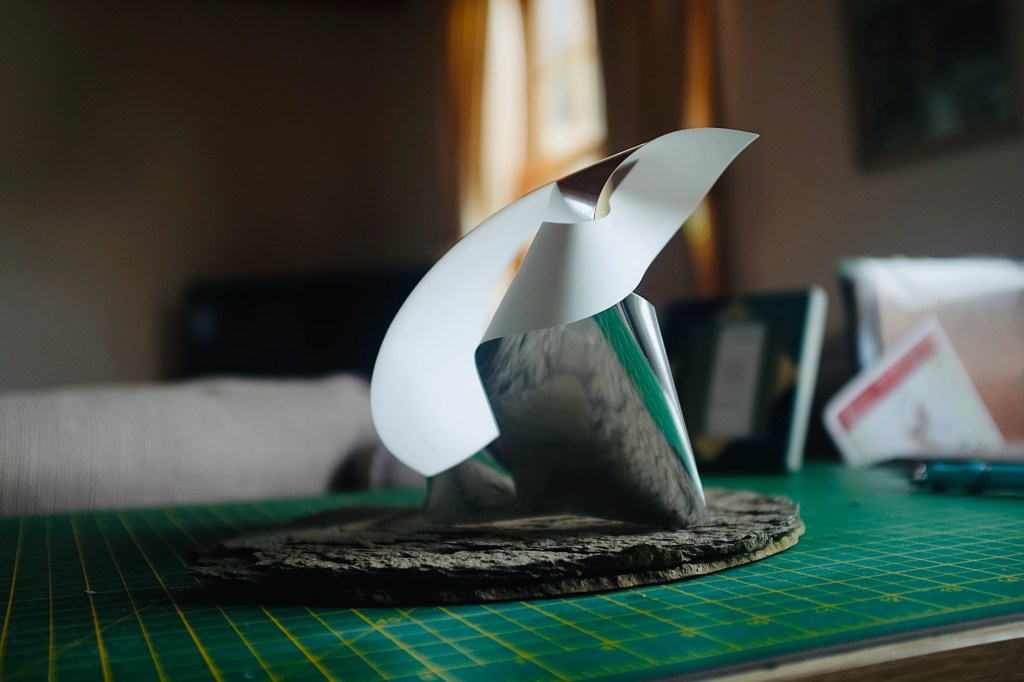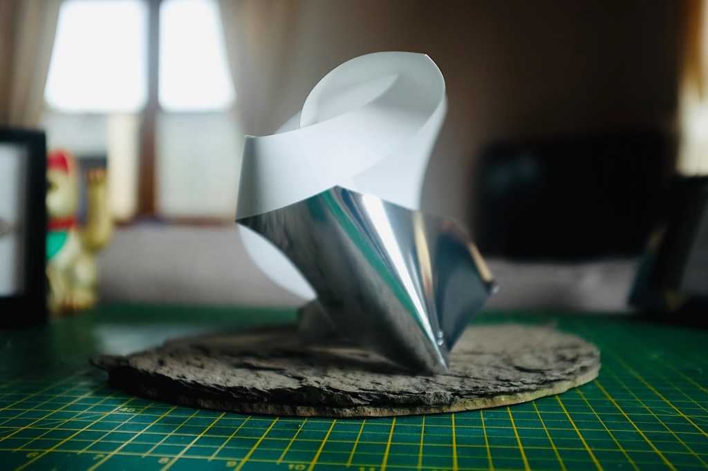 “I found that so many of Vasarely’s illusionary images read to me as warped planes of bulging structures. Foundations of worlds that boasted buildings stuck in a wonderland-like state of the uncanny. With this nugget of inspiration firmly lodged into place, I took to creating some warped forms of my own from heavy card stock, a crafting knife, and a ferociously reliable stapler – hoping that the rippling forms would play into my search for pavilions constructed from illusion…”