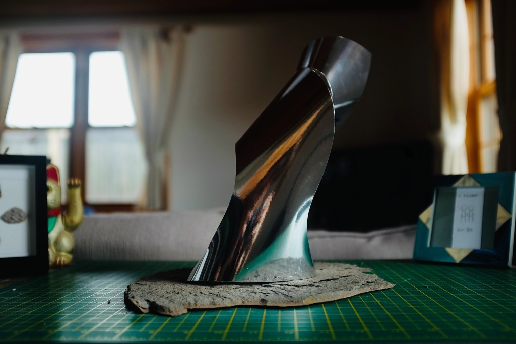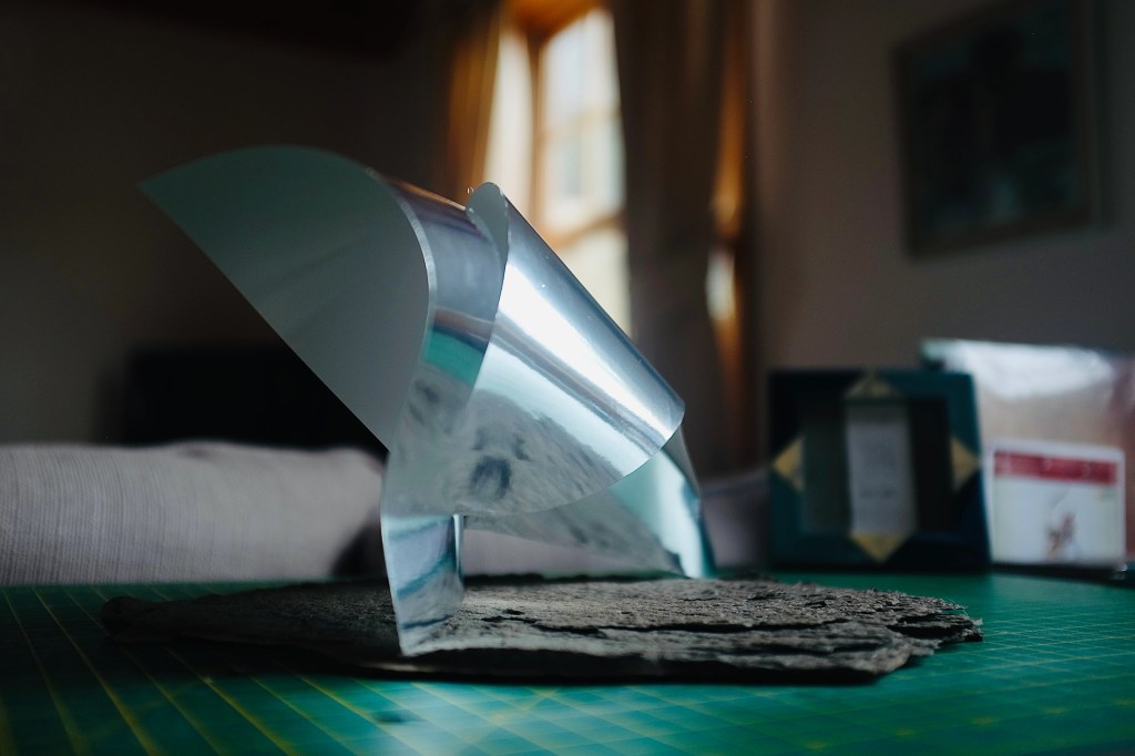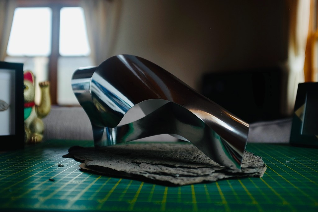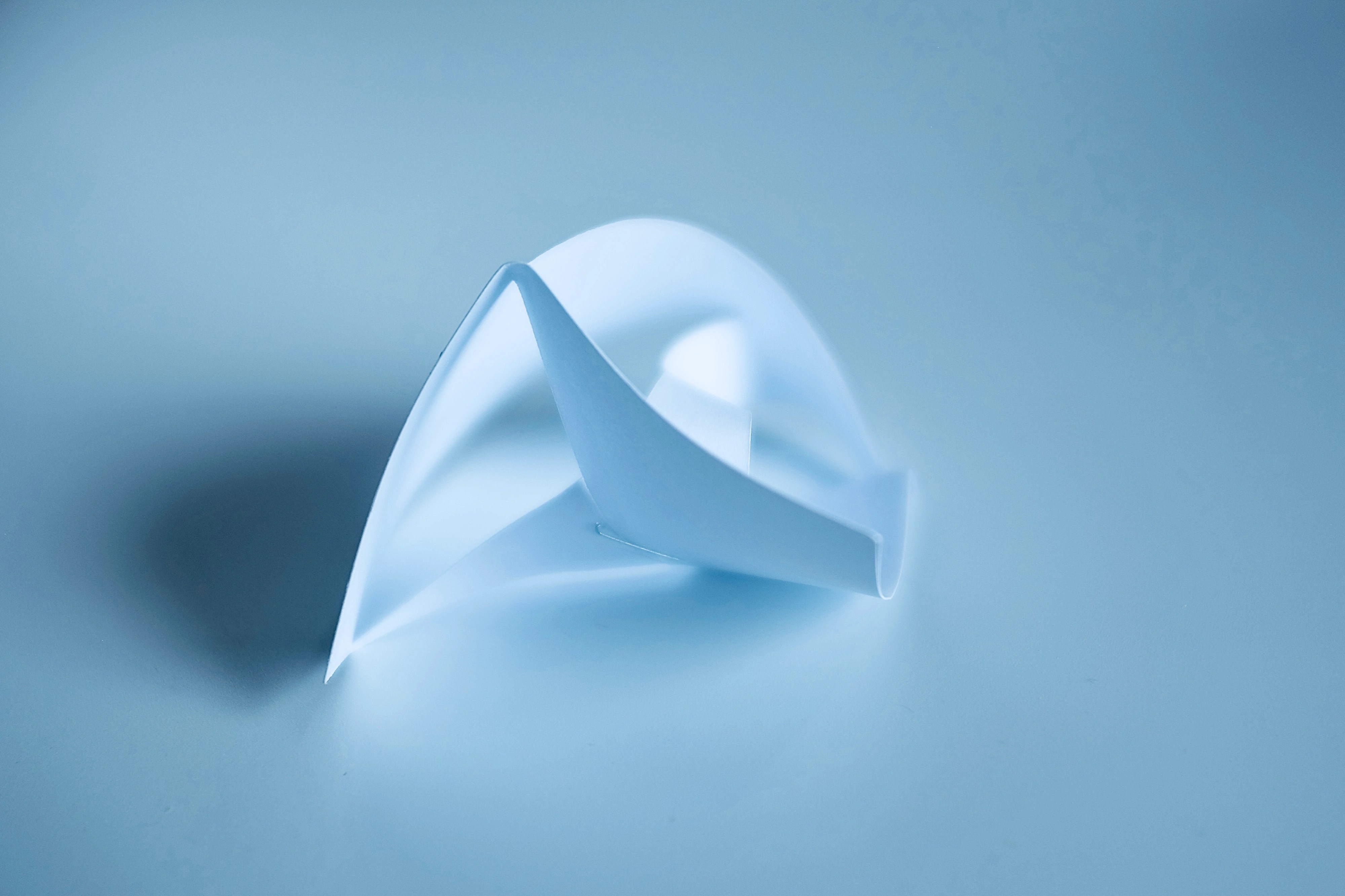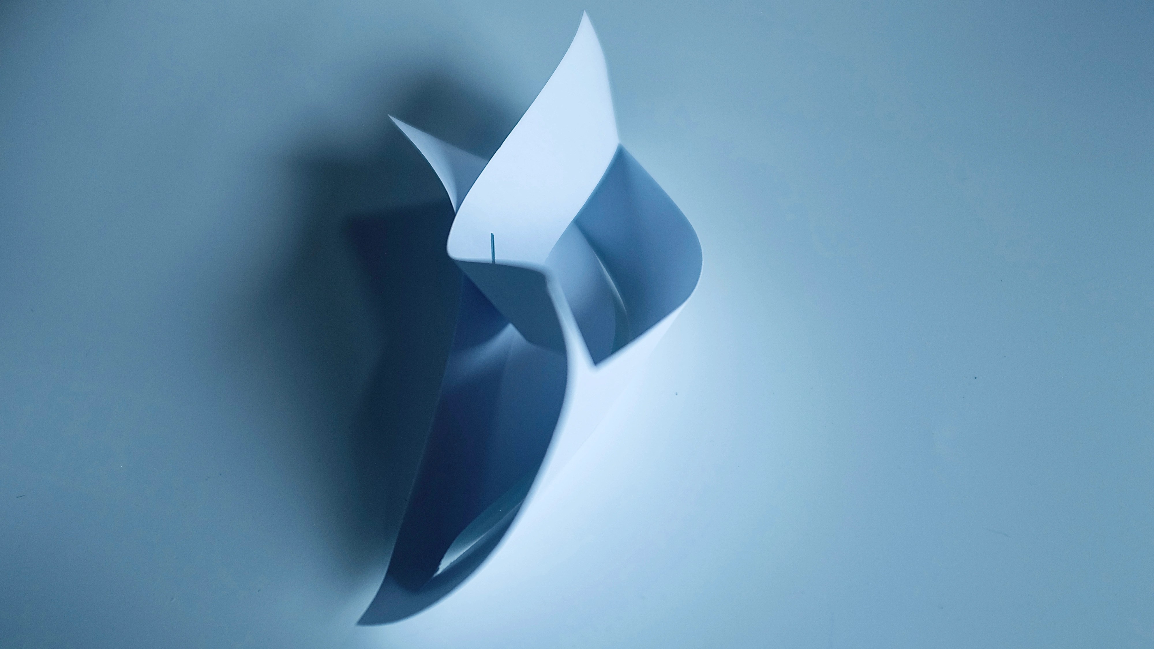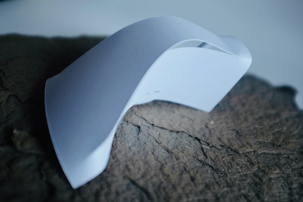 “I found that so many of Vasarely’s illusionary images read to me as warped planes of bulging structures. Foundations of worlds that boasted buildings stuck in a wonderland-like state of the uncanny. With this nugget of inspiration firmly lodged into place, I took to creating some warped forms of my own from heavy card stock, a crafting knife, and a ferociously reliable stapler – hoping that the rippling forms would play into my search for pavilions constructed from illusion…”