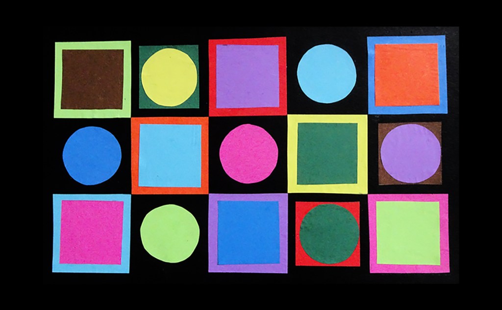 “Short on time this week, I just took a pack of small origami paper, cut the colors in it into circles and squares, and spent some time arranging and rearranging. Obviously, this is an exercise with infinite variation possibilities. I also revised a couple appropriate poems into pi poems—where the syllable count for each line is based on the sequence of numbers in pi.”