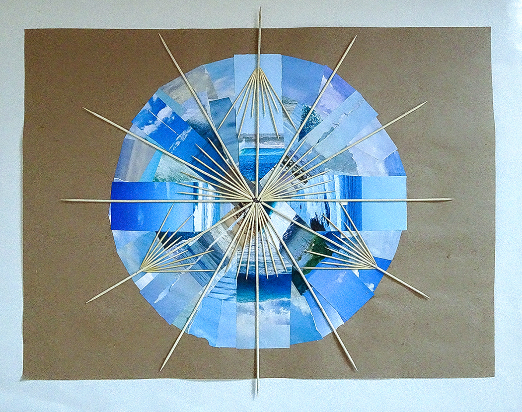 “I had a brief thought of building a toothpick sculpture… but luckily I quickly put that aside. It was difficult enough gluing toothpicks to paper. You know I always like a mandala, so that’s what I decided on as a form. I first made a collage ground of sky and sea because I loved that aspect of a lot of the videos–that it was an elemental creature. Then I started gluing wood skewers and toothpicks in an attempt to emulate some of the forms of the beests. Last I used wax paper to provide a feeling of some of the cloth coverings. If only I could figure out a way to make it turn…“